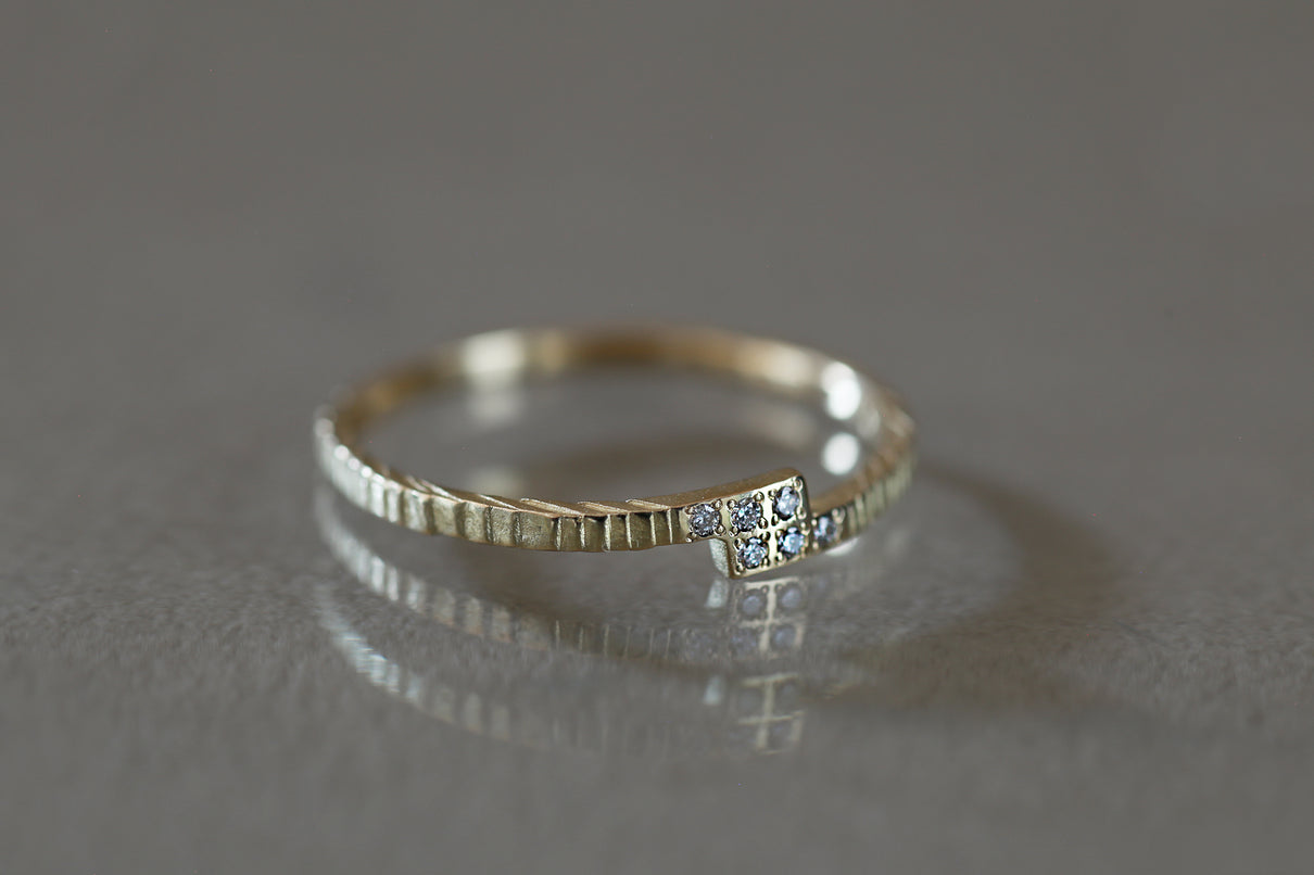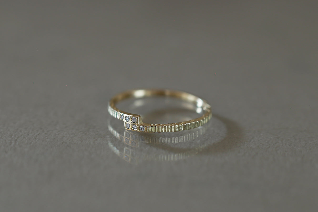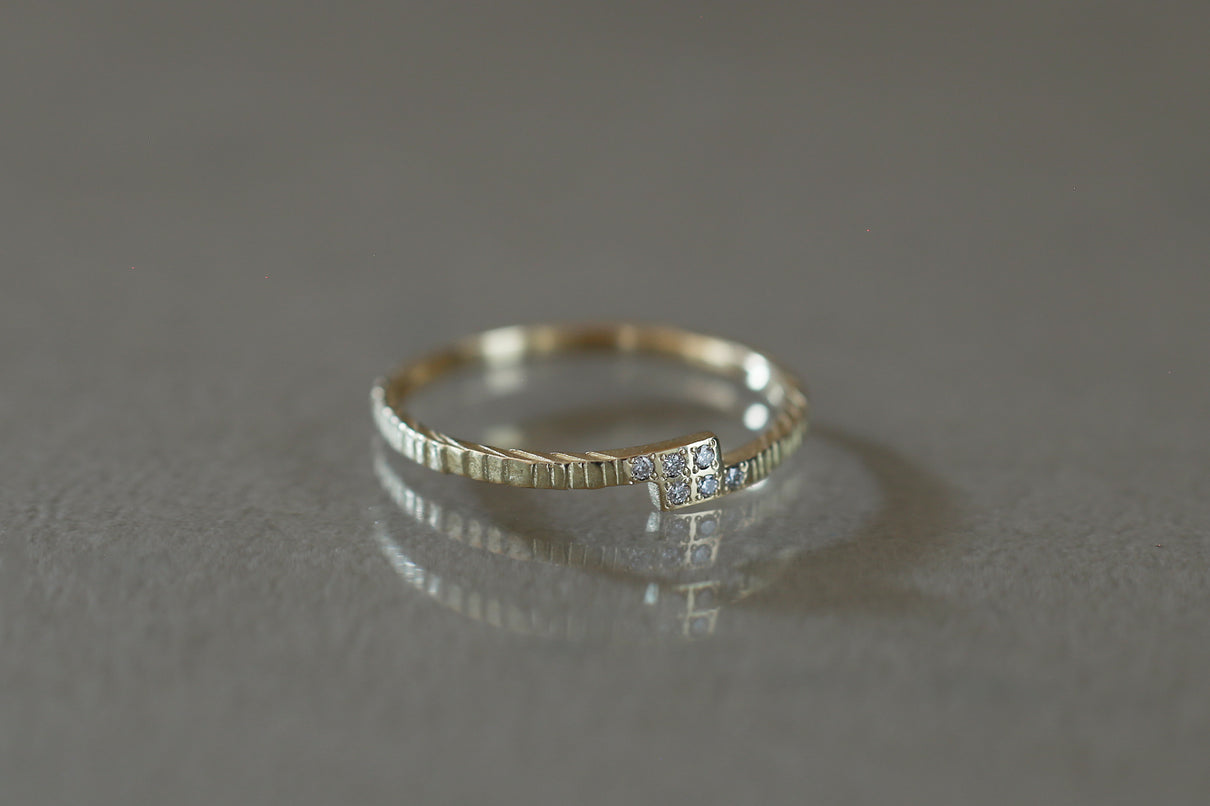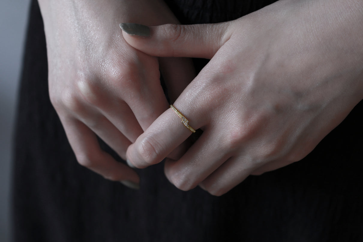 "立ち止まり、目を向ければ 大切なことは 変わらずいつもそこに在る ー" 2023 collection 「Unknown knowns」シリーズのリング。時間と経験の蓄積を軌跡のように表す、幾重もの層になったアシンメトリーなデザインのアーム部分にはきりりとした艶仕上げのアクセントを加え、その多角的な見え方をコンセプトに重ねました。中央には6石のメレダイヤモンドを留めており、繊細な煌めきで手元を華やぎます。シンプルで重ね付けにも活躍する軽やかな印象のゴールドリングです。