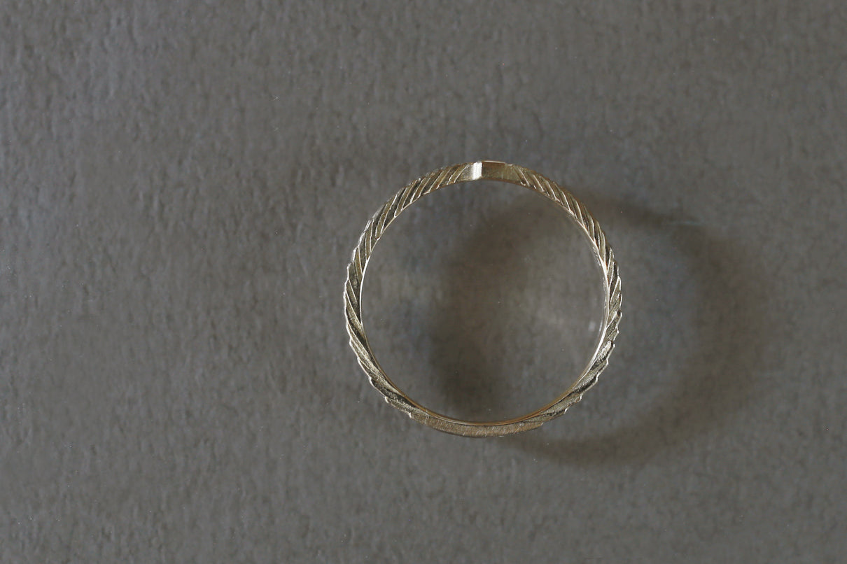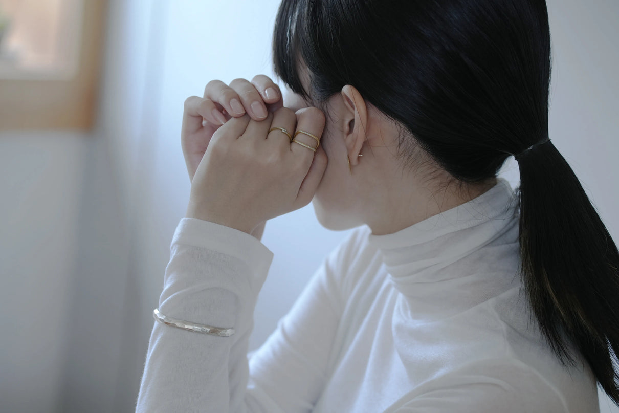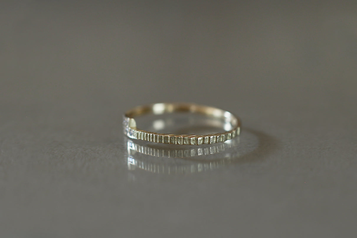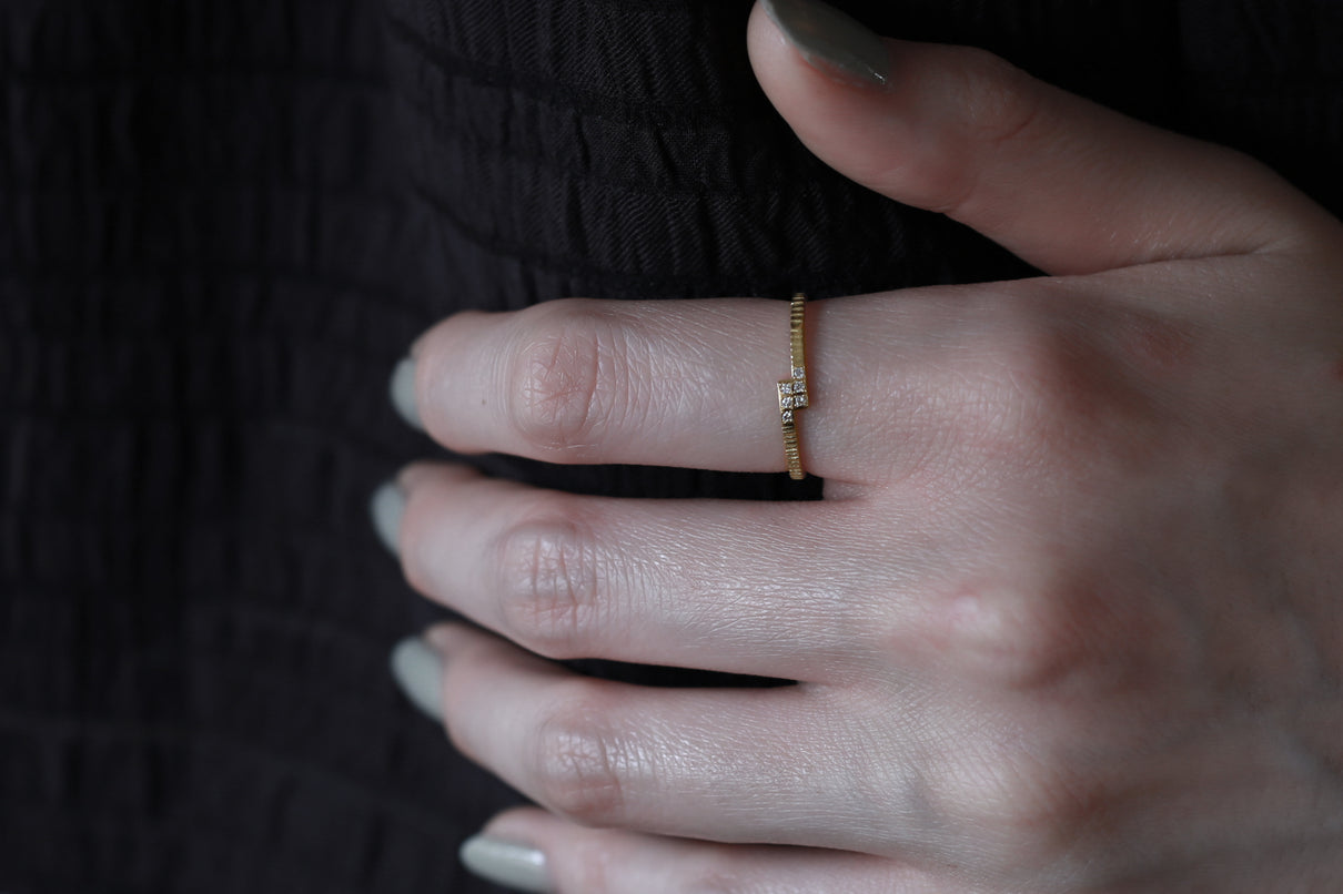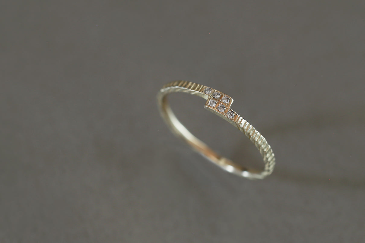 "立ち止まり、目を向ければ 大切なことは 変わらずいつもそこに在る ー" 2023 collection 「Unknown knowns」シリーズのリング。時間と経験の蓄積を軌跡のように表す、幾重もの層になったアシンメトリーなデザインのアーム部分にはきりりとした艶仕上げのアクセントを加え、その多角的な見え方をコンセプトに重ねました。中央には6石のメレダイヤモンドを留めており、繊細な煌めきで手元を華やぎます。シンプルで重ね付けにも活躍する軽やかな印象のゴールドリングです。
