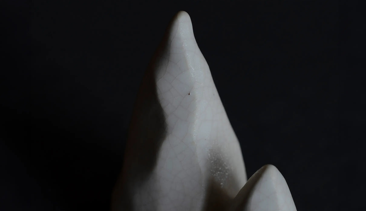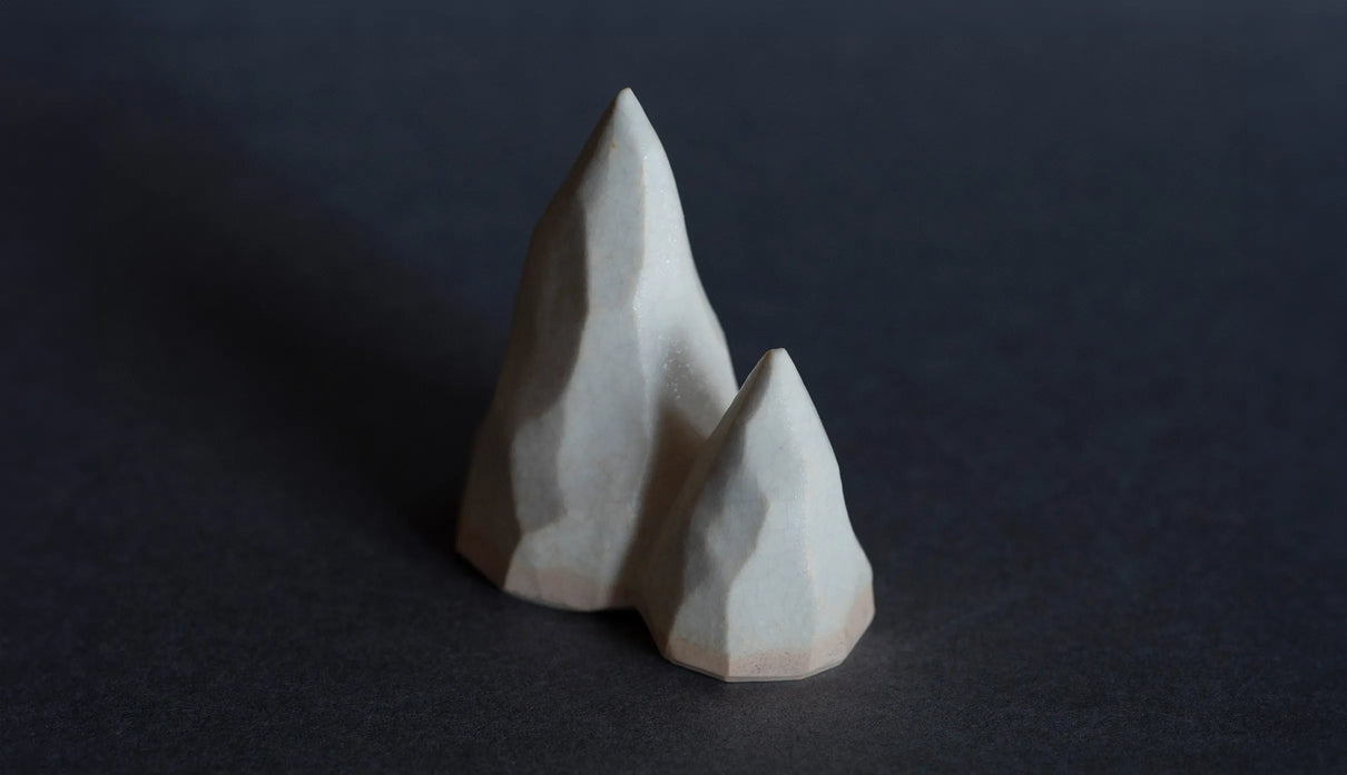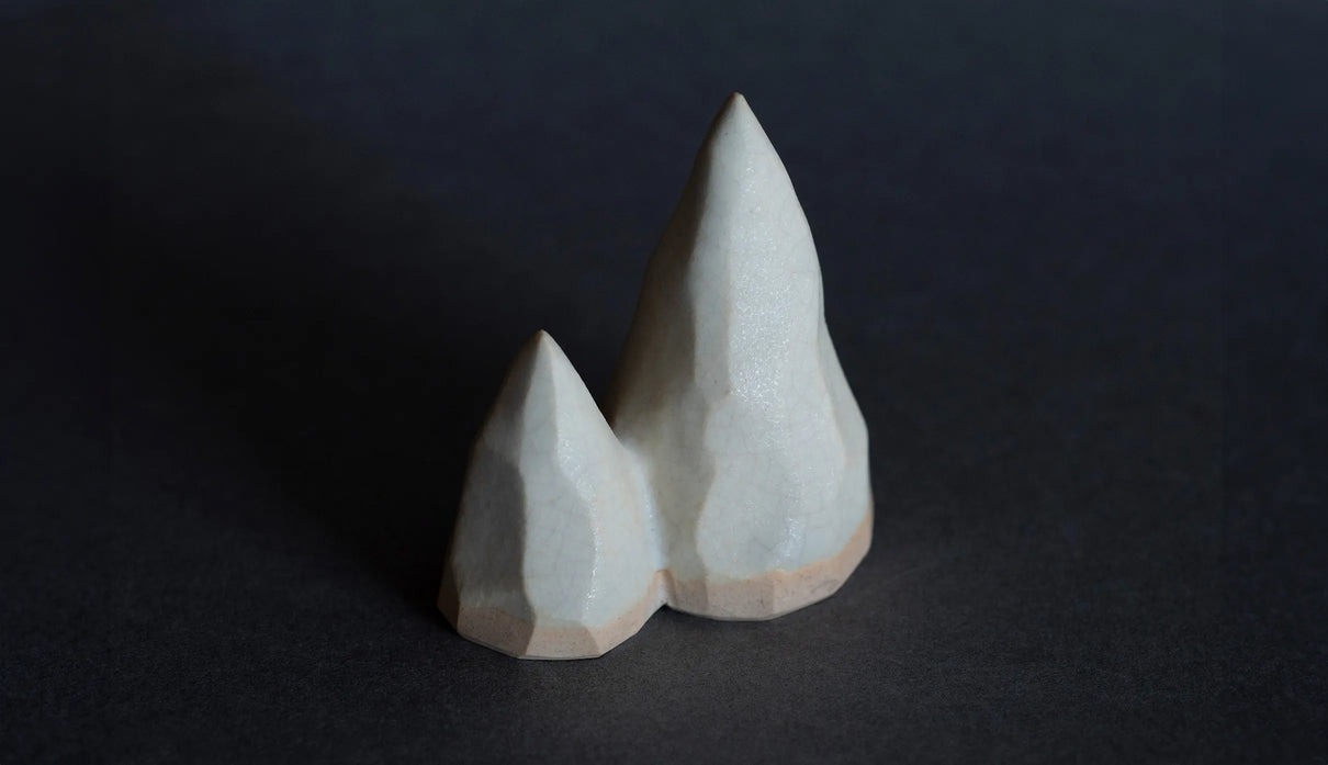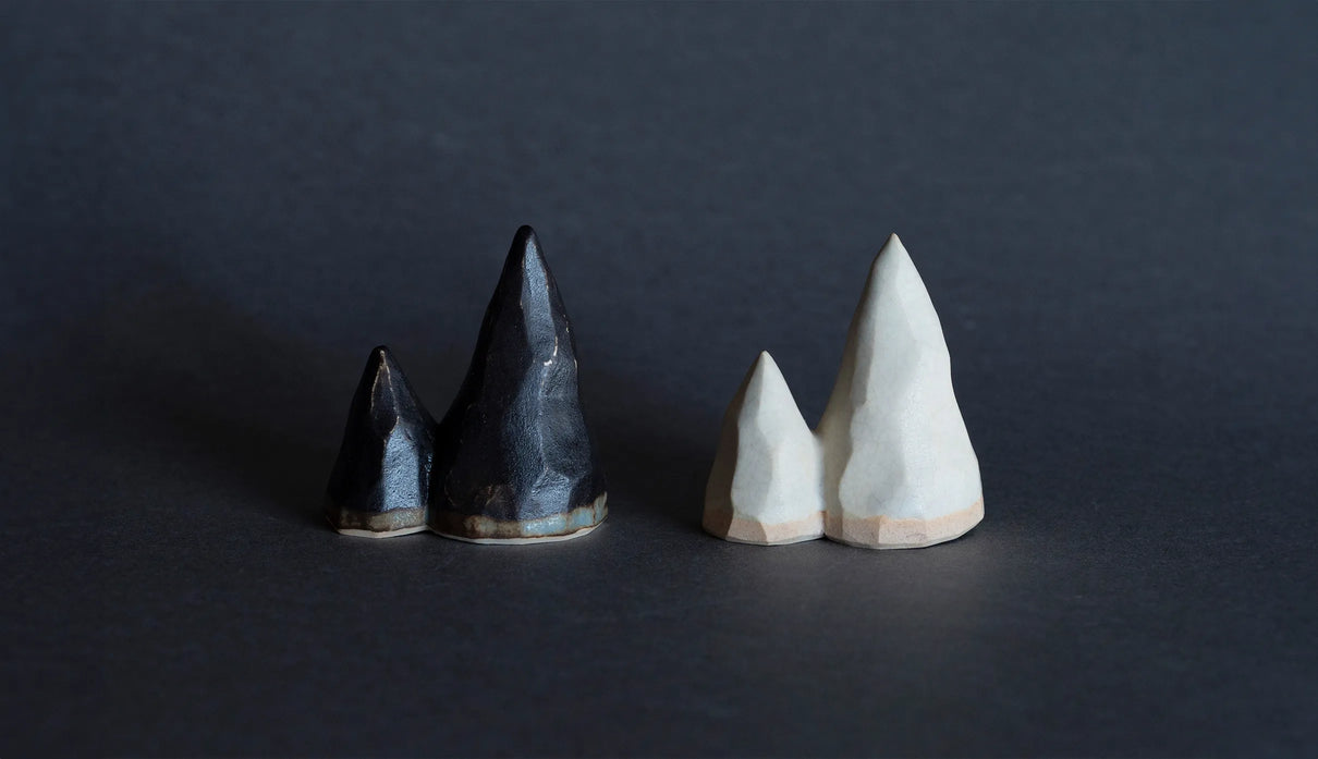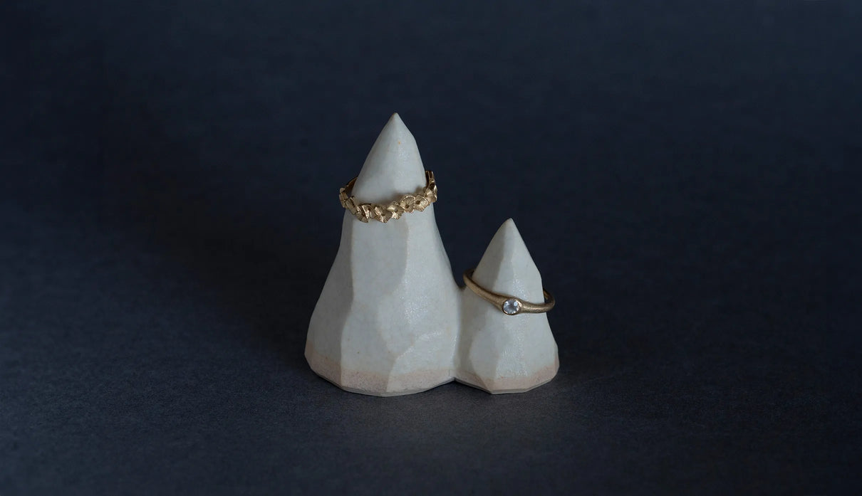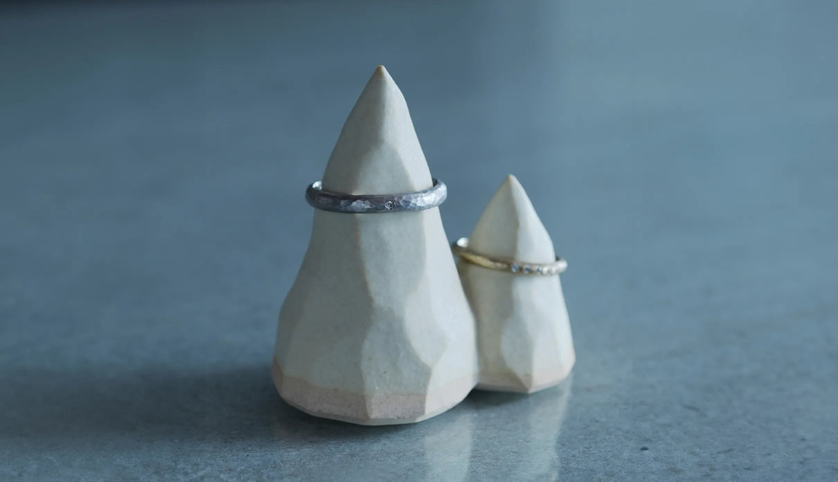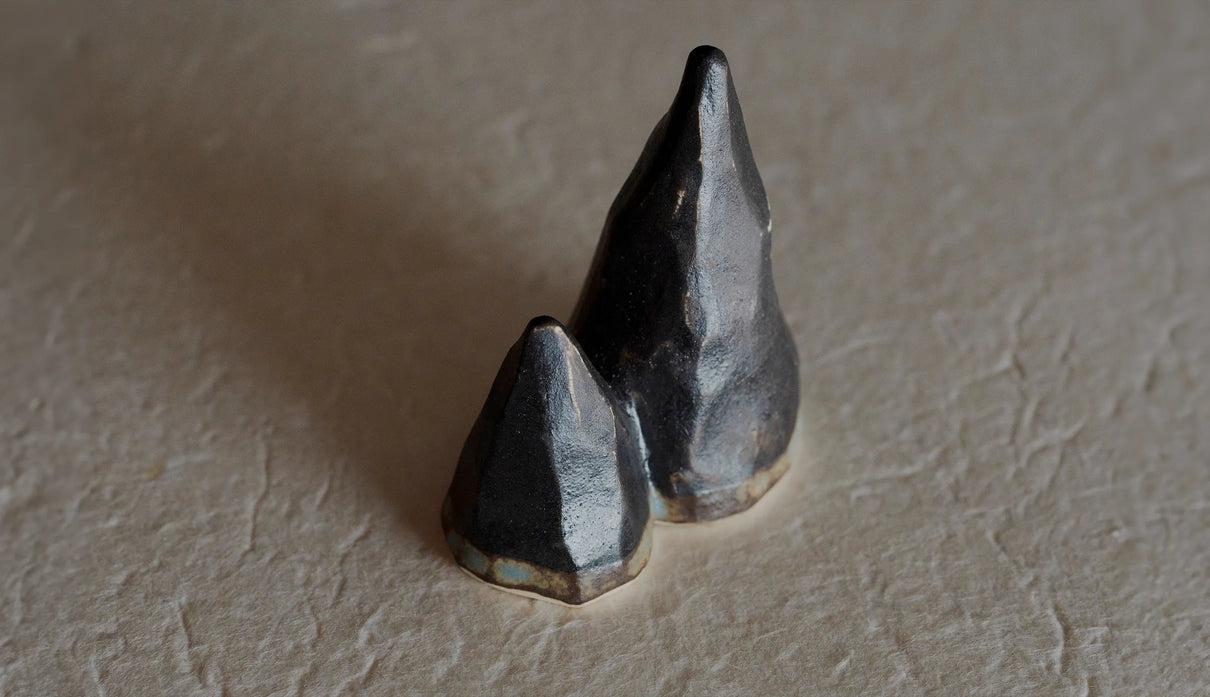 遠くの山並みを切り取ったような、小さなふたこぶ山のリング立て。手作業でざくざくと削り出した山肌が豊かな表情を見せ、静かな存在感で暮らしの中にさりげなくなじみます。貫入白は、やわらかなオフホワイトに細やかな貫入を施し、近くで眺めるとひとつひとつ違う景色が広がる楽しさも。炭黒は、ほんのり透け感のあるニュアンスブラック。切り替え部分に自然な釉薬のにじみがあらわれ、陶ならではの奥行きを感じさせます。普段よく使うリングの定位置に、またペアリングを並べて置くにもおすすめ。小さなオブジェとして家の中でお楽しみいただけます。