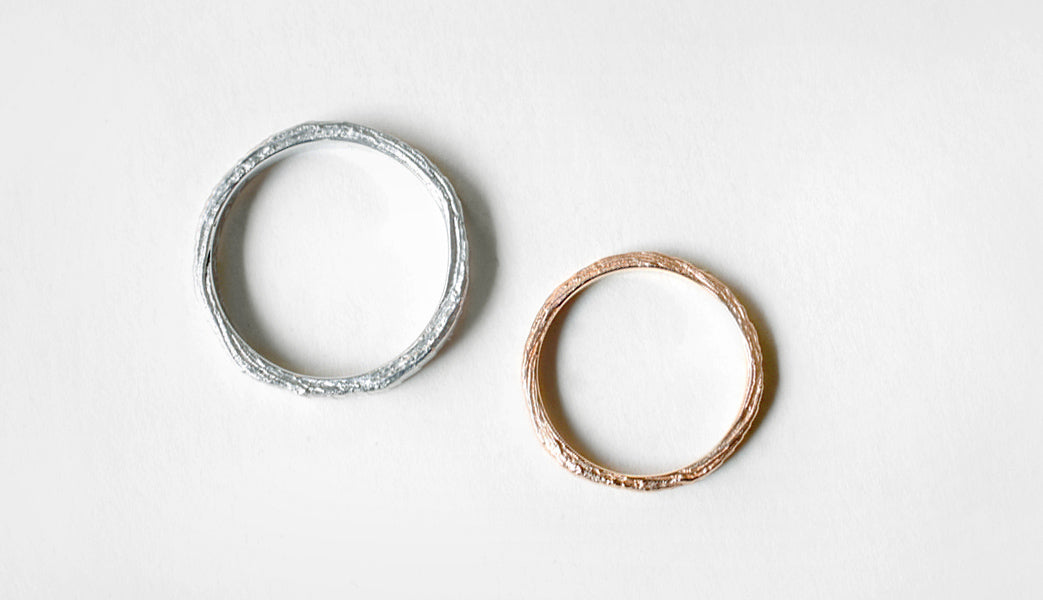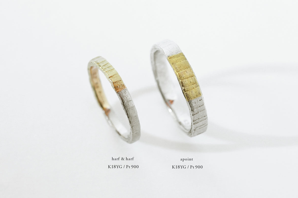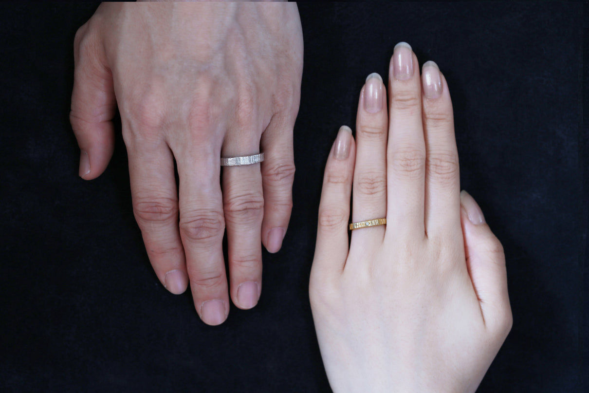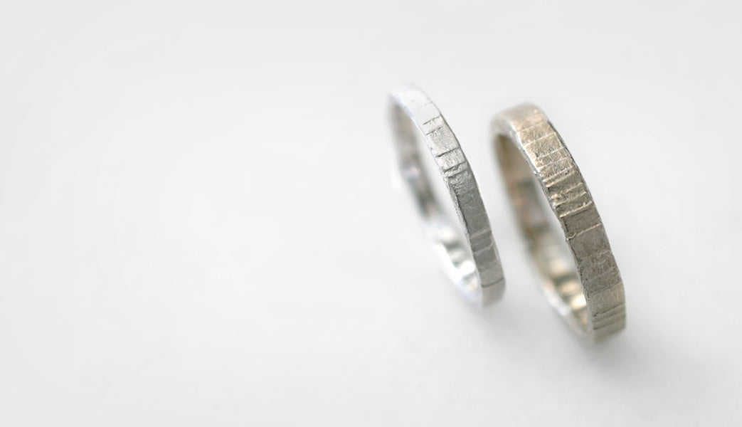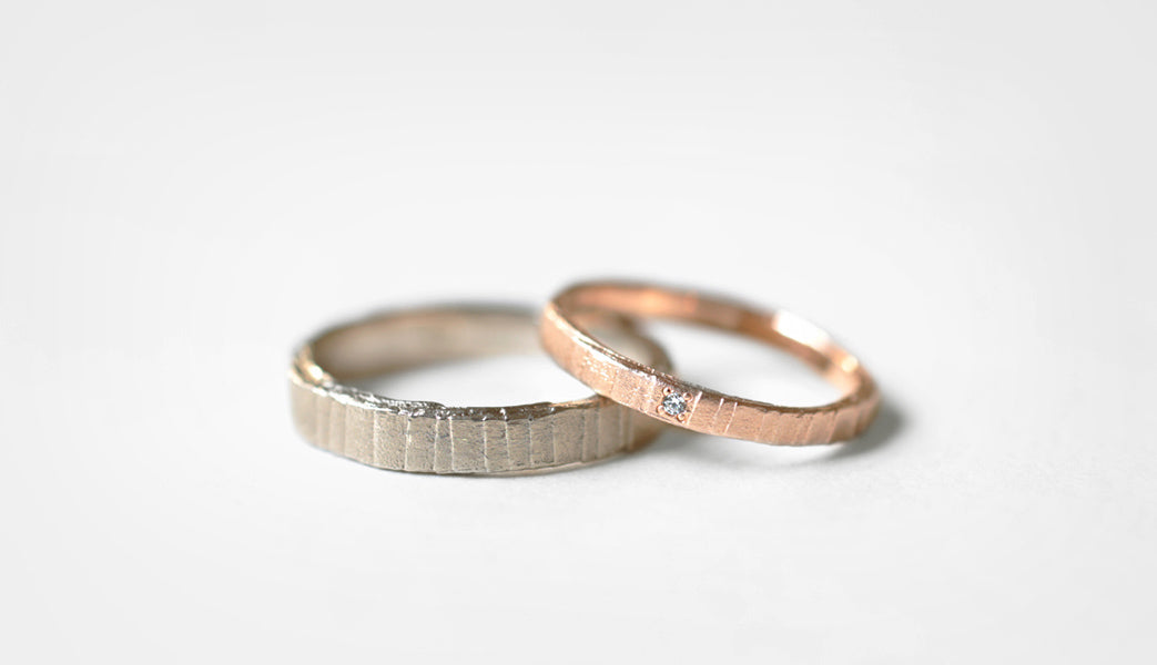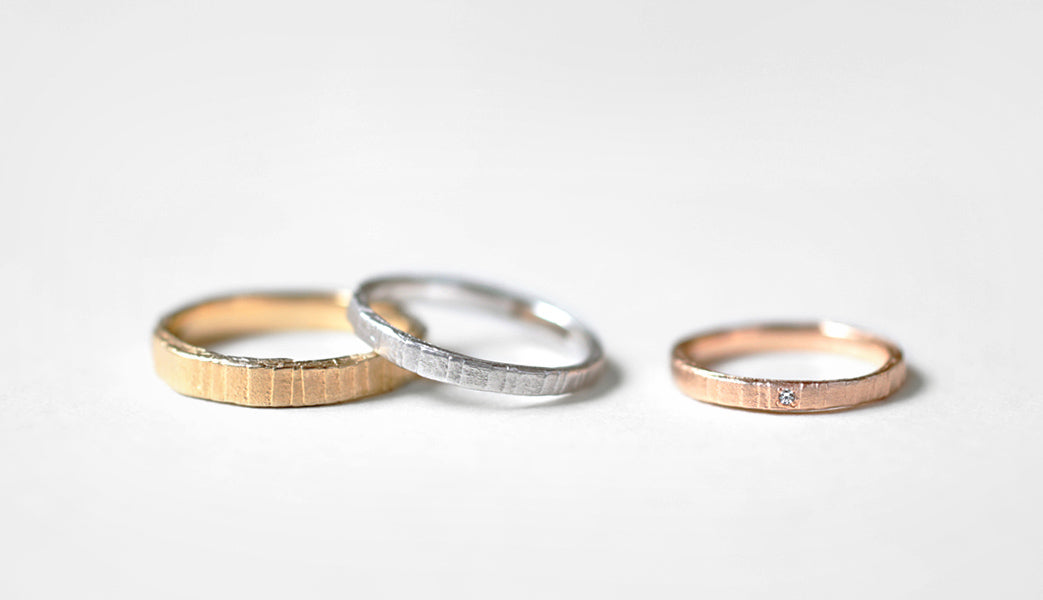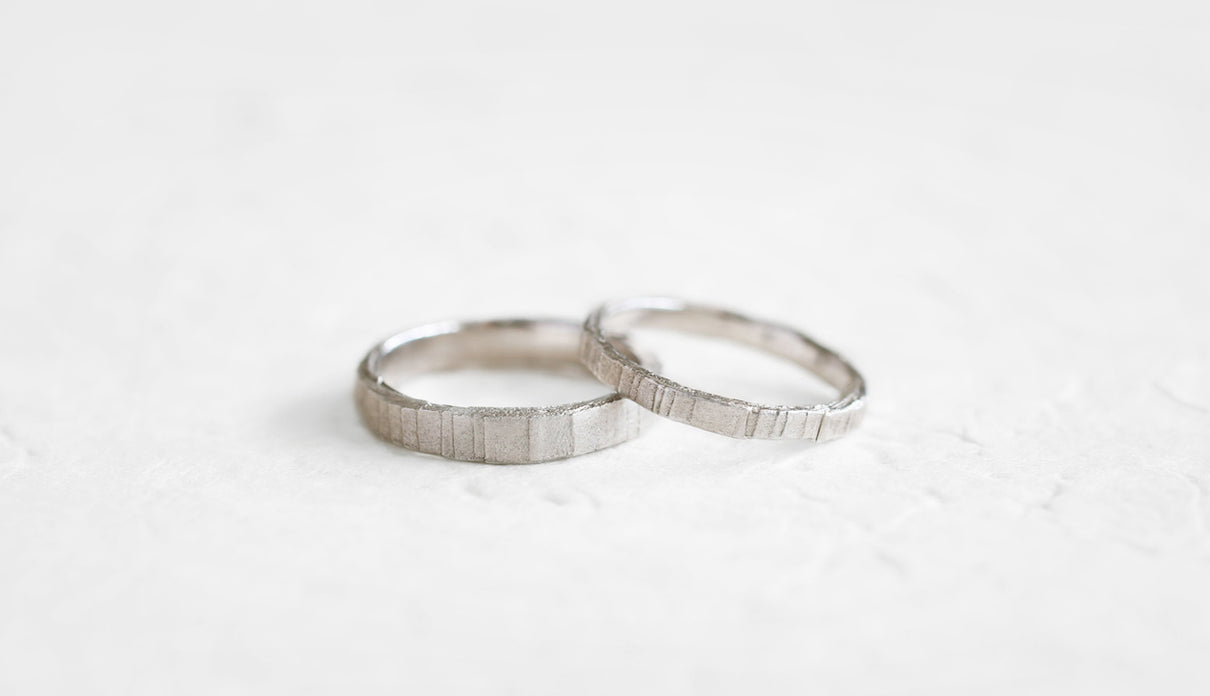 Eon ( イエン ) 時の重なりをイメージした、幾重にもなる層から作られたマリッジリング ( 結婚指輪 ) 。一見シンプルながら、よく見ると穏やかで複雑な表情が、ずっと眺めていたくなるような奥行きのある質感をつくり出します。