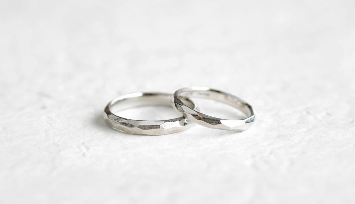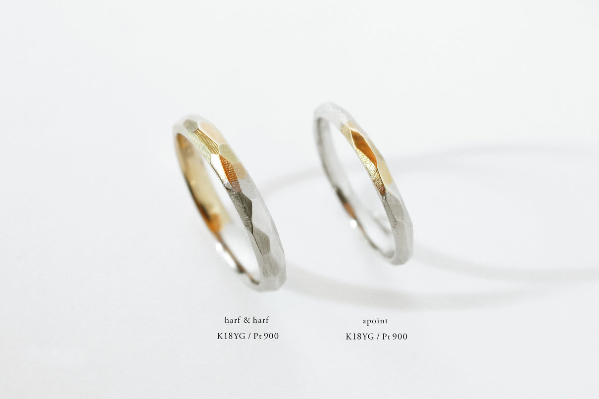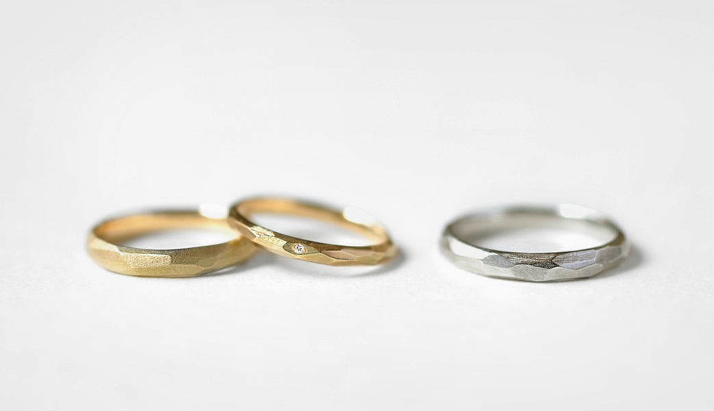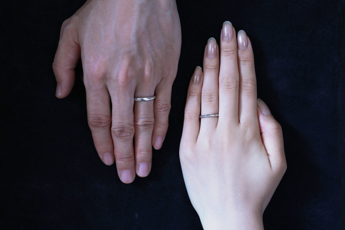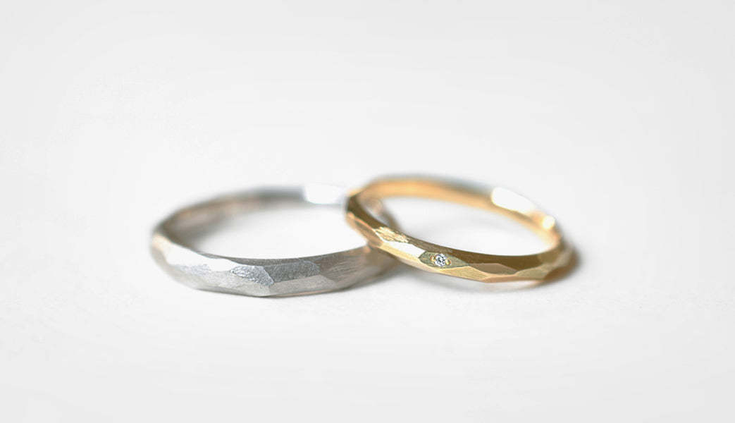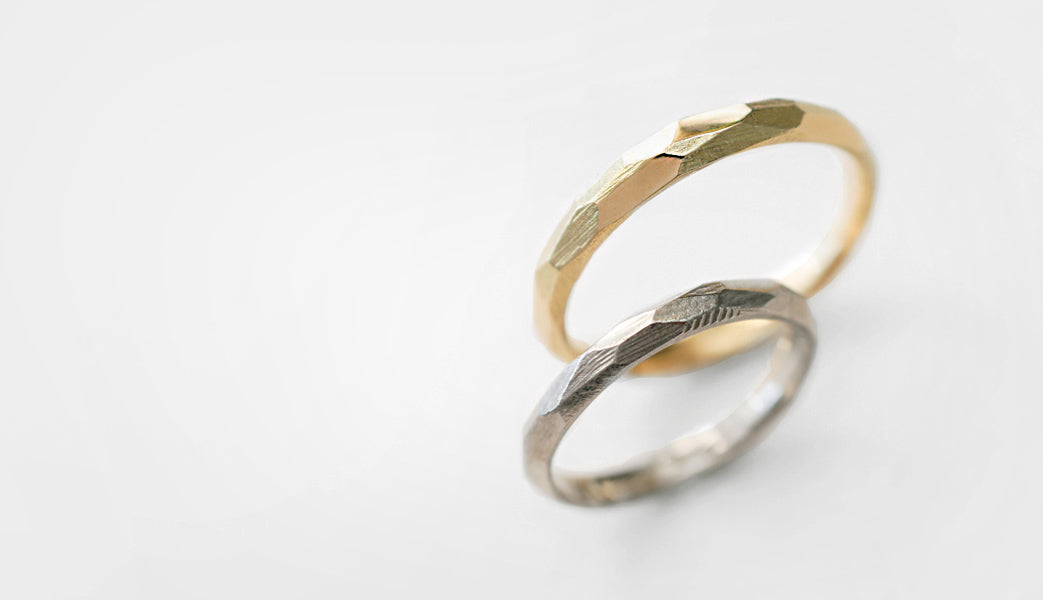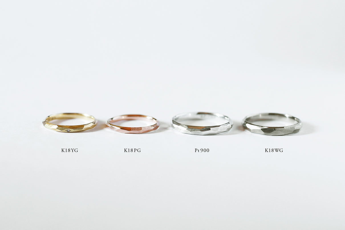 Rough cut ( ラフカット )塊から荒く削り出したようなつや消し面の中に、ランダムに配された光沢面が入り混じるマリッジリング ( 結婚指輪 ) 。 一つとして同じ形のない、幾つもの面と面が織りなす表情が洗練された美しさと凛とした印象を与えます。また「光沢面」と「つや消し面」の比率を変更するなど、お二人だけのこだわりをより際立たせることも可能です。