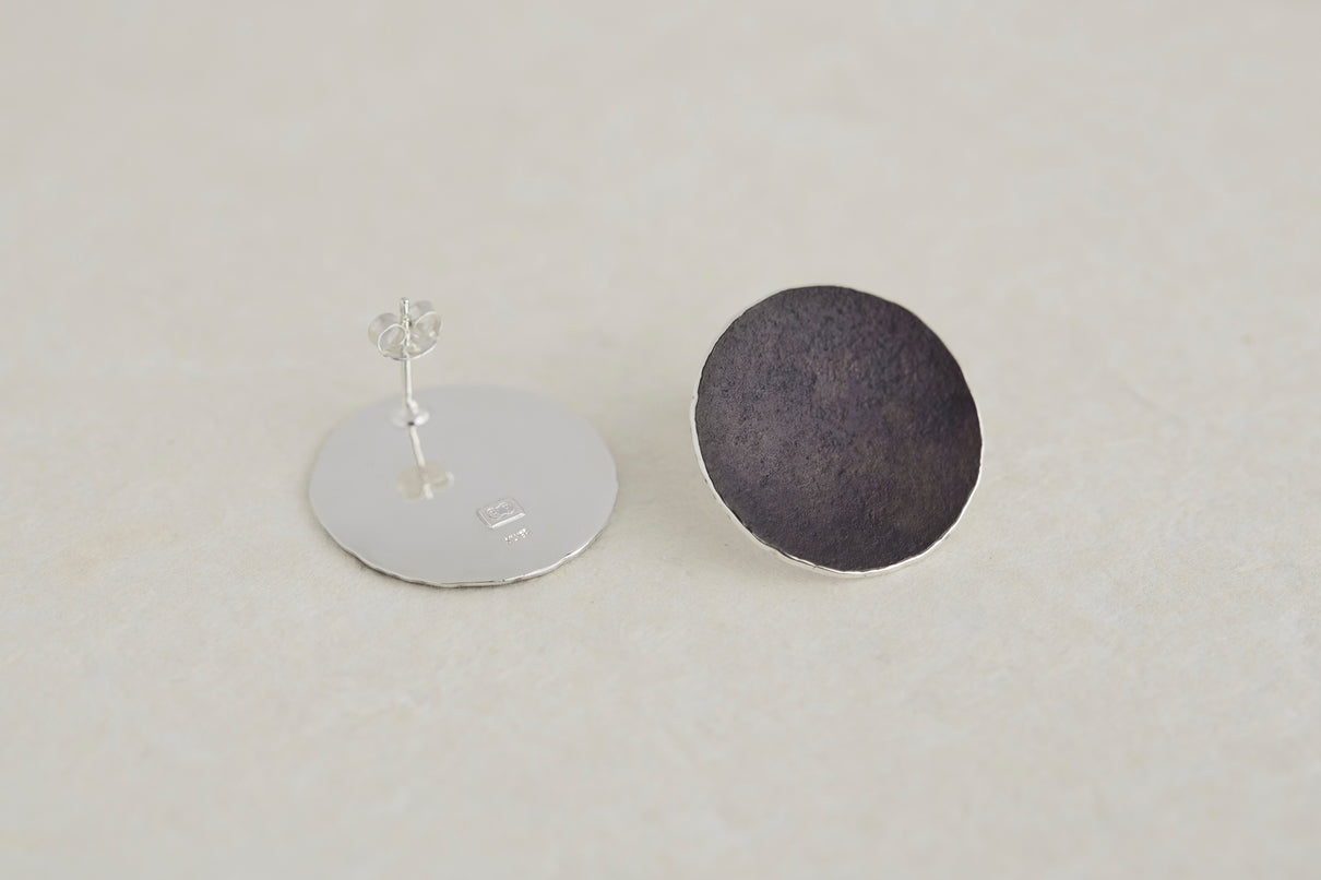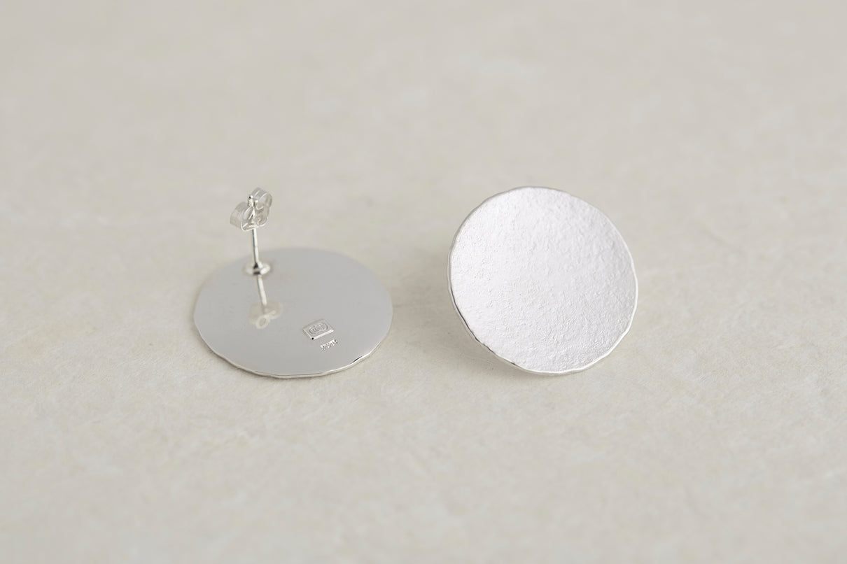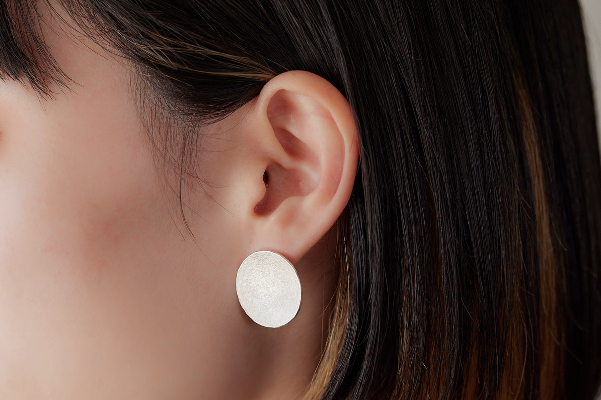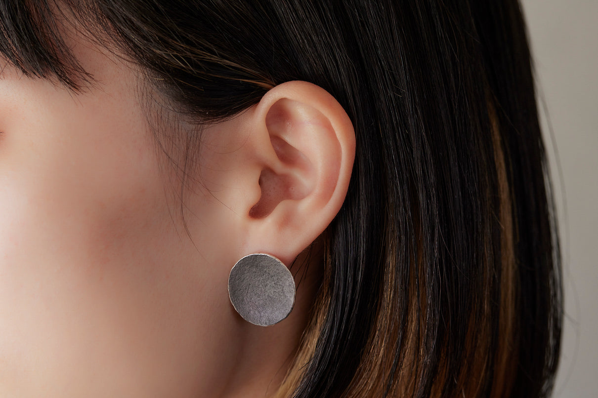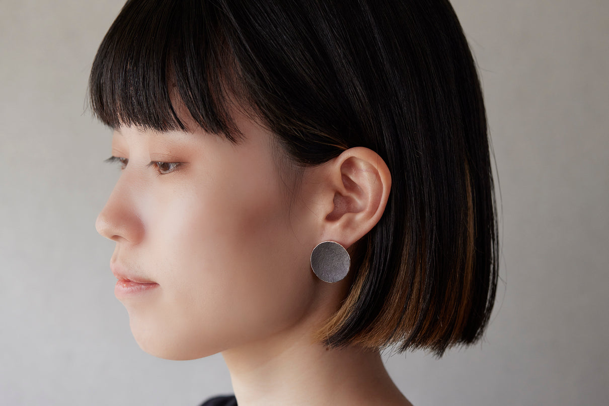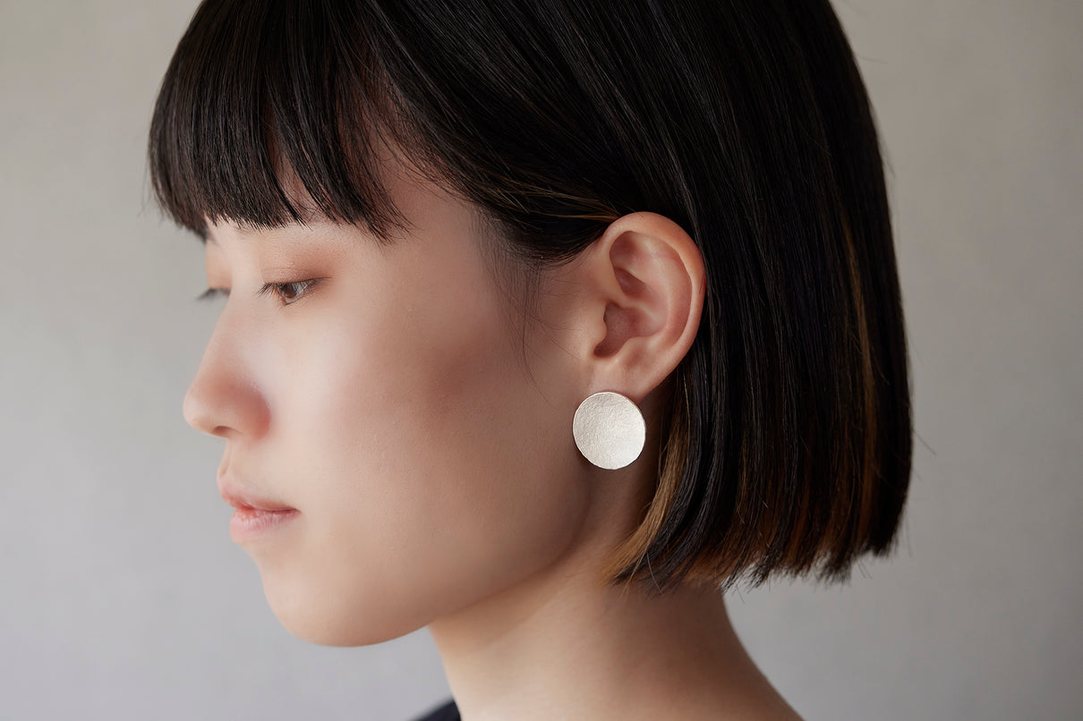 白く輝く「満月」とひっそりと影を潜めたような「新月」をイメージしたピアス。まるで月の乾いた表面のようなテクスチャーはシルバー特有の焼き色を残しながら仕上げ、その輪郭は光を受けてキラリと光るようになっています。またやさしい印象になるように、円の中心がわずかに凹む様にやわらかなカーブをつけました。装いに華やぎを添える、シンプルながら存在感のあるピアスです。