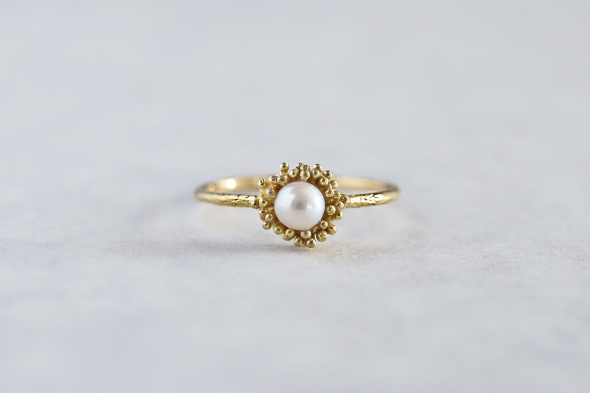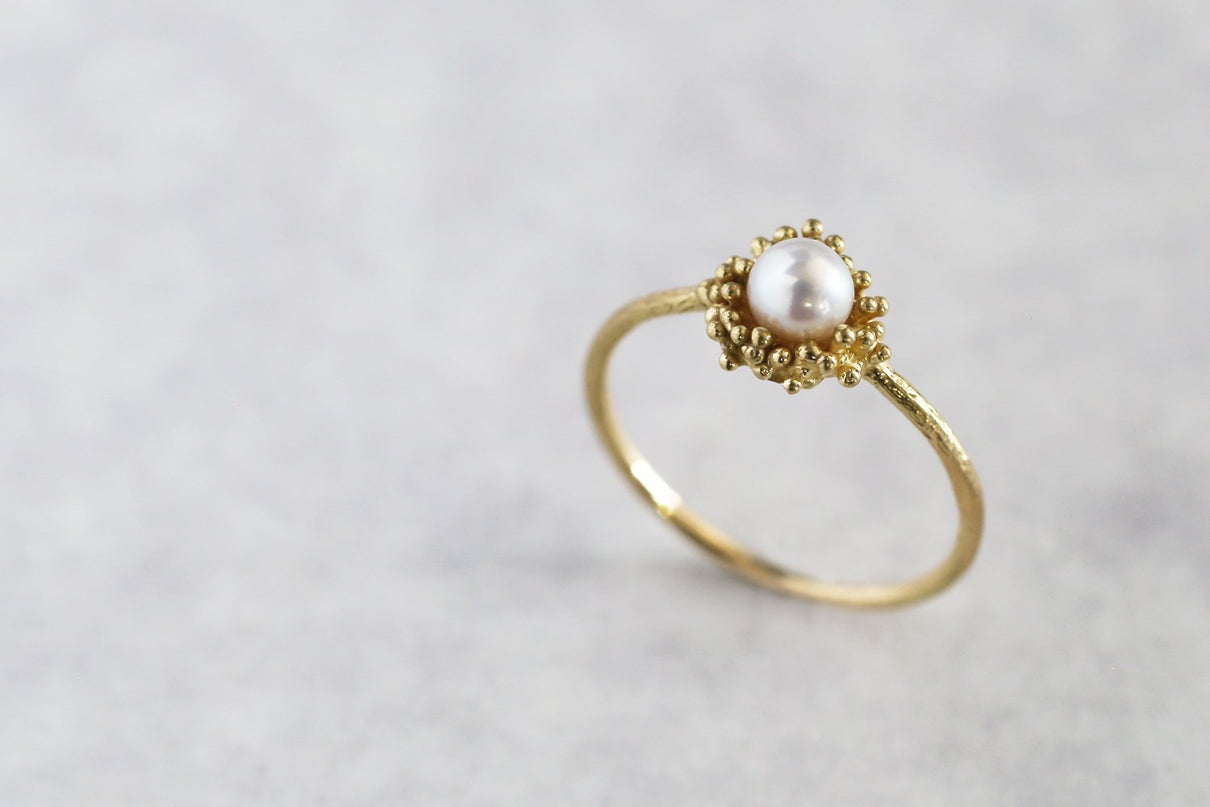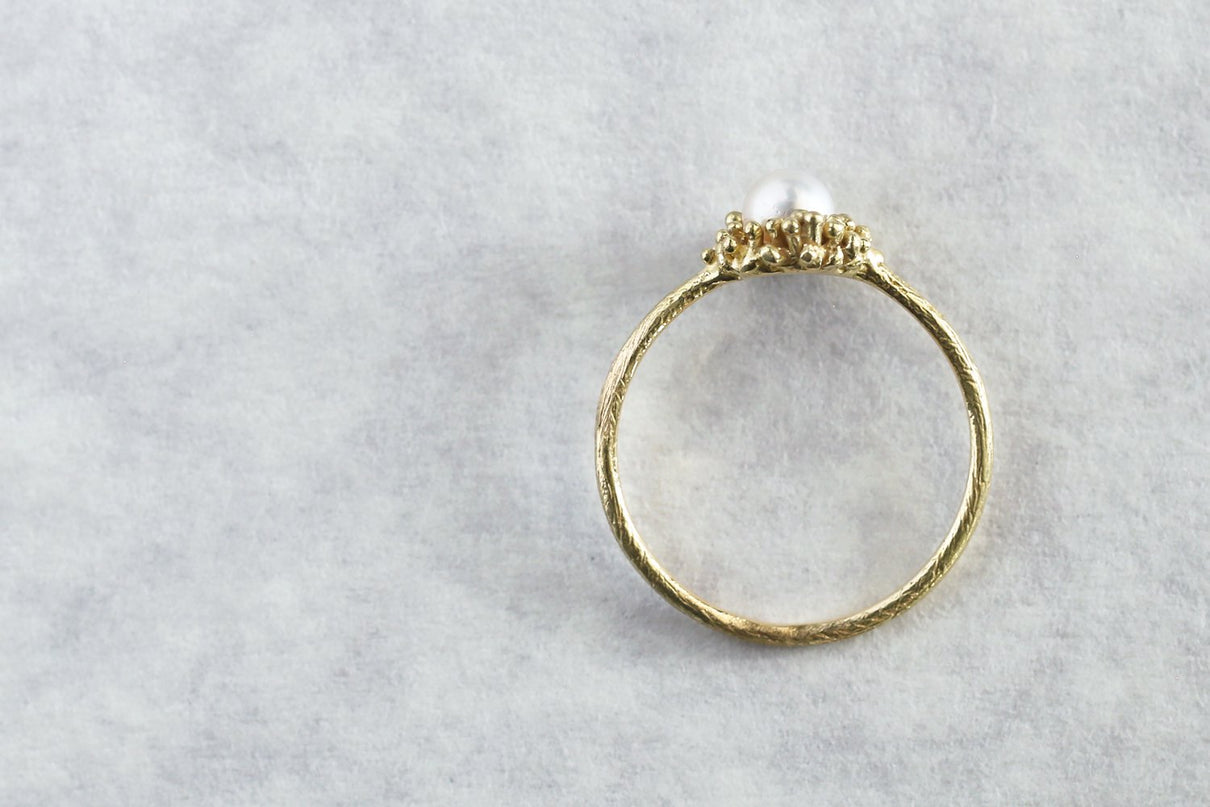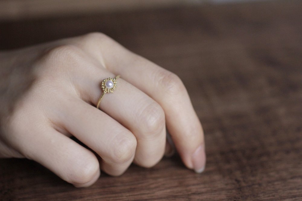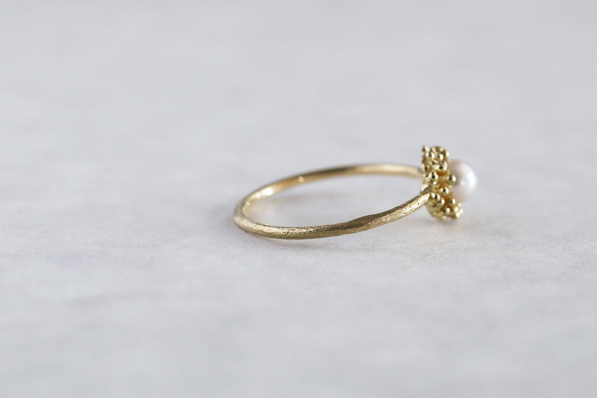 Tubu tubuのシリーズに、ちいさなパールが付いたリングを作りました。小ぶりで可愛らしい雰囲気でありつつ、程よい存在感と華やかさがあります。リング部分は小枝のような少し凹凸のある質感です。