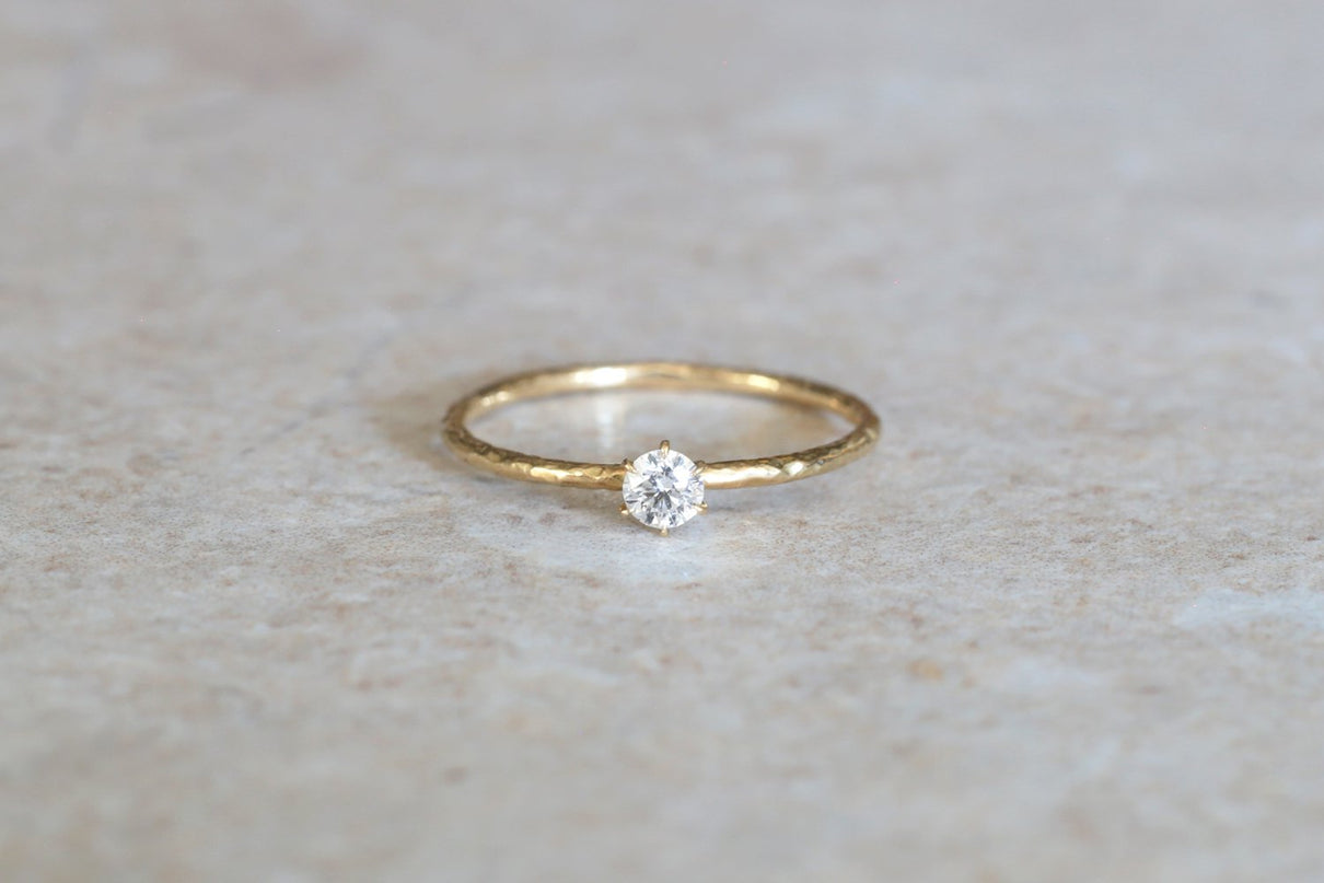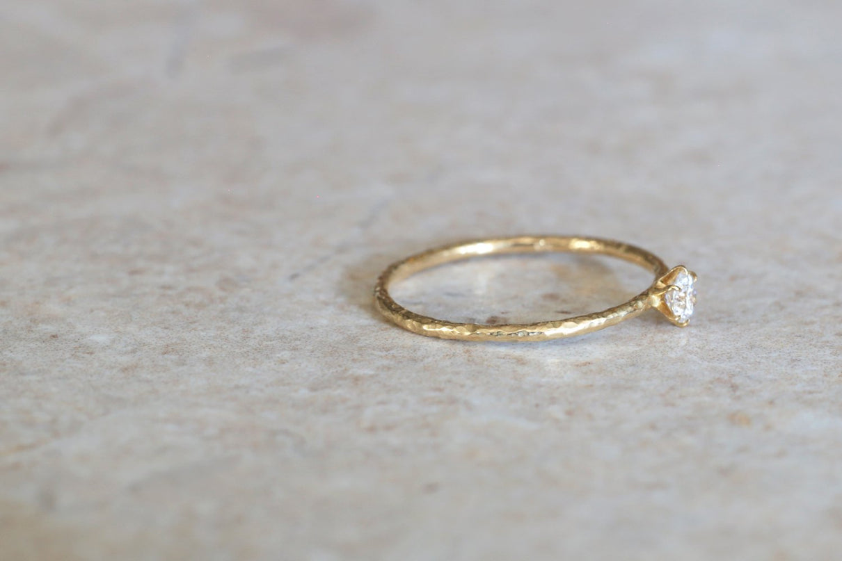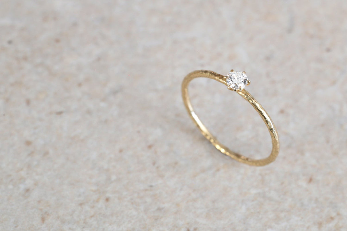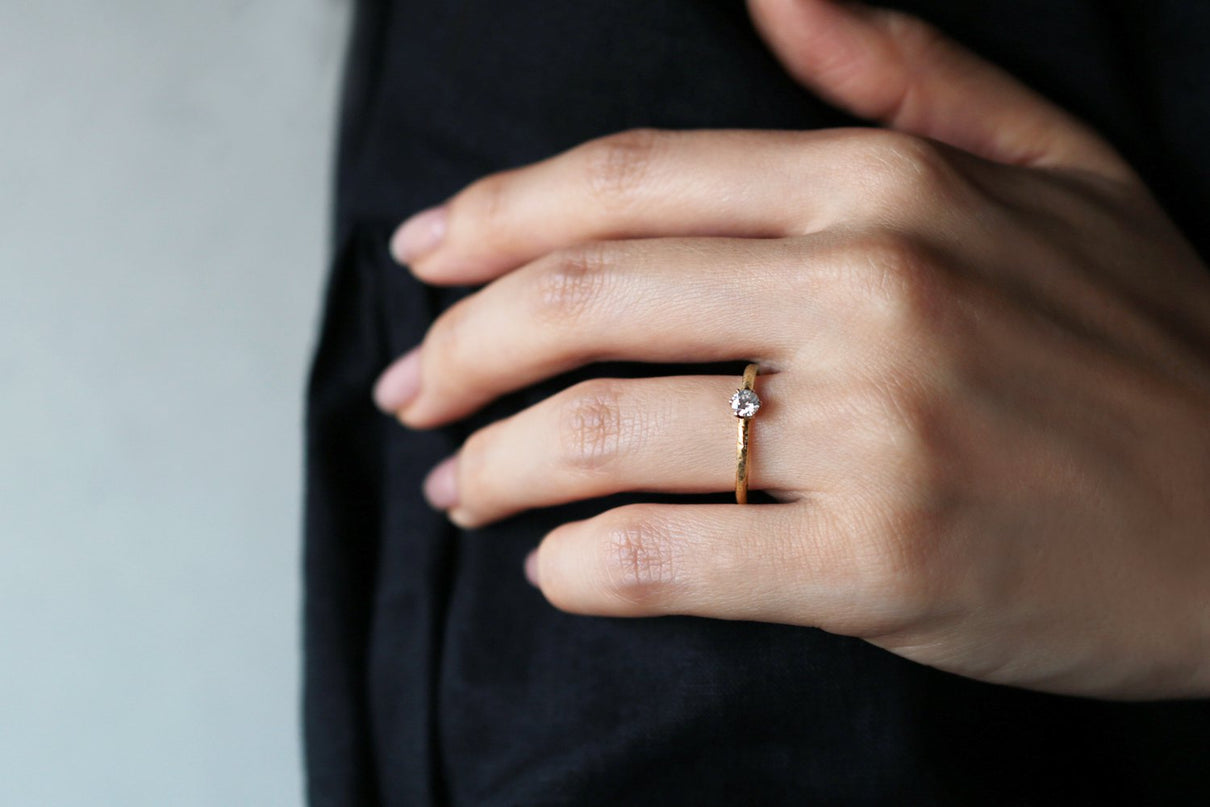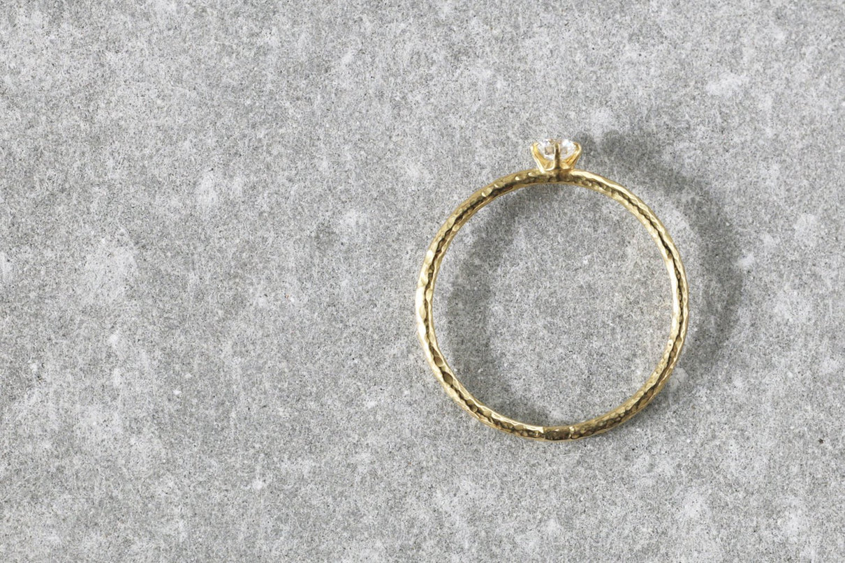 0.1カラットのダイヤモンドを留めたTwigリング。約1mm幅の華奢なリング部分には、温かみを感じる小枝のような表情をつけました。重ね付けにもぴったり。大切な方への贈り物にもおすすめです。