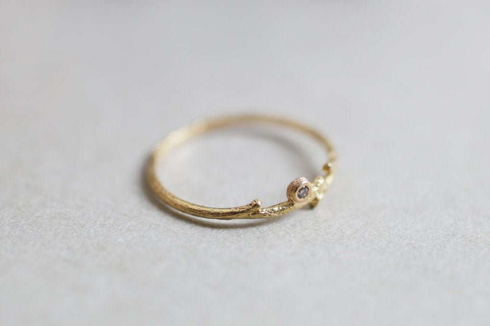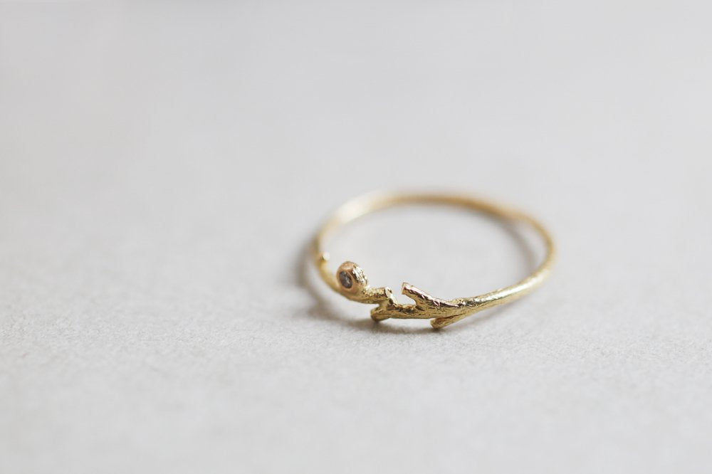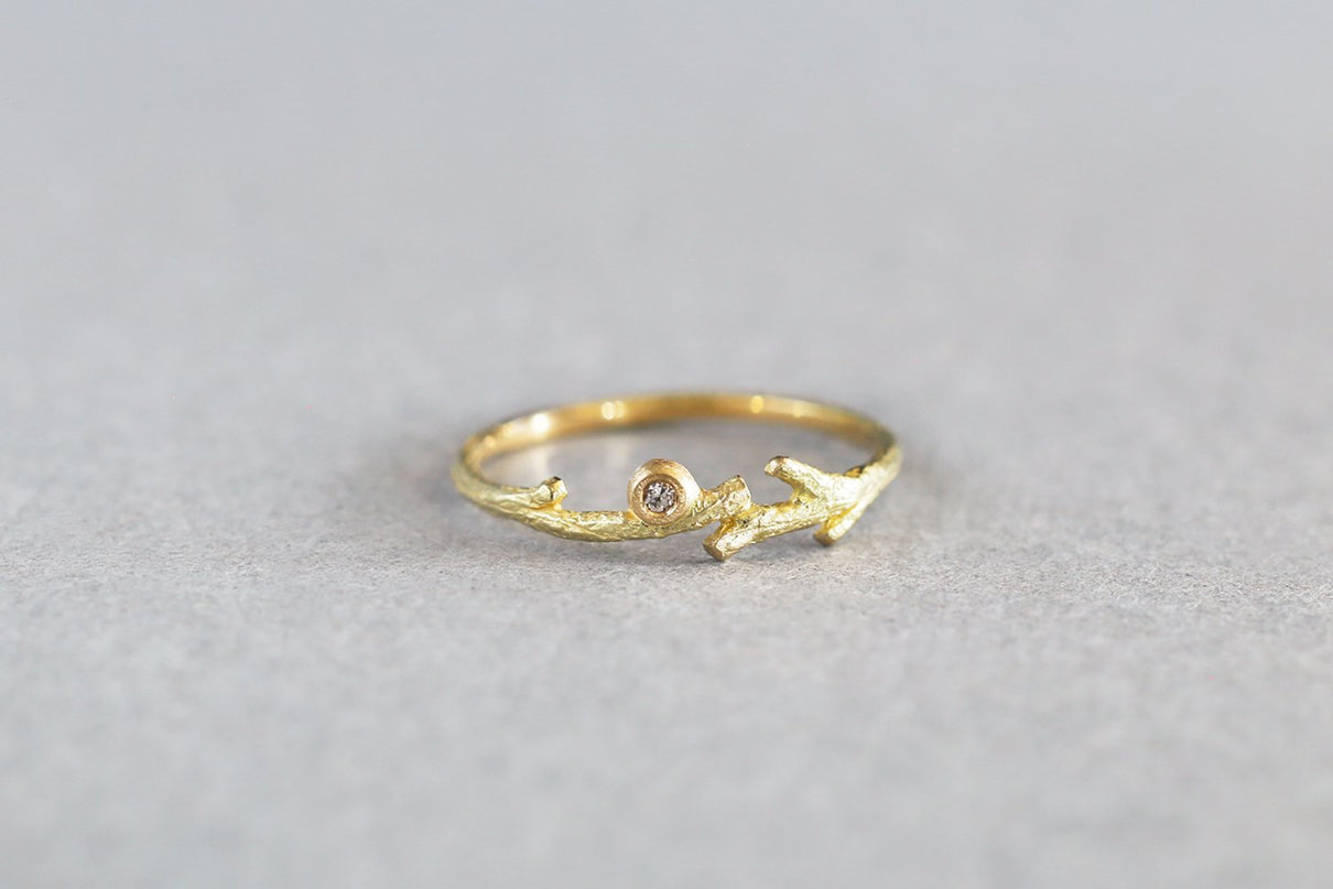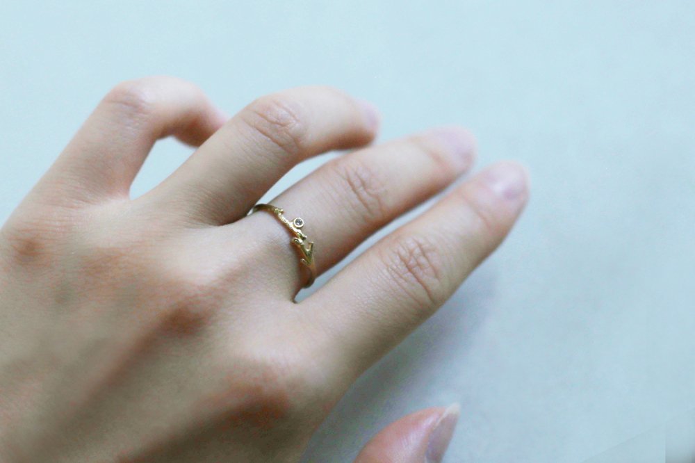 小枝にブラウンダイヤが光るリング。華奢な印象ながらも枝の表情にこだわりを感じさせ、さりげなく小粒のダイヤがちらちらと煌めき繊細な雰囲気を感じさせるアイテムです。※写真はK18YGですが、K18WGのお作りもございます。
