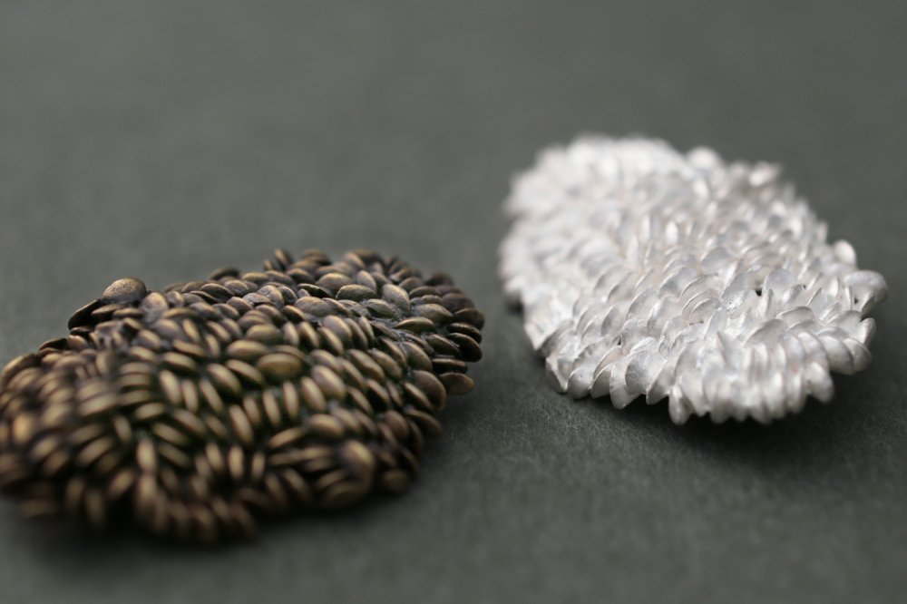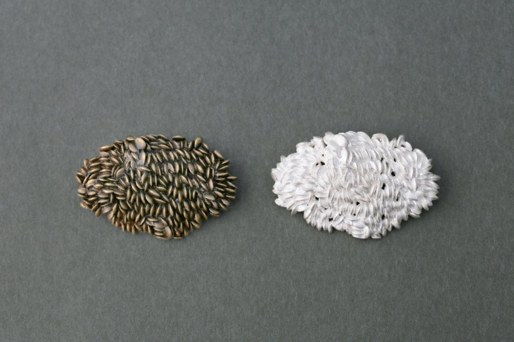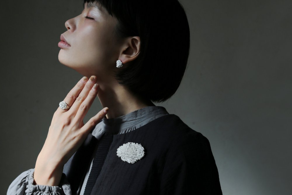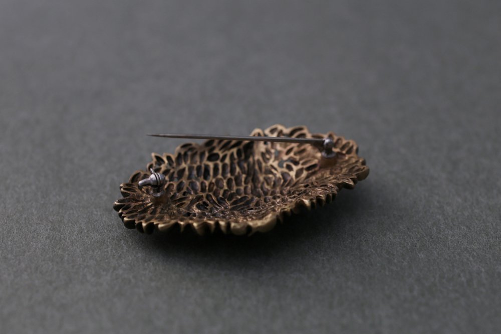 物の表情を顕微鏡でじっと覗き込んだとき。それをどこまでも追うように、どんどん拡大していくとずっと知っていたはずのものが魅せる思わず目を見張るほどの別世界をモチーフにしたブローチ。白くマットなテクスチャーで奥深い輝きを放つ"Silver"と落ち着いた雰囲気を醸し出す"Antique gold"。小さな円形がランダムにひしめき合いながら形づくる特徴的な楕円のフォルムはそれぞれ異なる印象で、いつもの装いに個性引き立つアクセントとなります。胸元だけではなく帽子やストールと合わせてお付け頂くのもお勧めです。