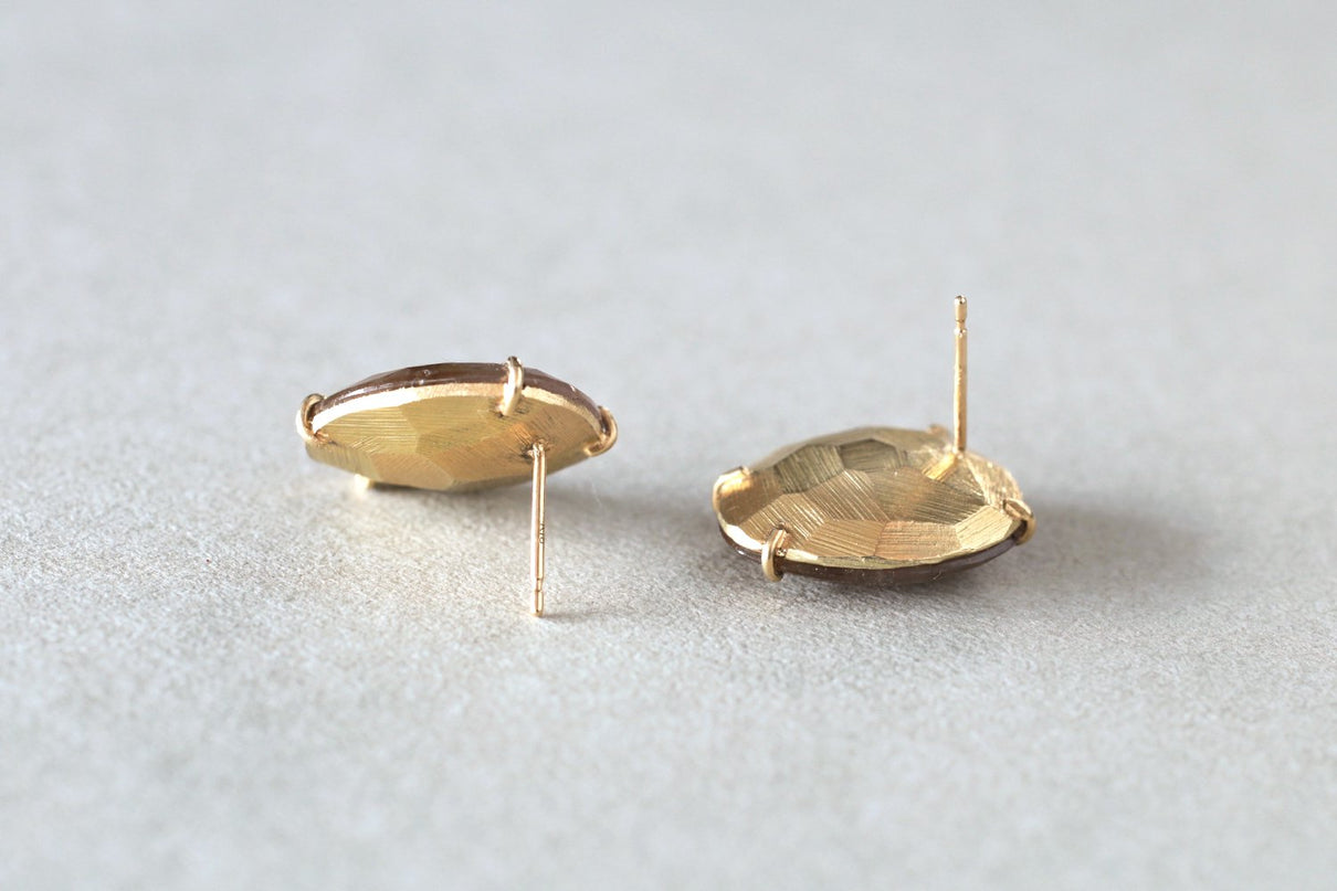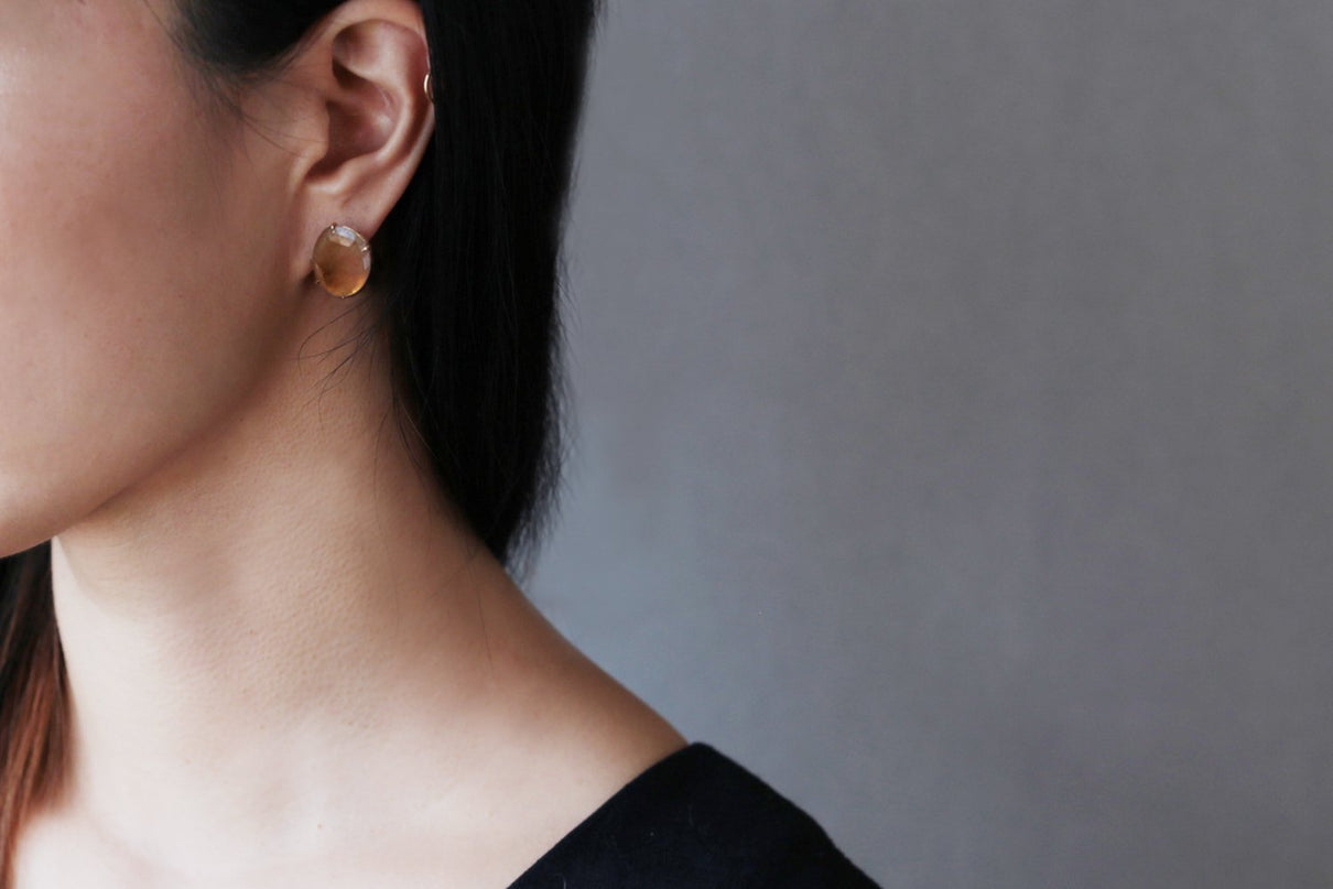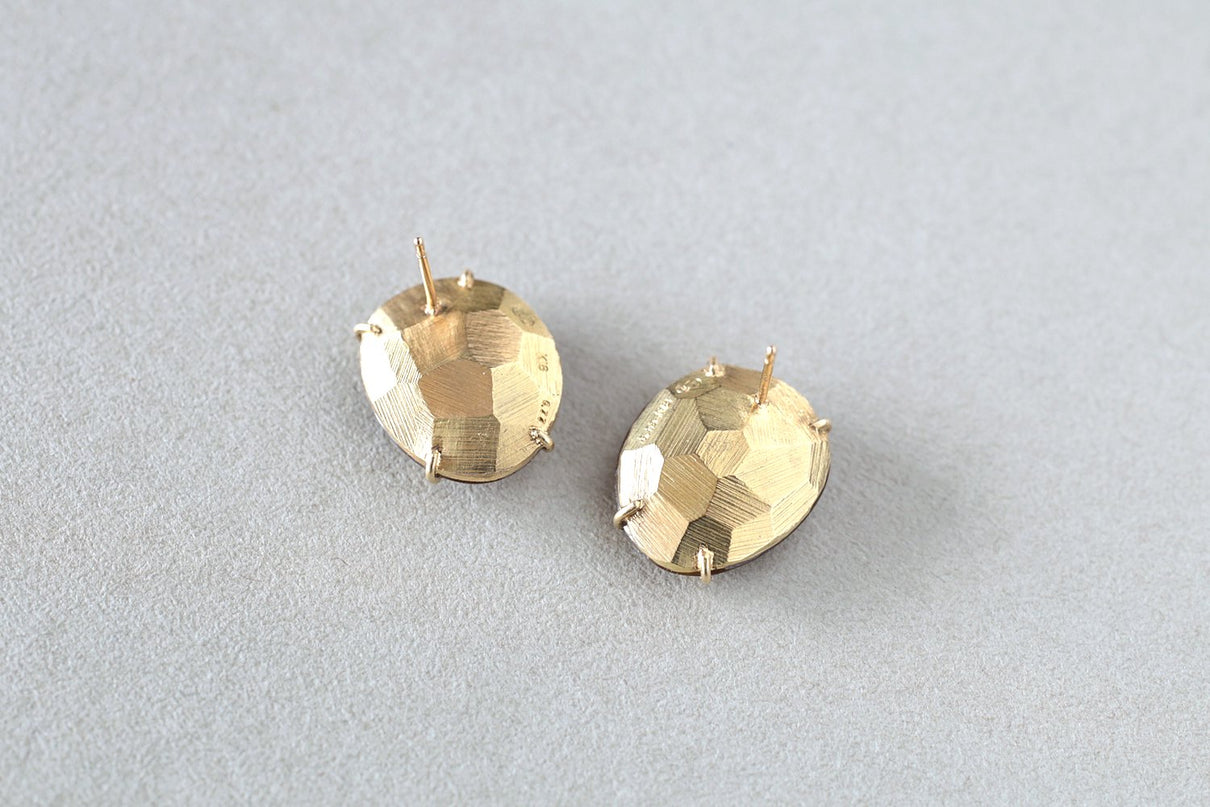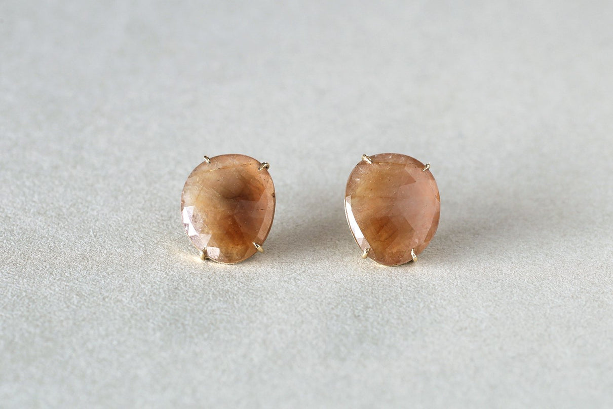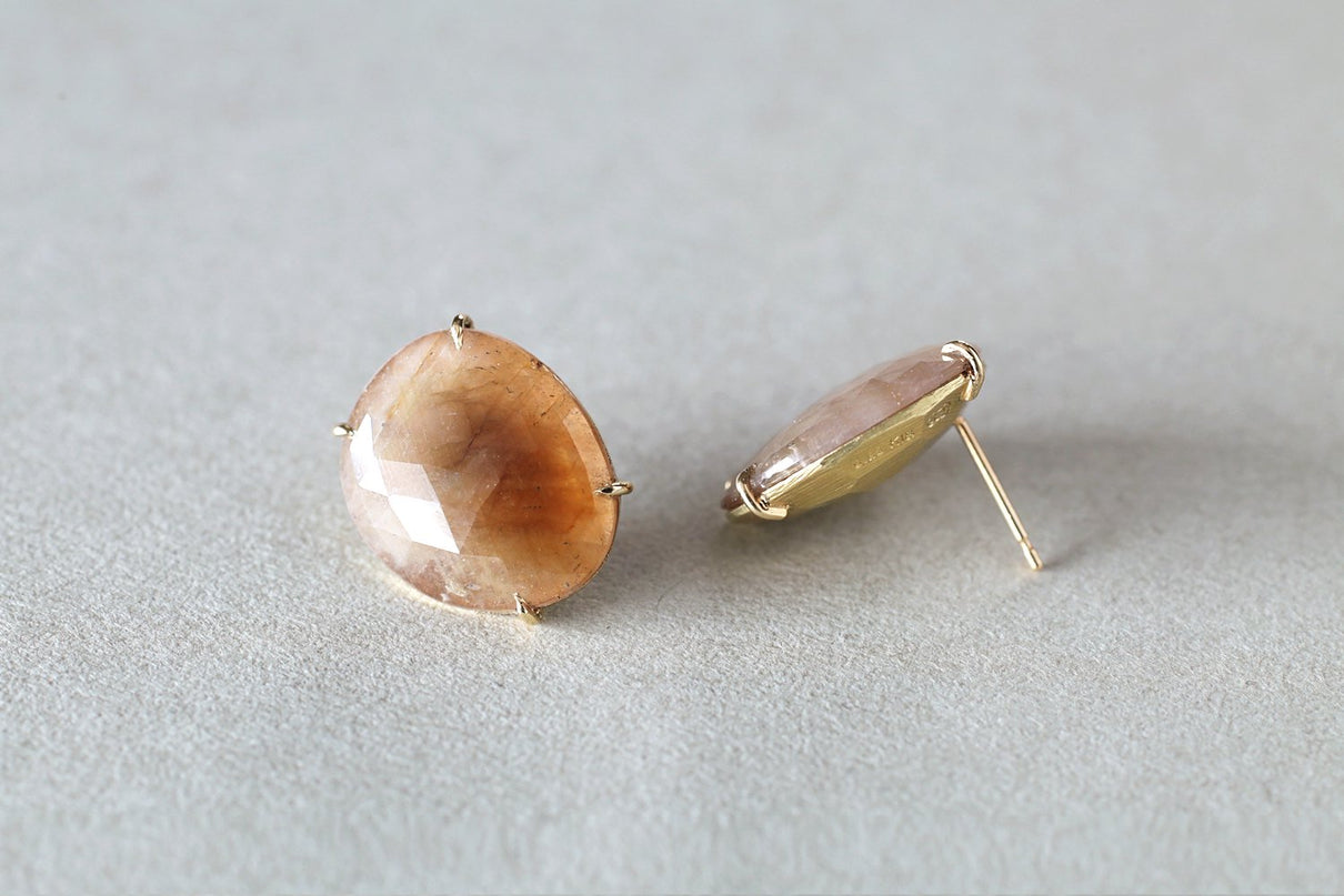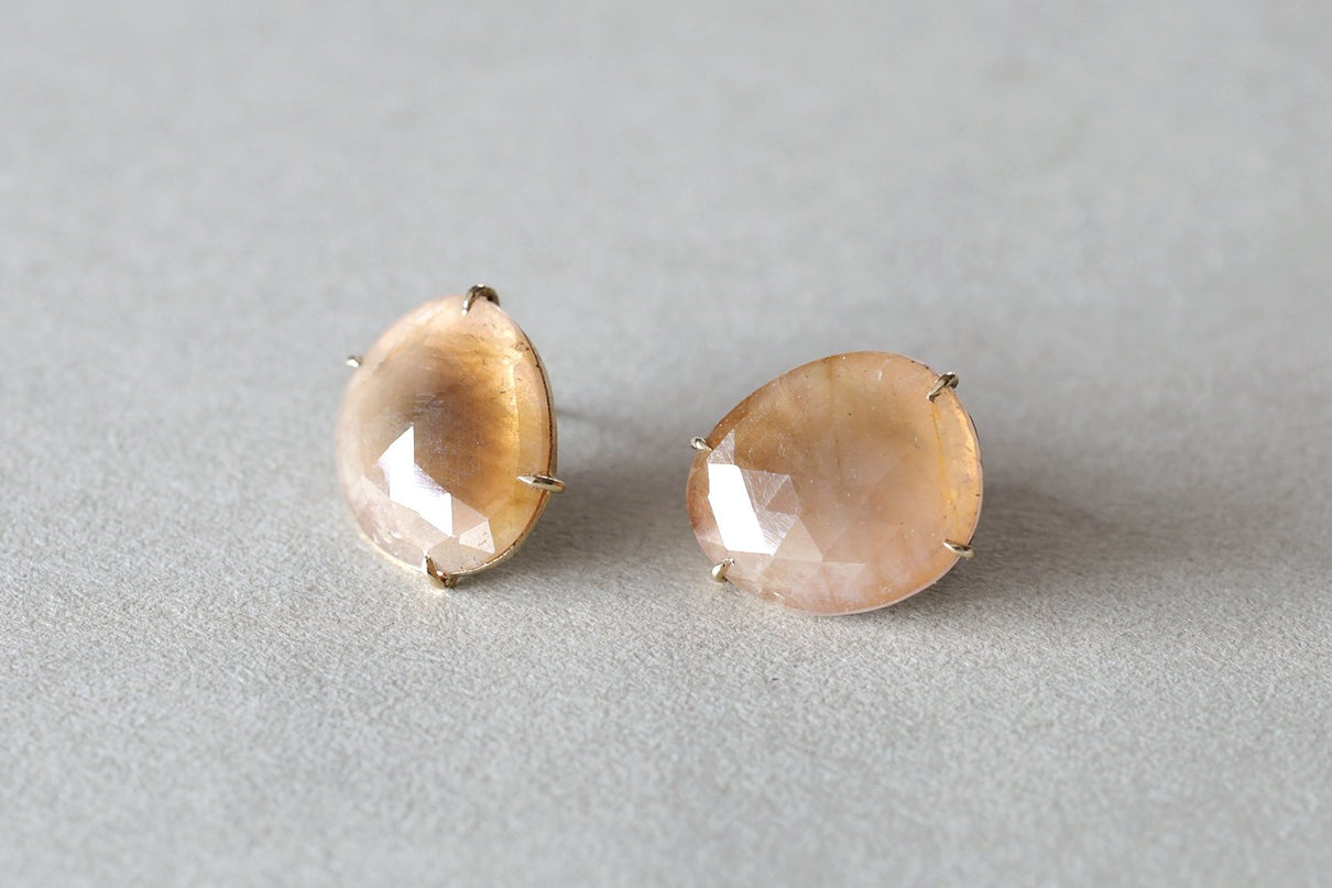 一般的なサファイアのイメージとは異なる、ニュアンスカラーサファイアの1点もののピアス。複雑なベージュ・ブラウンの色味や中に閉じ込められた内包物は、天然石ならではの唯一無二の美しさです。コロンとした石のフォルムと表のカットを生かし、石とゴールドが自然と一体となり滑らかに地続きでつながって見えるように仕立てた台座は、アクセントとして不均一なヘアライン状のテクスチャーを加えました。半透明状の石の縁には、向こう側の台座のゴールドの艶めきがうっすらと透けて浮かび、角度によって異なる表情は奥ゆかしくシックに耳元を装います。9月の誕生石としても親しまれているサファイアは、9月生まれの方の特別なお守りとしてもお勧めです。
