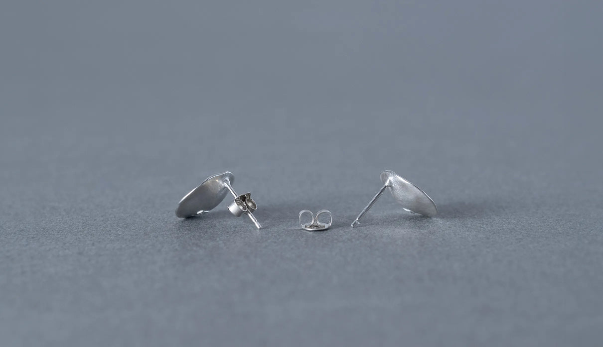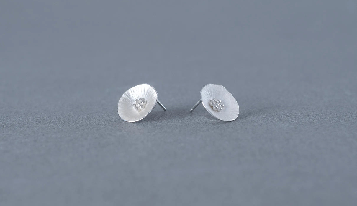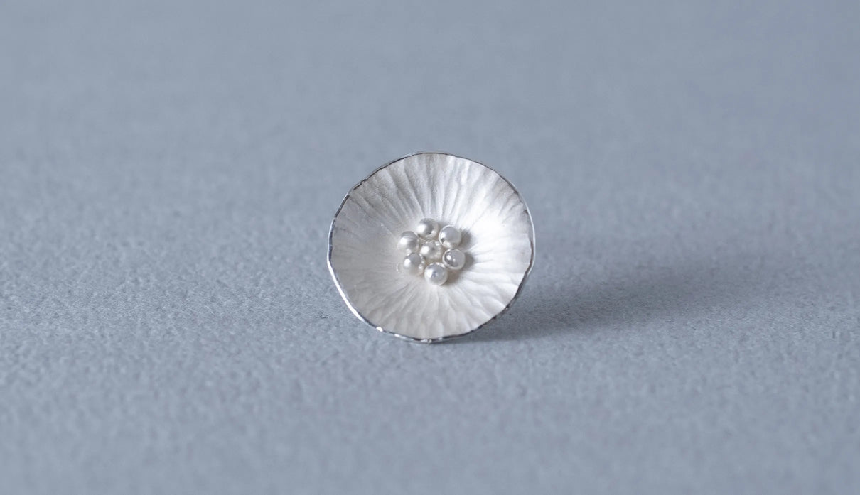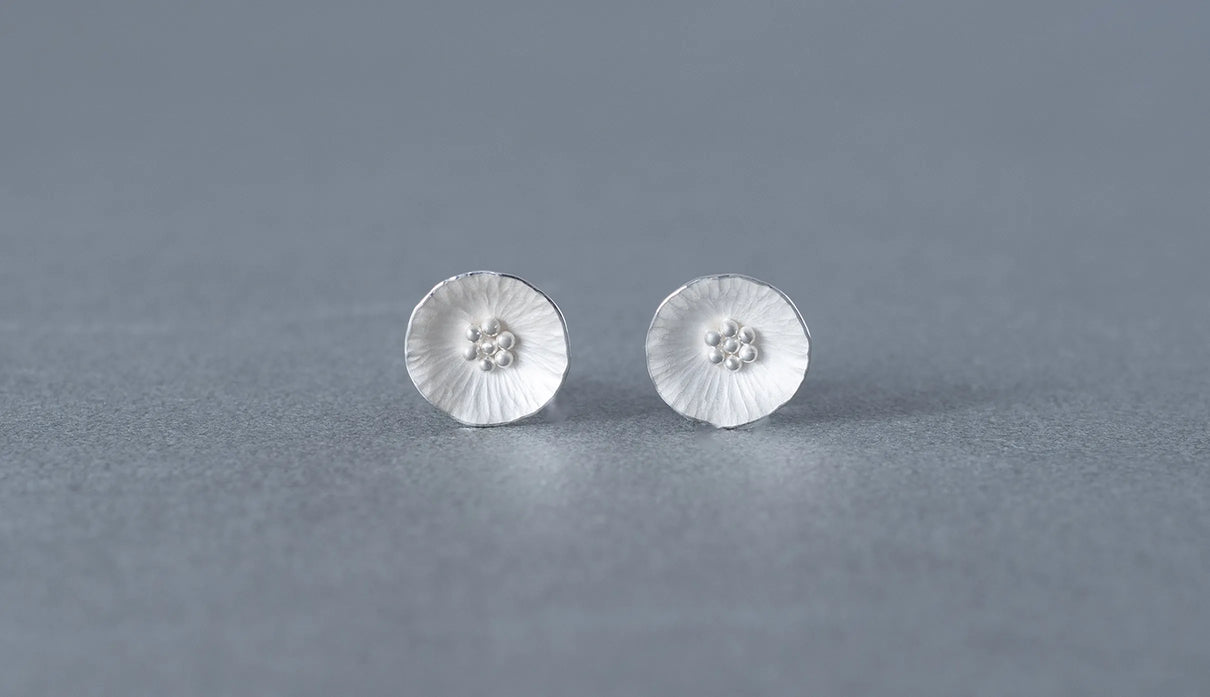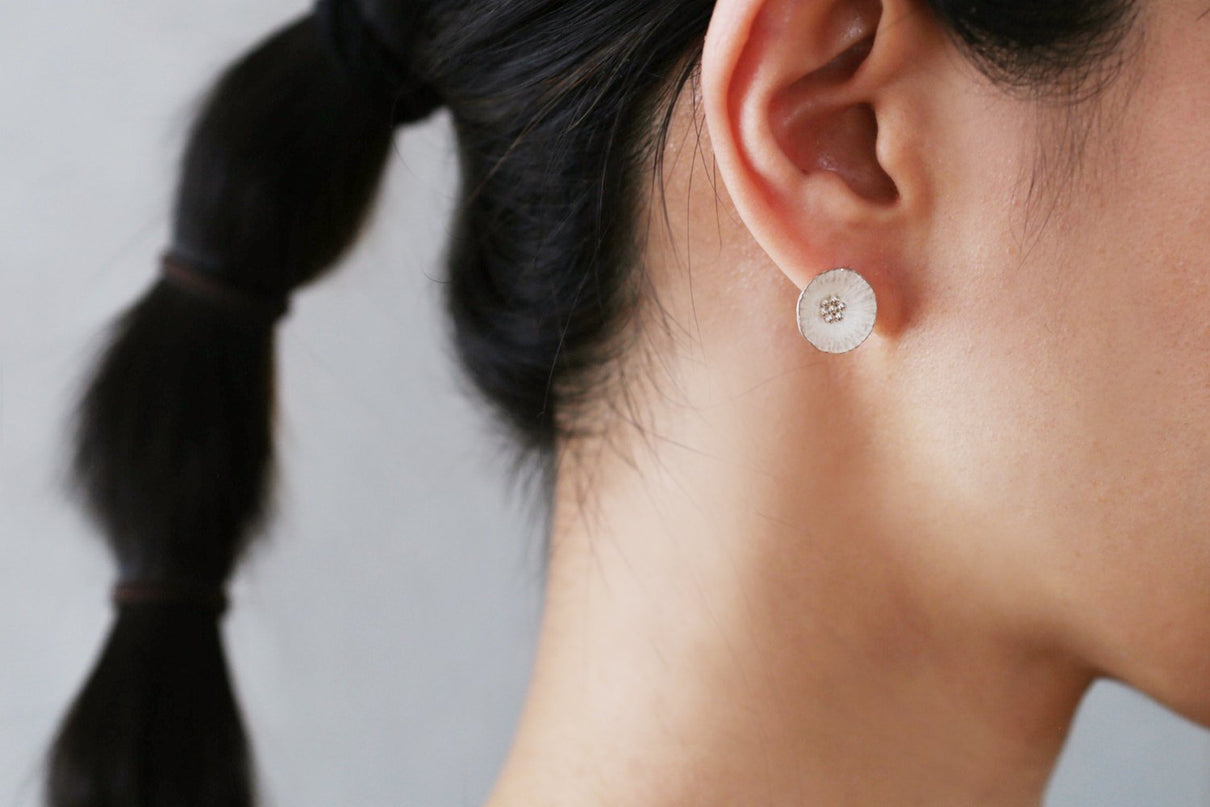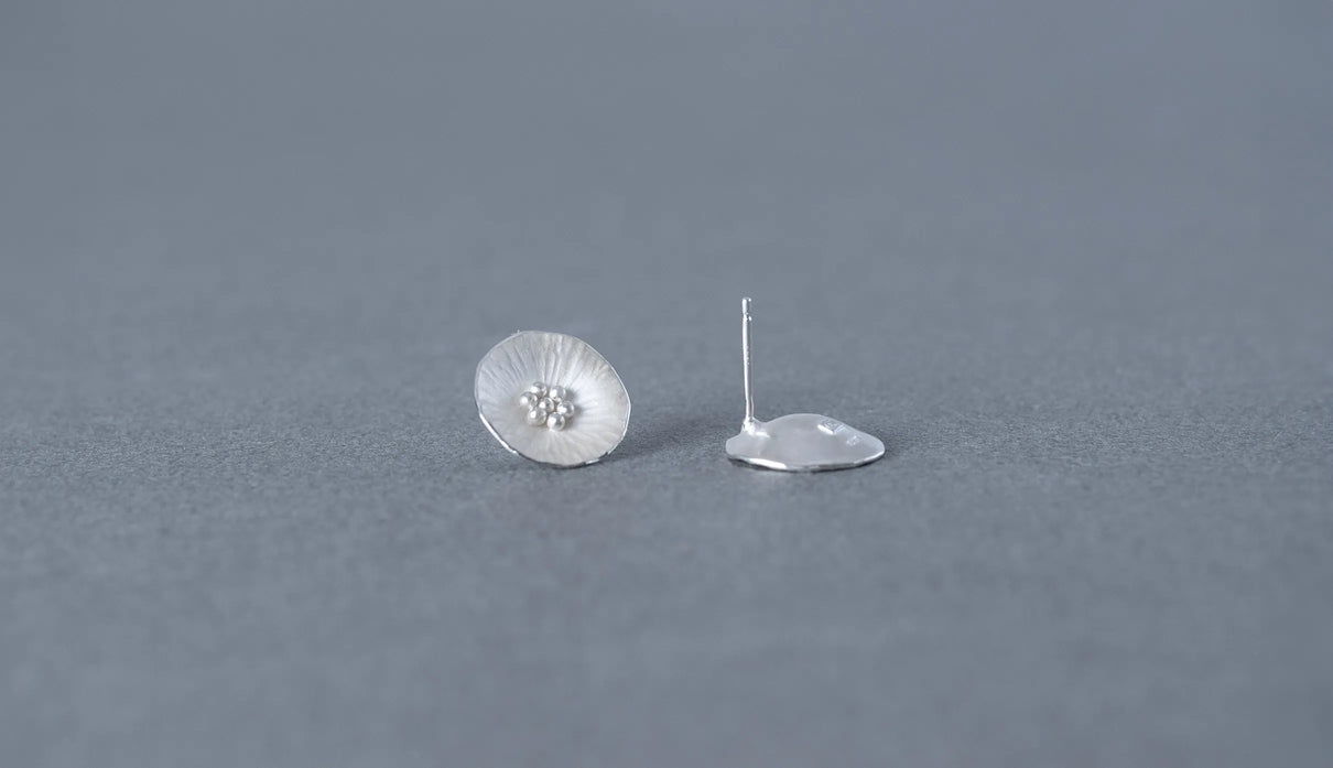 霧がかる朝に咲いたばかり一輪の花。葉脈を連想させるお花のテクスチャーは一つ一つ叩いてつけており、それによって花びらは自然な存在感を放ちます。Silverの内側はマットな白い焼き色を残し、スモーキーな印象に。Mixはシルバーにきらりと艶めくK18の粒のコントラストが愛らしく、K18は品の良さが引き立ちます。ふわりとやさしい印象のピアスです。