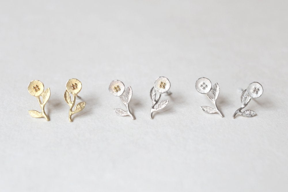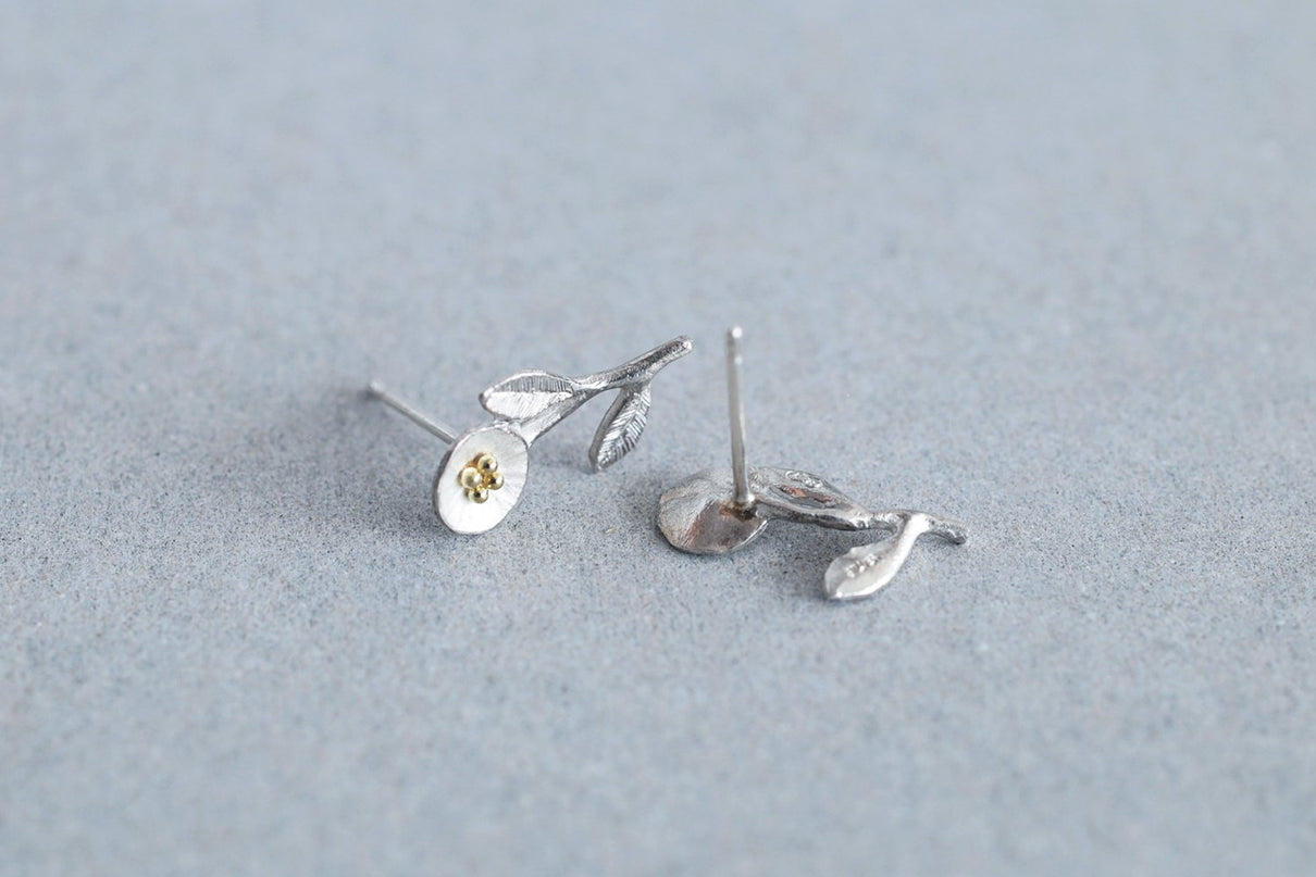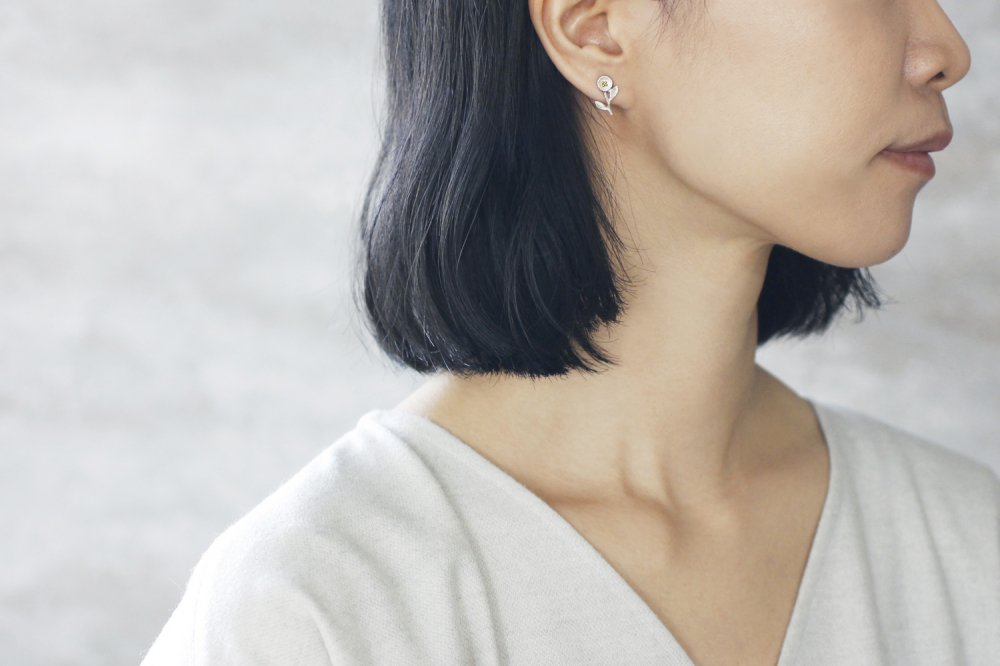 定番シリーズであるPetit flowerに、葉っぱと枝のついたデザインを追加したピアス。切なげにすこし首をかしげた花が、小さく繊細ながらも強い生命力を放つ様をイメージしました。左右で異なる形をしており、Silverの内側はマットな白い焼き色を残し、スモーキーな印象に。Mixはシルバーにきらりと艶めくK18の粒のコントラストが愛らしく、K18は品の良さが引き立ちます。
