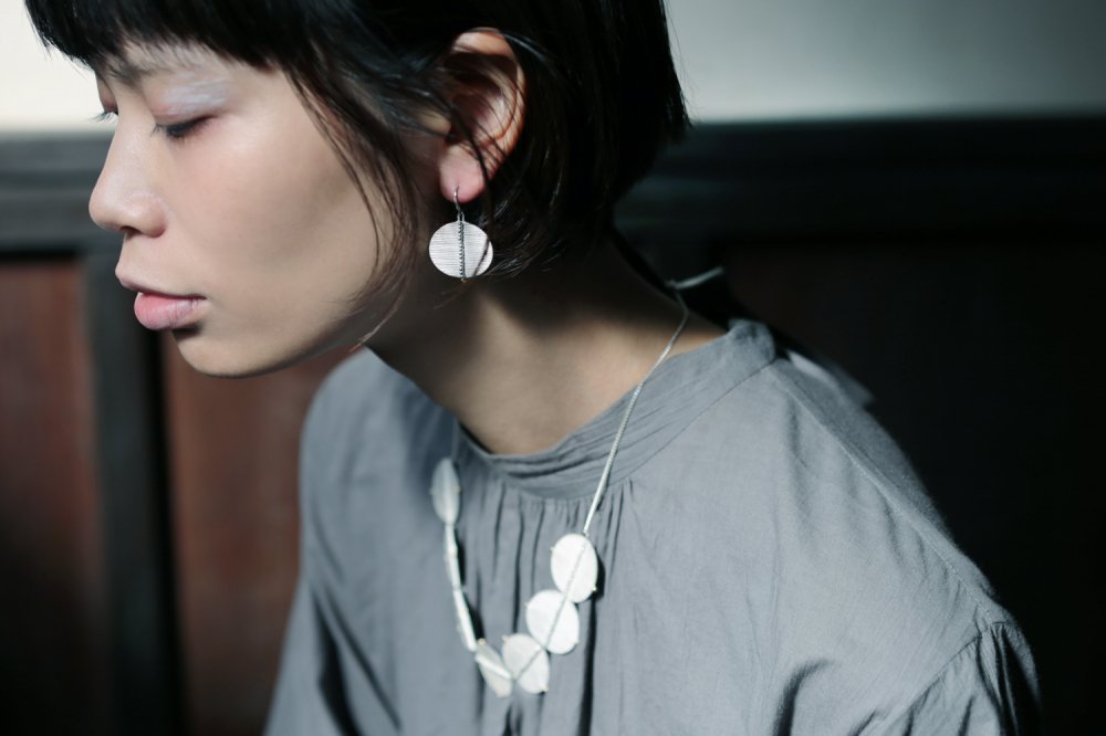多種多様で想像を超えるような不思議な姿をした珪藻をモチーフにしたフックピアス。洗練された楕円形のフォルムの先に小さなK18の粒が光ります。スモーキーなマットテクスチャーでよく見ると紙を重ねたような段々の層になっており、少し起き上がるように左右に反った表情や筋彫りの入った個性あるフックまで細部にこだわりを感じられる趣深いアイテム。耳元で静かに揺れる佇まいは、思わず目を引く存在感で凛とした印象を与えます。