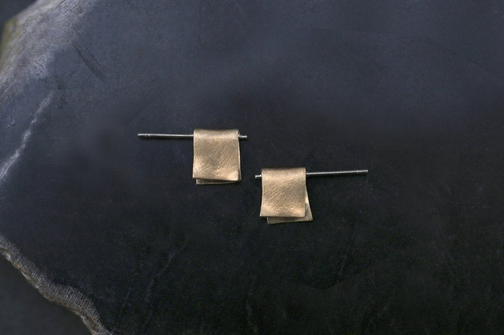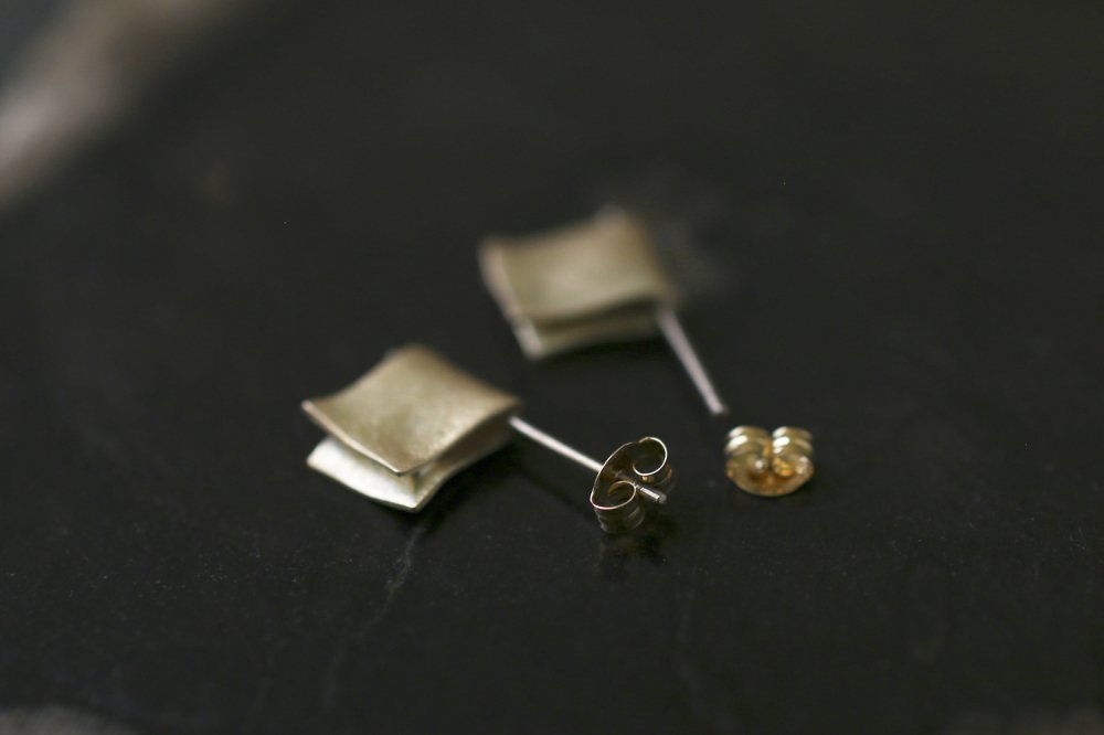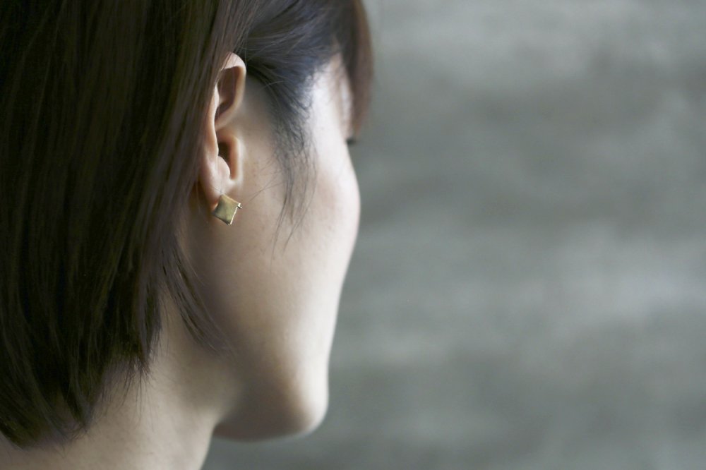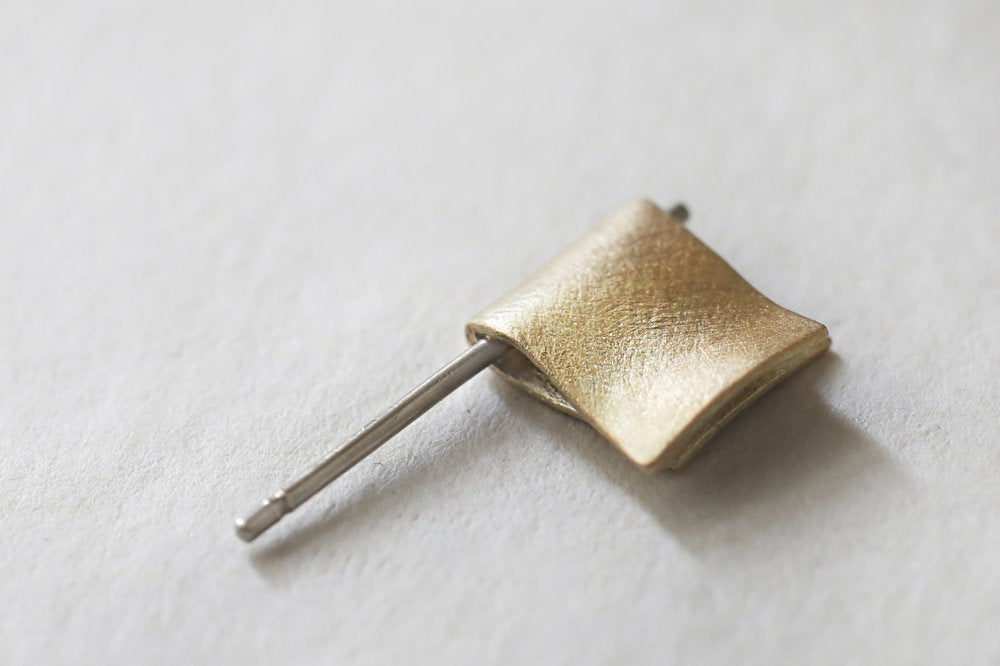 トップとポスト部分はそれぞれ別の素材を使用したマルチカラーになっており、粗めで温かみのあるマットなテクスチャーで仕上げ、柔らかな布がポストにそっとかかっているようなフォルムをしたピアス。左右の形は少し異なり、耳たぶで立ち上がるように光る個性的なアイテムです。