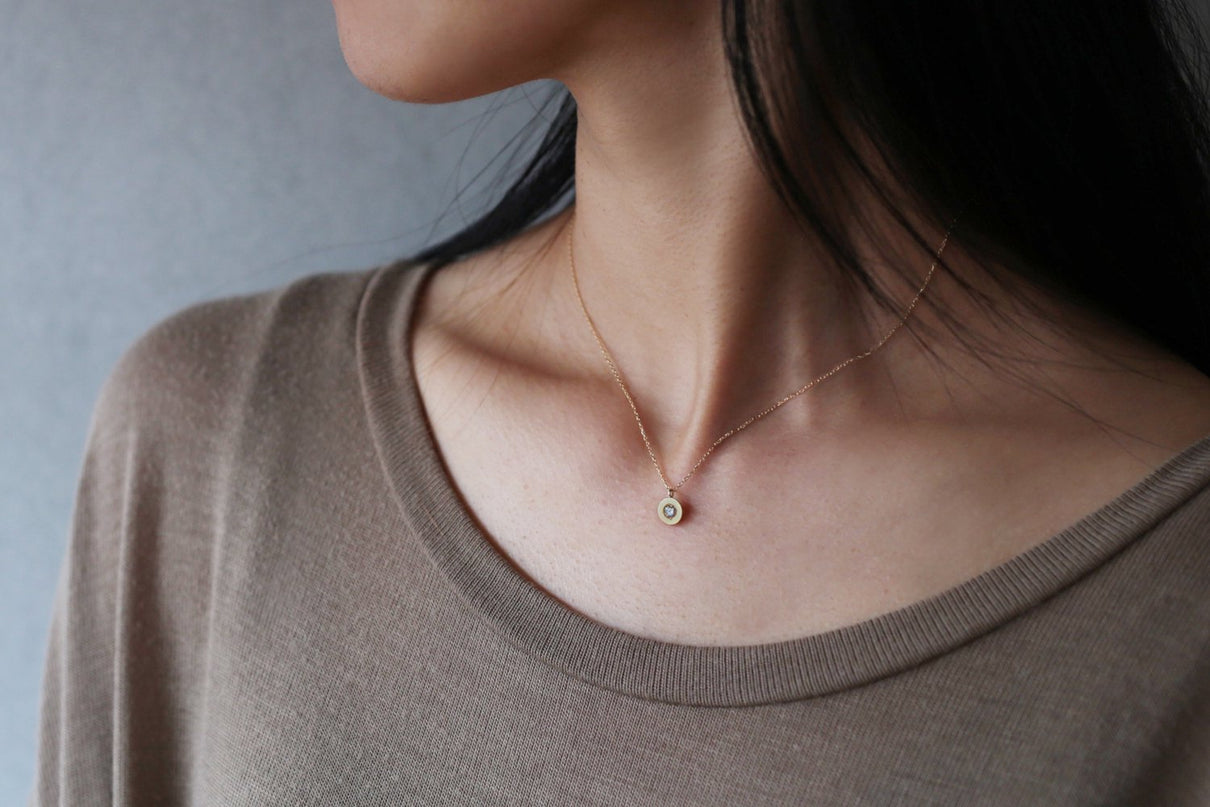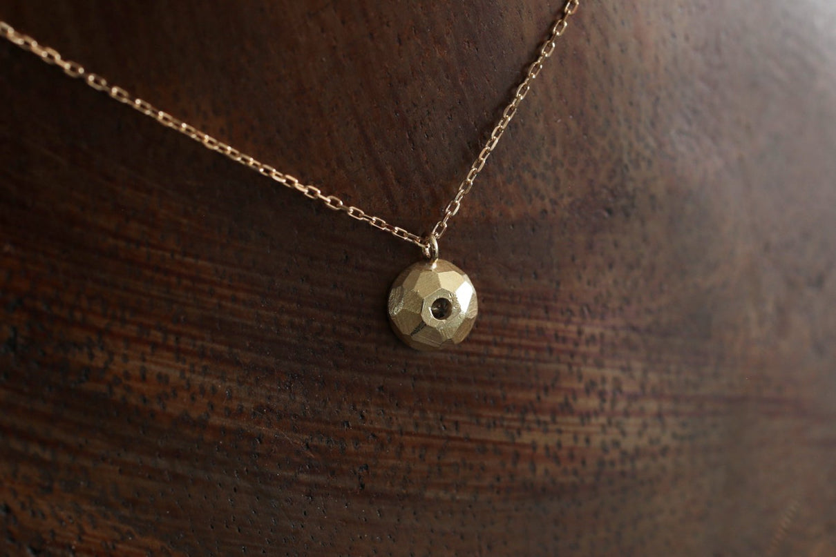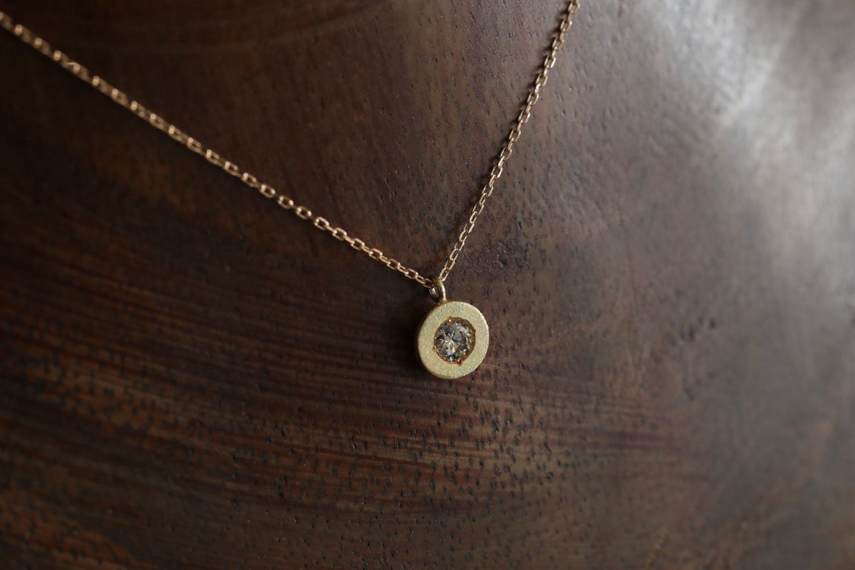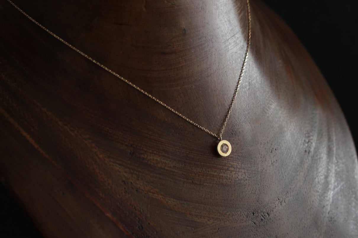 0.1ctの大変輝きの良いライトブラウンダイヤモンドを上下左右の4点で留めたネックレス。ほんのりとわずかに色づくダイヤモンドは肌馴染みの良い天然石ならではの色味で、K18イエローゴールドのトップの裏は荒く削りだしたような面が織りなすラフカットのテクスチャーを施しました。存在感のあるダイヤモンドが揺れるたびに首元で華やかな煌めきを放ちます。
