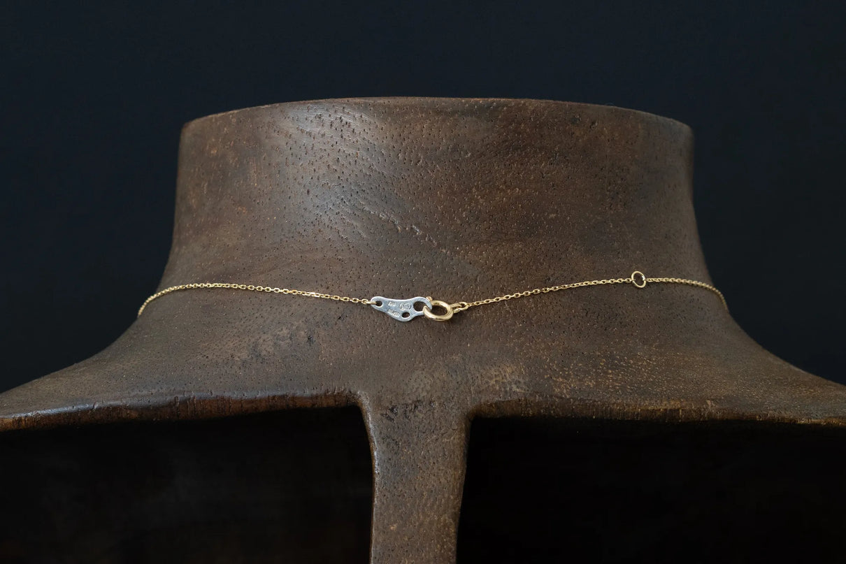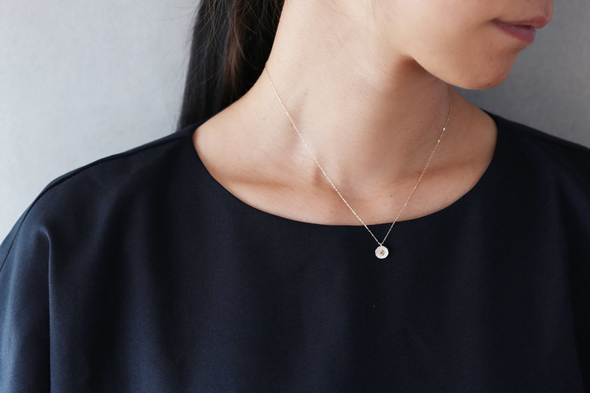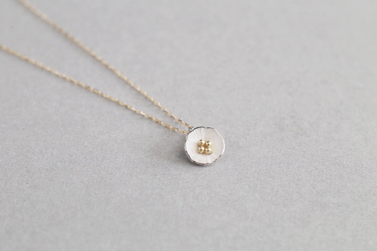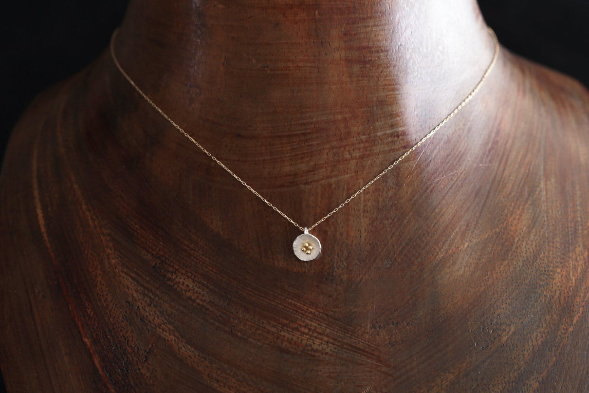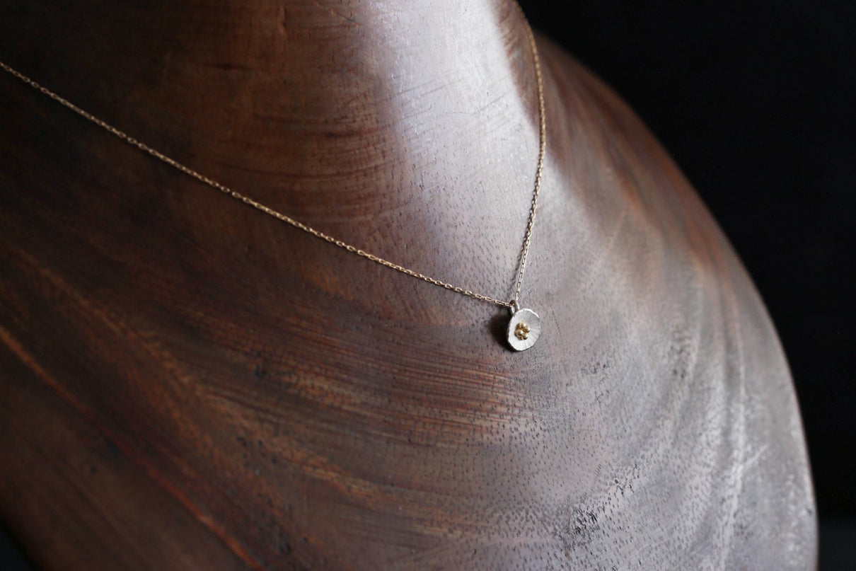 草むらの中、よく目を凝らすとさりげなく咲いている小さな小さなお花たち。さりげなく一輪、胸元を彩るネックレスです。花びらのテクスチャーは手で少しずつ叩いて付けられており、有機的で自然な存在感を放ちます。Silverの内側はマットな白い焼き色を残し、スモーキーな印象に。Mixはシルバーにきらりと艶めくK18の粒のコントラストが愛らしく、K18は品の良さが引き立ちます。
