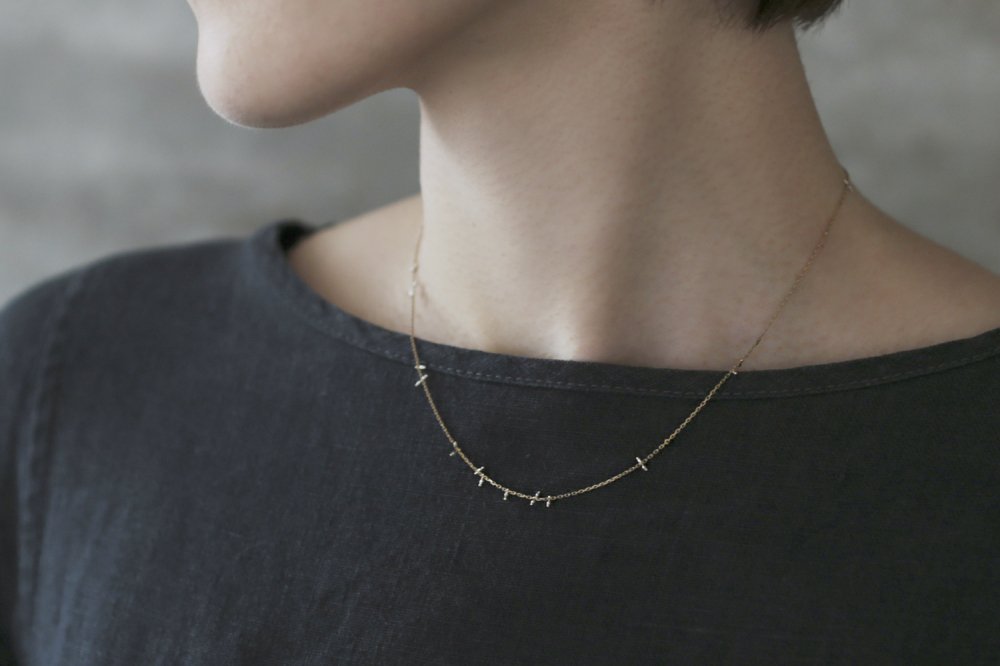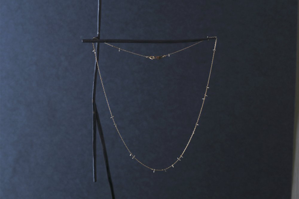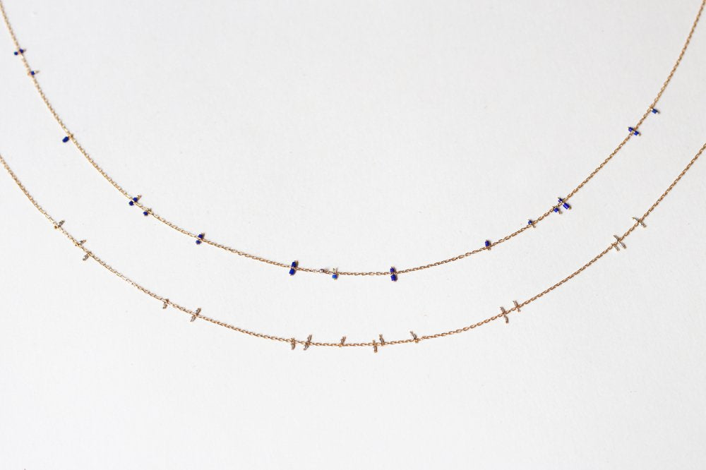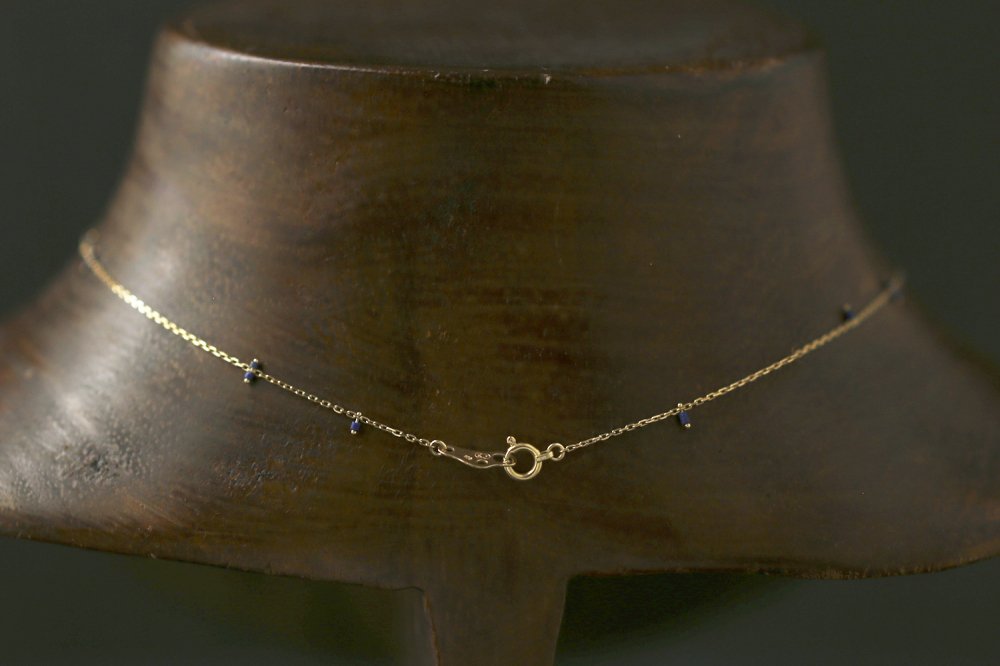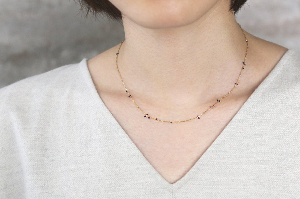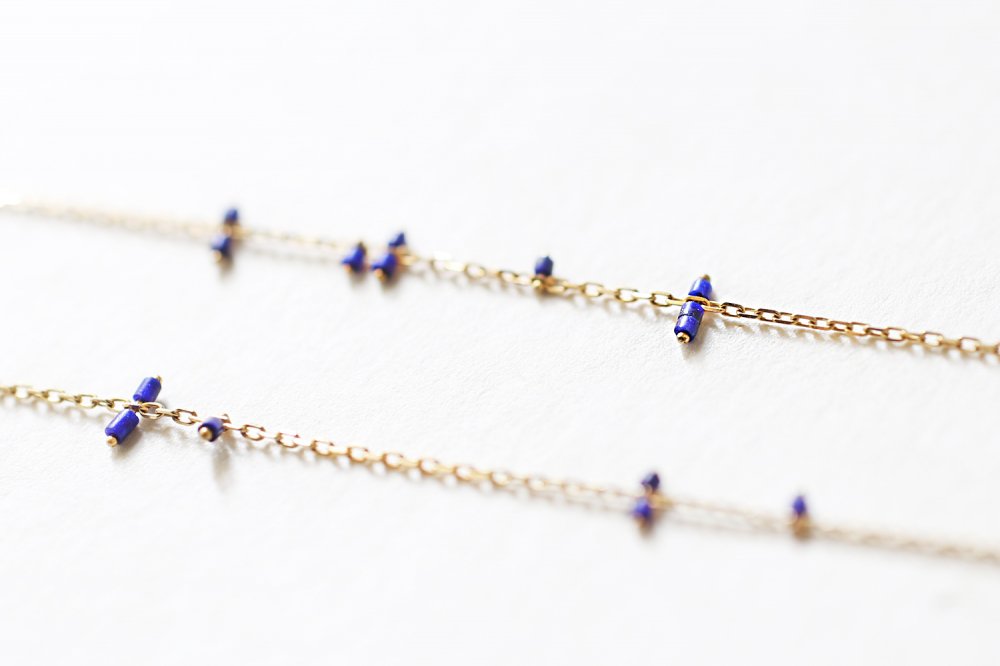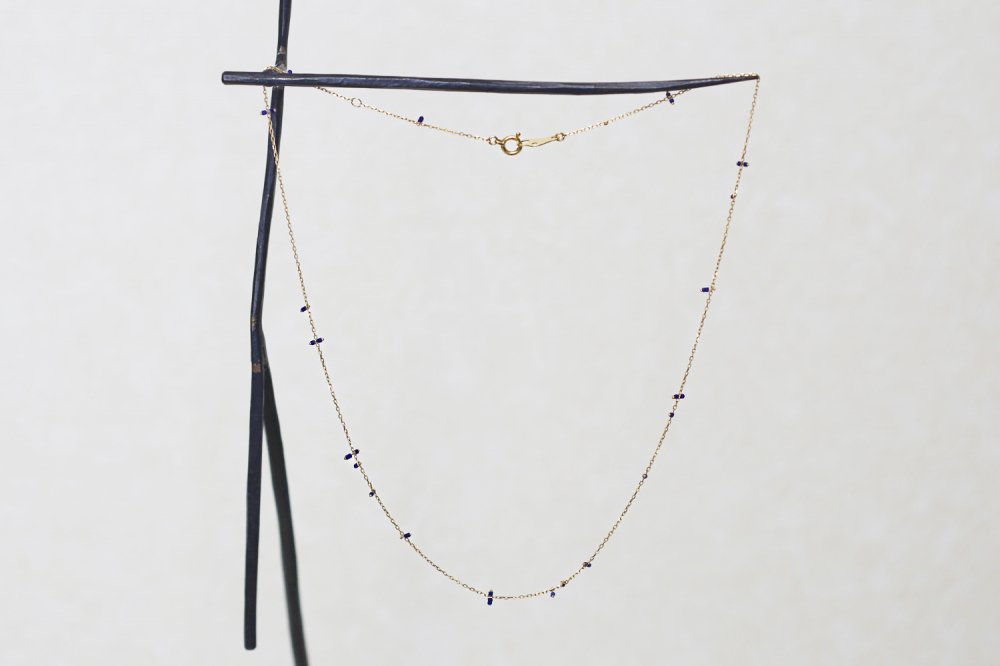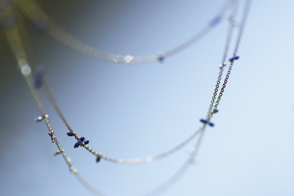 細めのチェーンにちらちらとランダムに付いた砂粒のように小さな青いラピスラズリ、銀色のカレンシルバービーズが繊細な印象のネックレス。12月の誕生石としても親しまれているラピスラズリは、12月生まれの方の特別なお守りとして贈りものにもお勧めです。シンプルな佇まいで装いを選ばず身に纏え、首元をさりげなくも華やかにしてくれるアイテムです。
