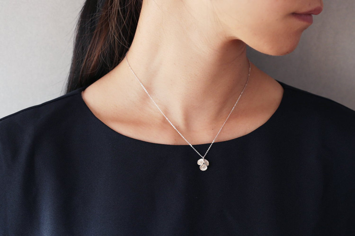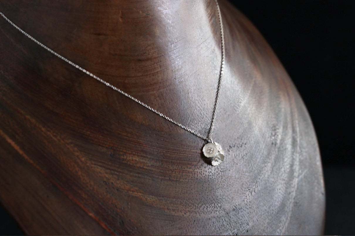 草むらの中、よく目を凝らすとさりげなく咲いている小さな小さなお花たち。3つ寄り添った姿が愛らしいネックレスです。花びらのテクスチャーは手で少しずつ叩いて付けられており、有機的で自然な存在感を放ちます。Silverの内側はマットな白い焼き色を残し、スモーキーな印象に。Mixはシルバーにきらりと艶めくK18の粒のコントラストが愛らしく、K18は品の良さが引き立ちます。
