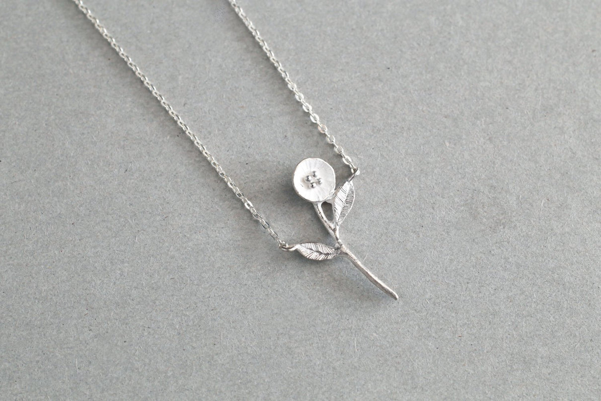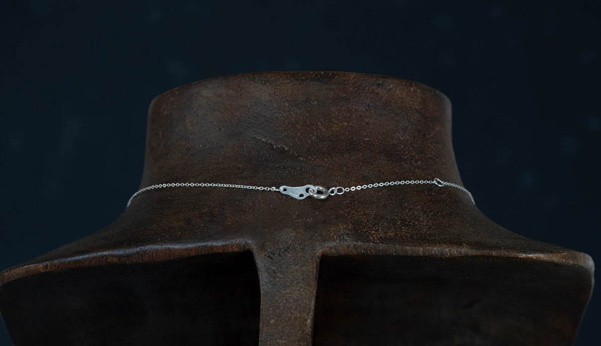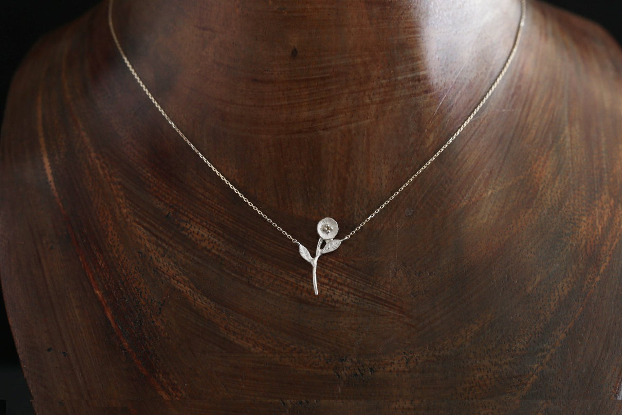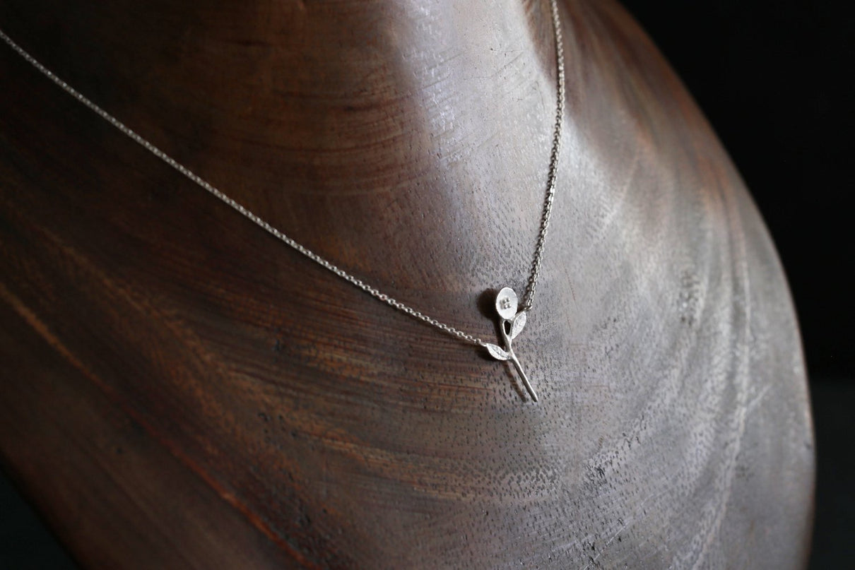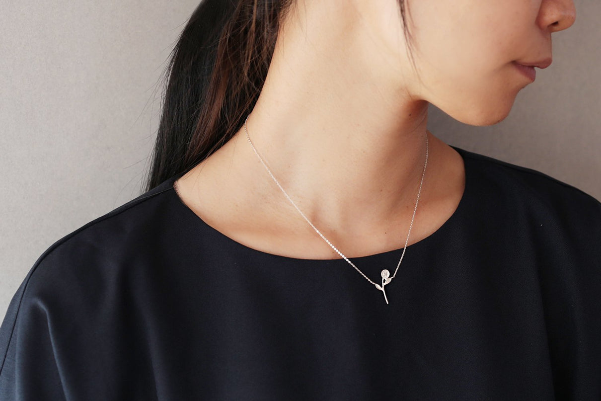 定番シリーズであるPetit flowerに、葉っぱと枝のついたデザインを追加したネックレス。切なげにすこし首をかしげた花が、小さく繊細ながらも強い生命力を放つ様をイメージしました。Silverの内側はマットな白い焼き色を残し、スモーキーな印象に。Mixはシルバーにきらりと艶めくK18の粒のコントラストが愛らしく、K18は品の良さが引き立ちます。