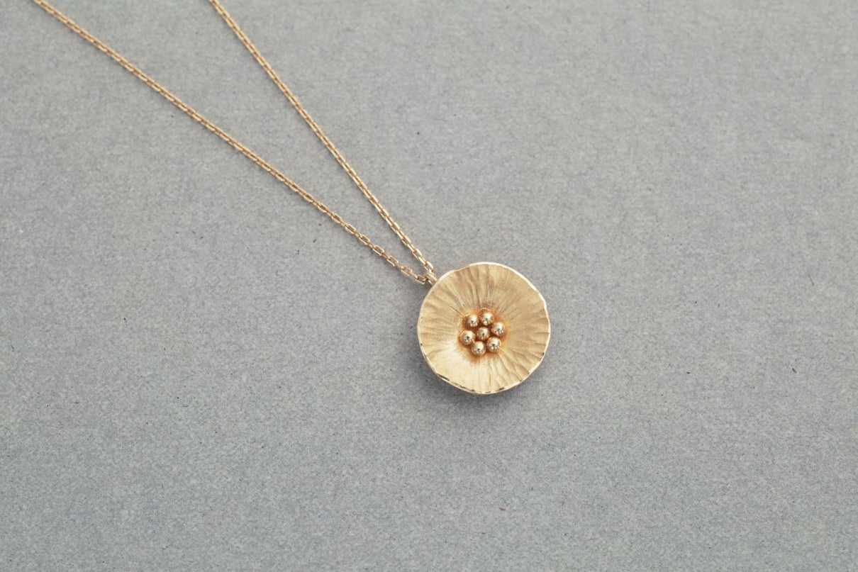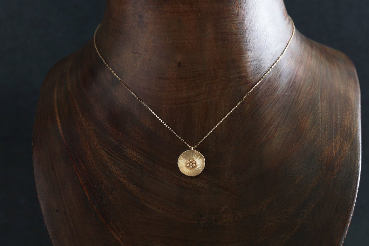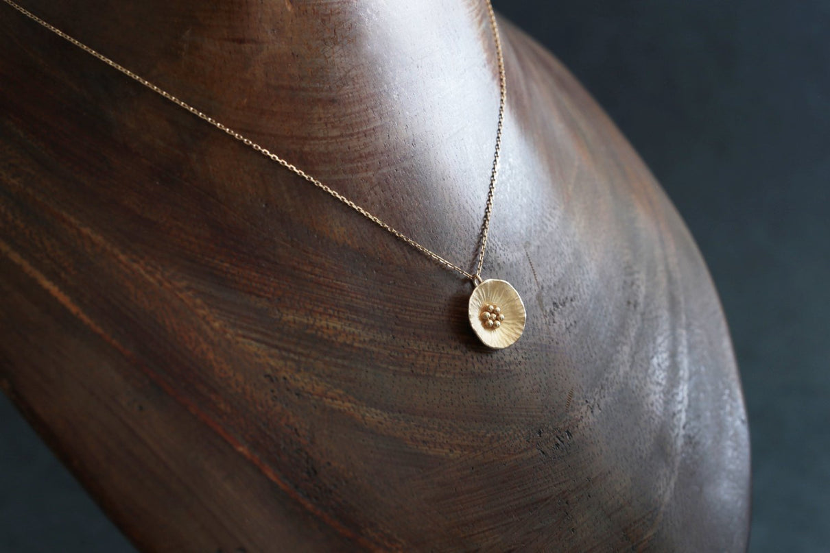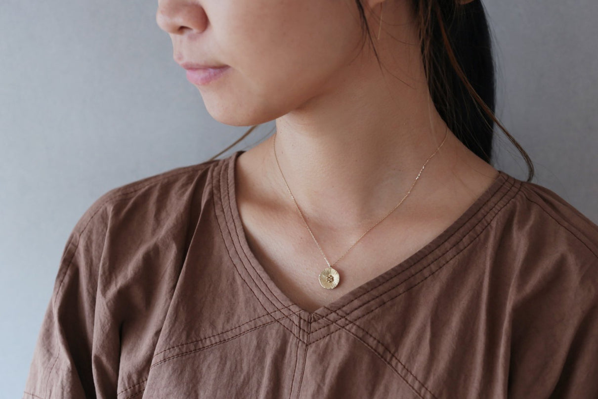 葉脈を連想させるお花のテクスチャーは一つ一つ叩いてつけており、それによって花びらは自然な存在感を放つネックレス。Silverの内側はマットな白い焼き色を残し、スモーキーな印象に。Mixはシルバーにきらりと艶めくK18の粒のコントラストが愛らしく、K18は品の良さが引き立ちます。ふわっとやさしい印象のアイテムです。