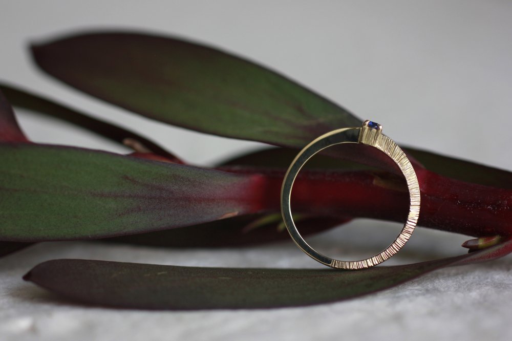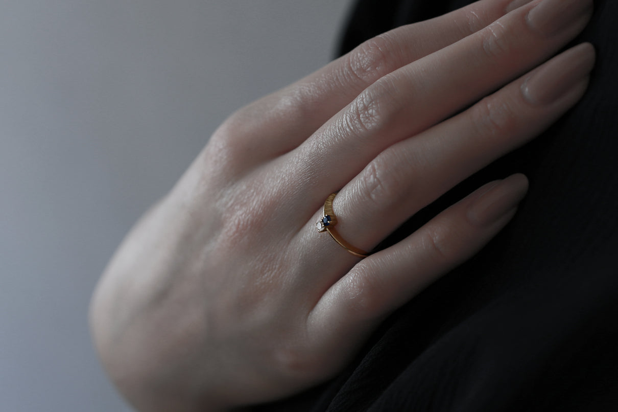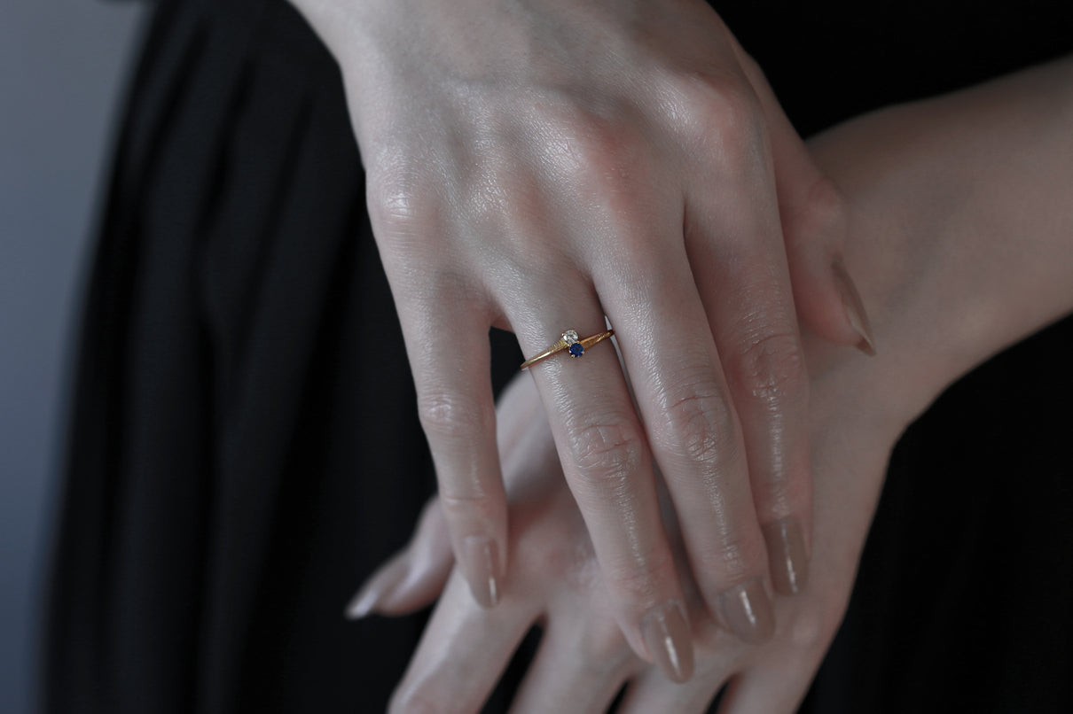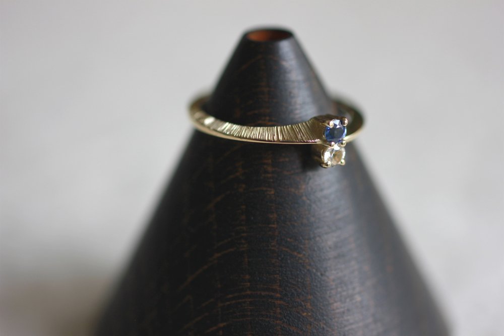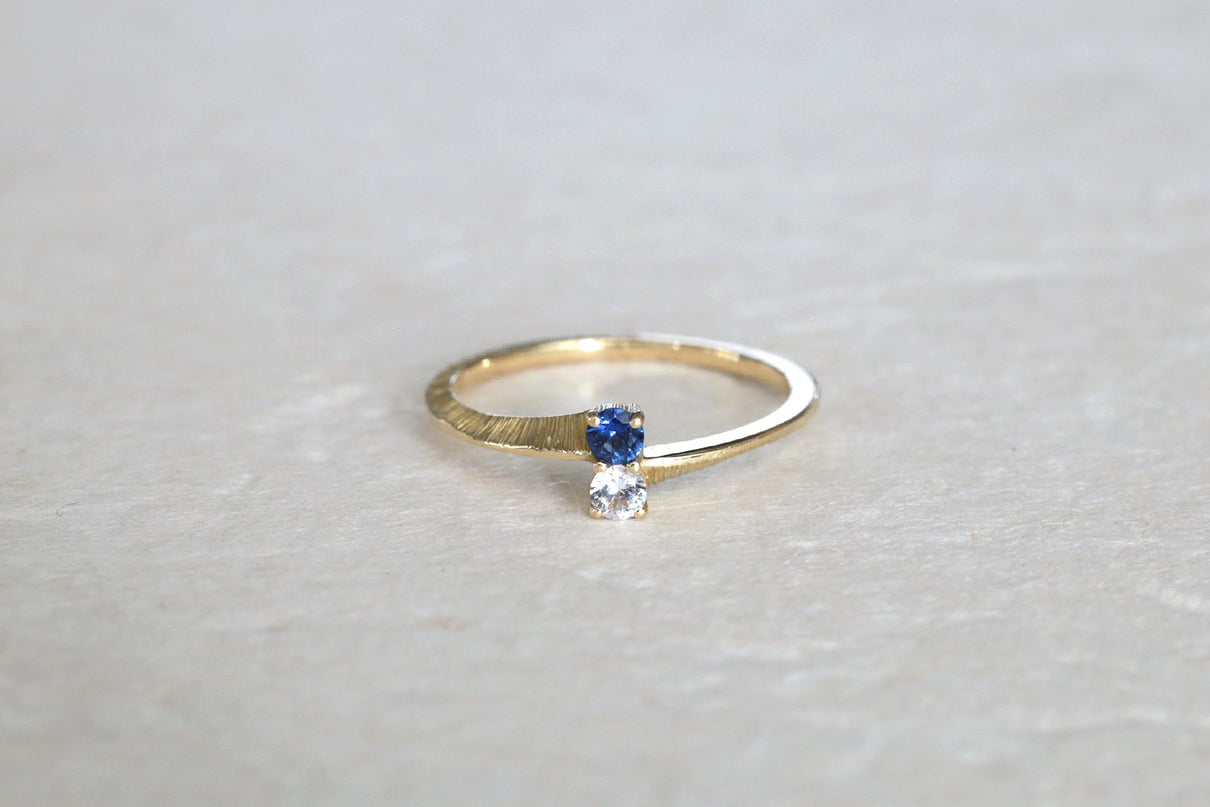 【サファイア】輝きが美しい良質なサファイアを留めたリング。縦に2つ並んだブルーとホワイトのサファイアと、正面から見た時に極細の艶テクスチャーを施したK18ゴールドの極細線が華奢な雰囲気を醸します。無数の線で描く緻密な手彫り装飾面と、艶めく光沢面が半周ずつアシンメトリーになったリング側面のデザインと相まって角度によって様々な表情を見せてくれ、装いにひと匙の個性と凛とした雰囲気を添えてくれるアイテムです。9月の誕生石としても親しまれているサファイアは、9月生まれの方の特別なお守りとしてもお勧めです。
