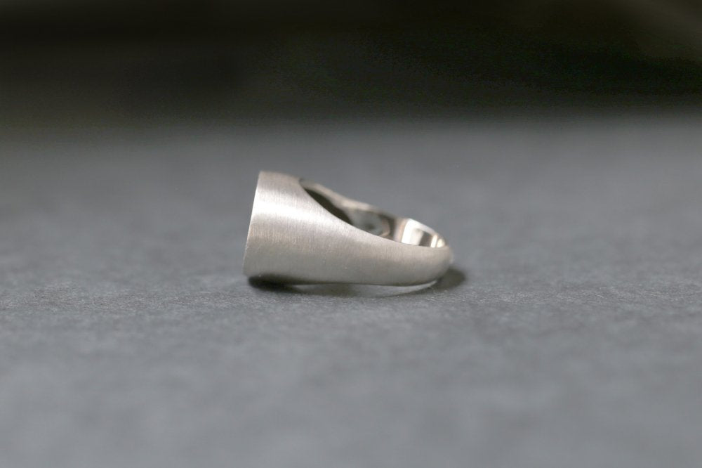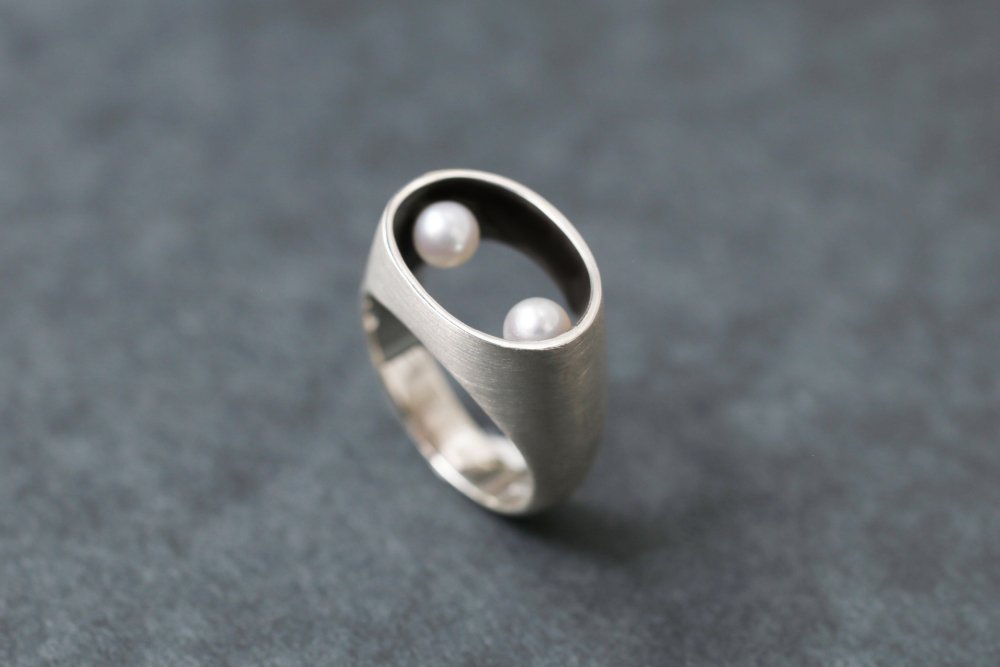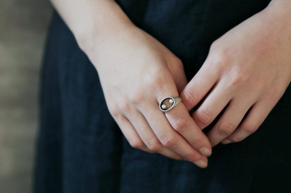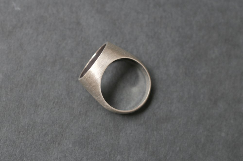 指にはめると穴がぽかんと空いているように見える不思議なフォルムをしたリング。全体的にマットなテクスチャーを施し、楕円形の穴の入り口だけがきらりとさりげなく艶めきます。また、深さに奥行きを感じさせるように穴の中は黒く燻して仕上げました。思わず目をひく印象的なアイテムです。
