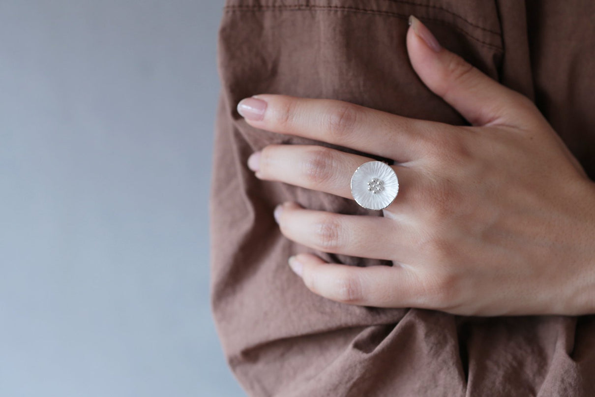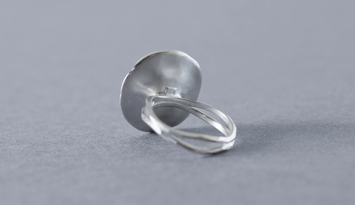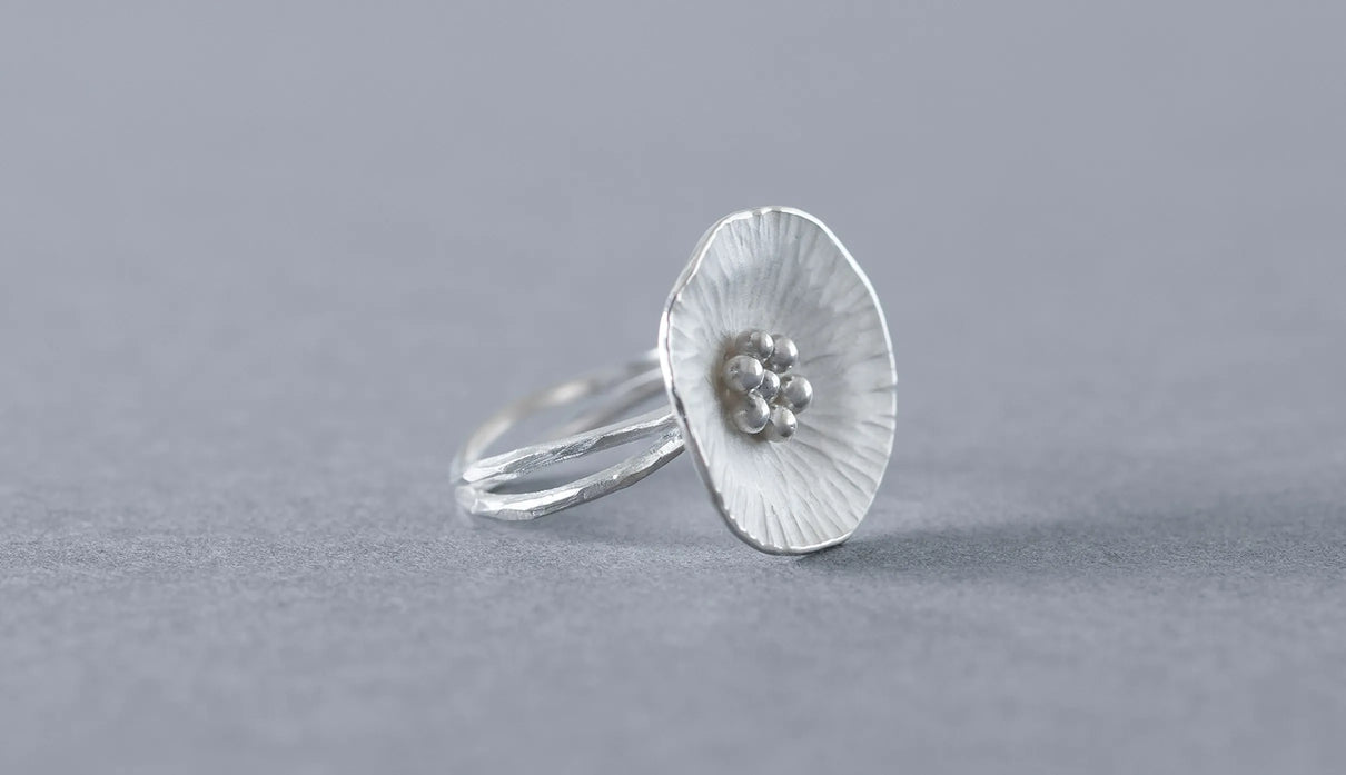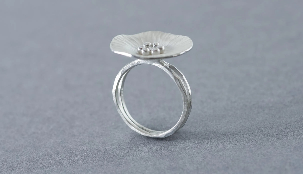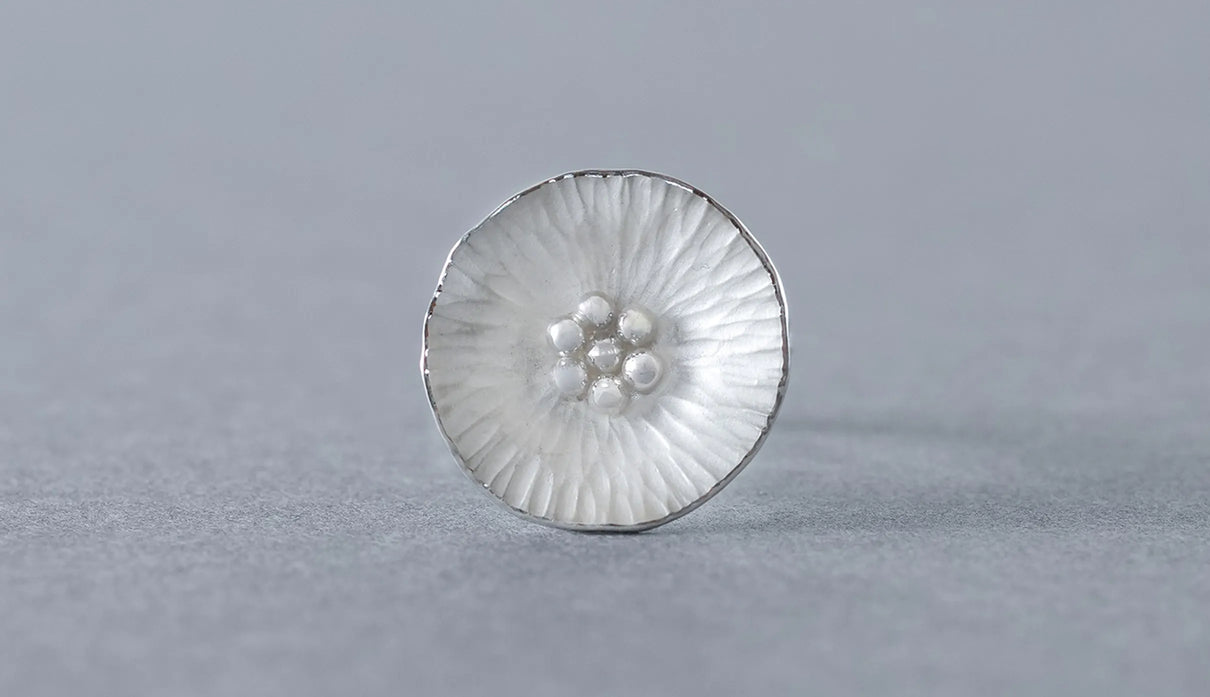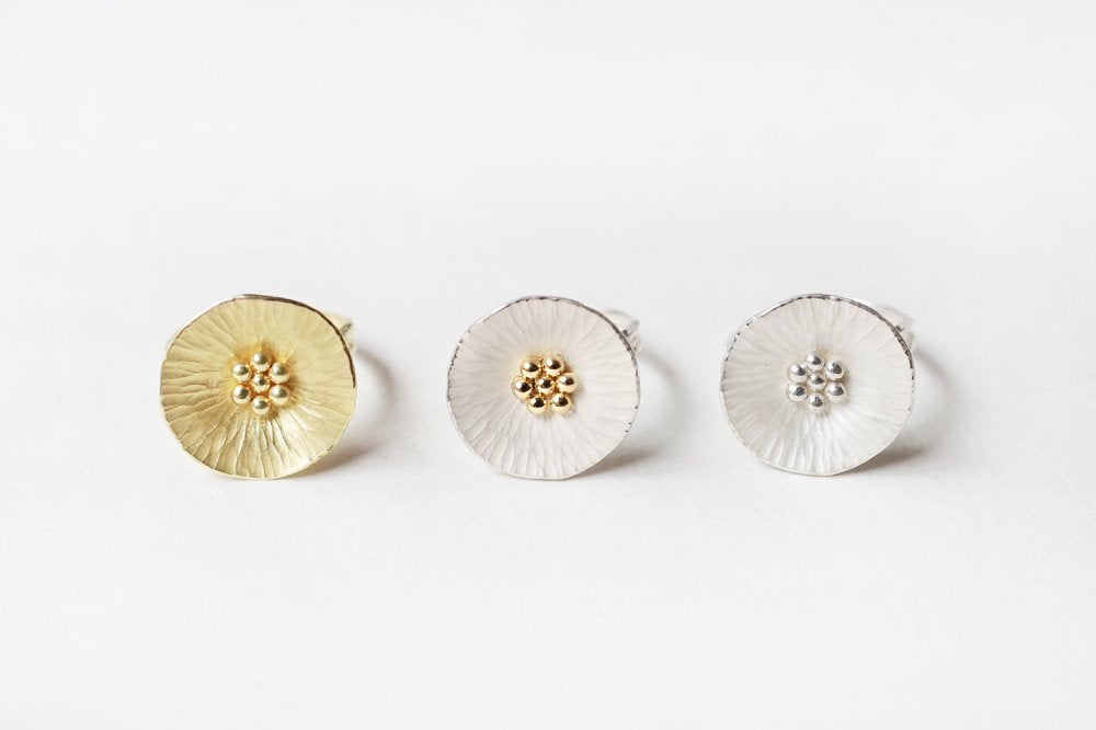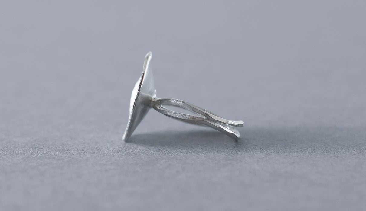 葉脈を連想させるお花のテクスチャーは一つ一つ叩いてつけており、それによって花びらは自然な存在感を放ちます。Silverの内側はマットな白い焼き色を残し、スモーキーな印象に。Mixはシルバーにきらりと艶めくK18の粒のコントラストが愛らしく、K18は品の良さが引き立ちます。2本に連なるリングの腕部分は、枝のように有機的な質感が美しくふわりとやさしい印象のリングです。