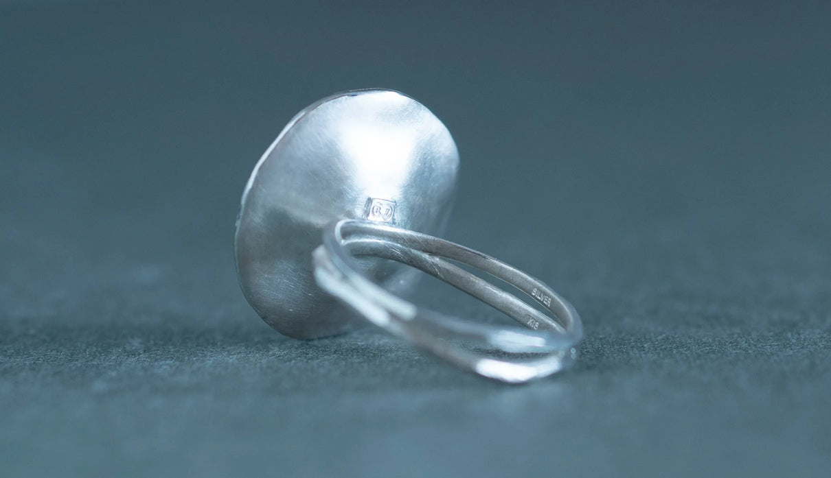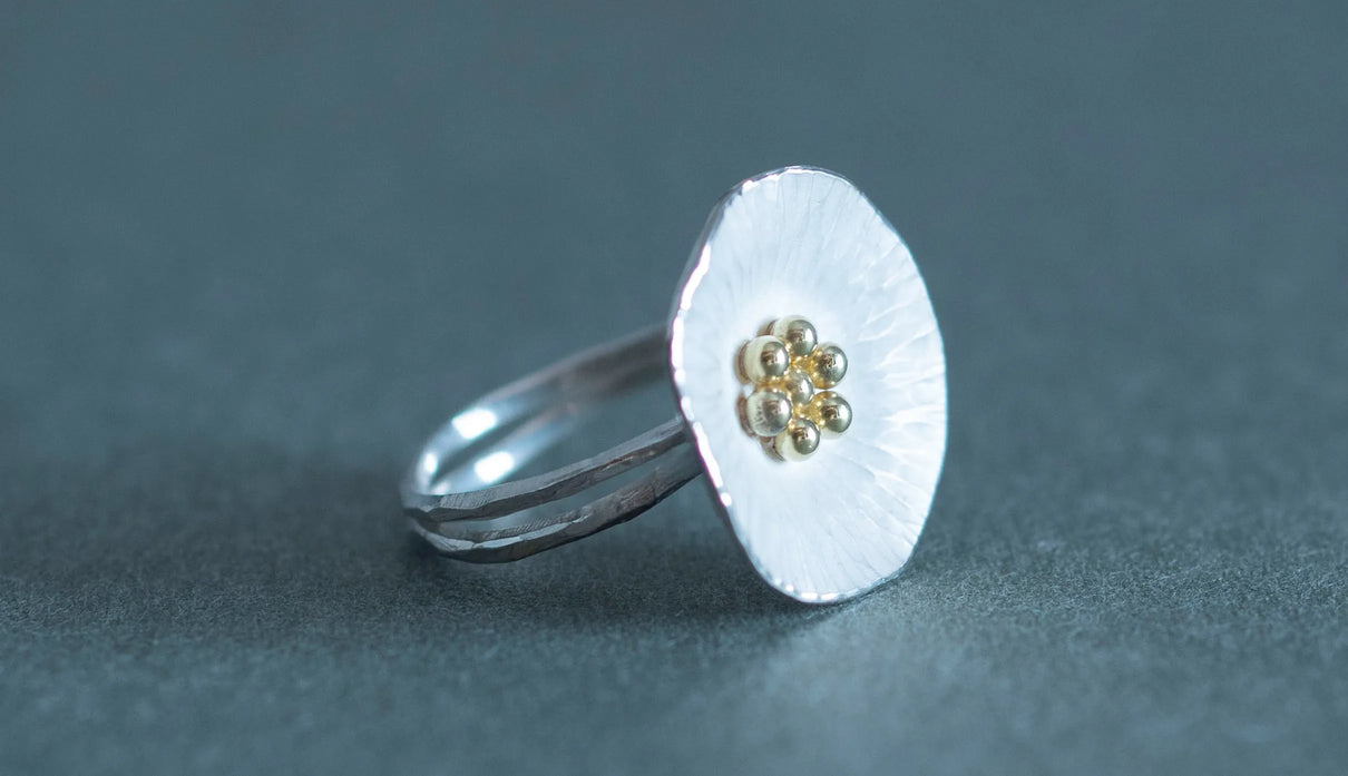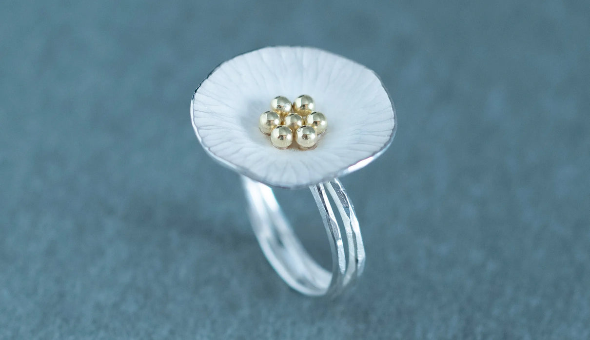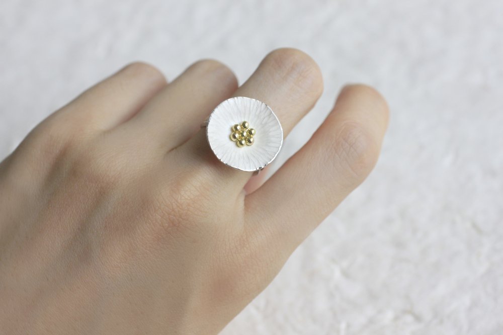 葉脈を連想させるお花のテクスチャーは一つ一つ叩いてつけており、それによって花びらは自然な存在感を放ちます。Silverの内側はマットな白い焼き色を残し、スモーキーな印象に。Mixはシルバーにきらりと艶めくK18の粒のコントラストが愛らしく、K18は品の良さが引き立ちます。2本に連なるリングの腕部分は、枝のように有機的な質感が美しくふわりとやさしい印象のリングです。