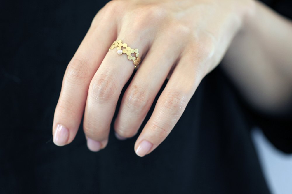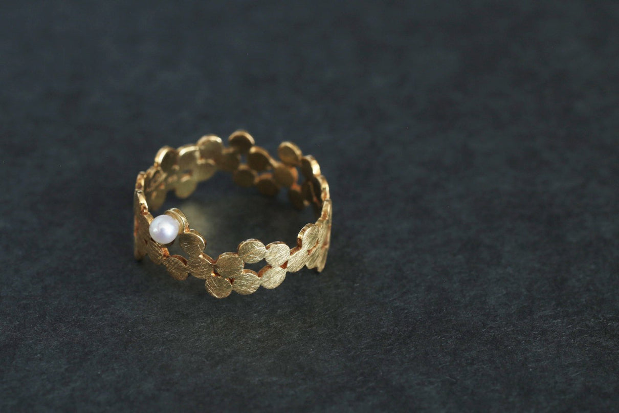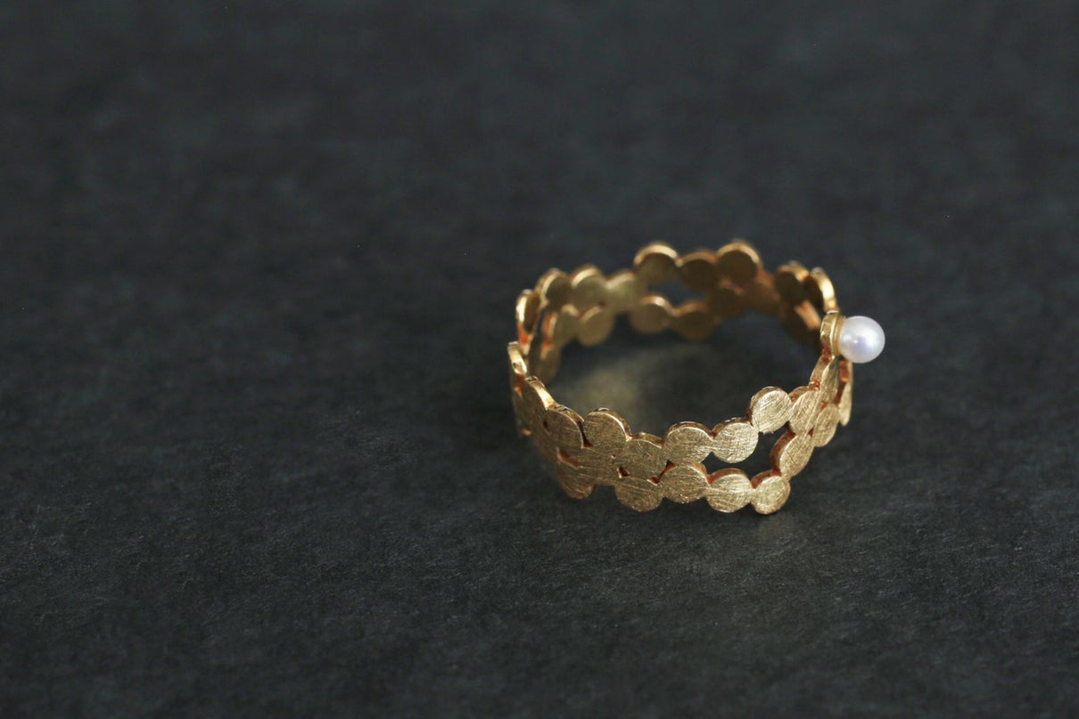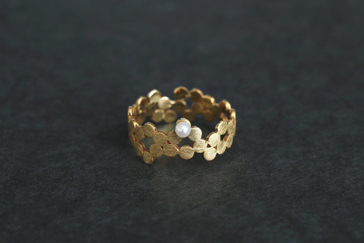 ぷくぷくと浮かぶシャボン玉をイメージした丸が連なるShabonシリーズ。ひとつぶ留まったパールはリングの丸と同じサイズで、さりげなく目を引くポイントになっています。質感は荒目のマットで落ち着い表情、丸と丸の間が透かしになっていて軽やかな着け心地です。
