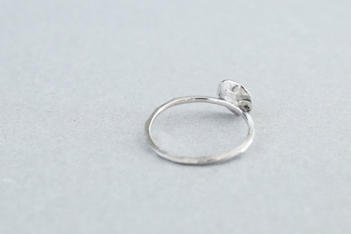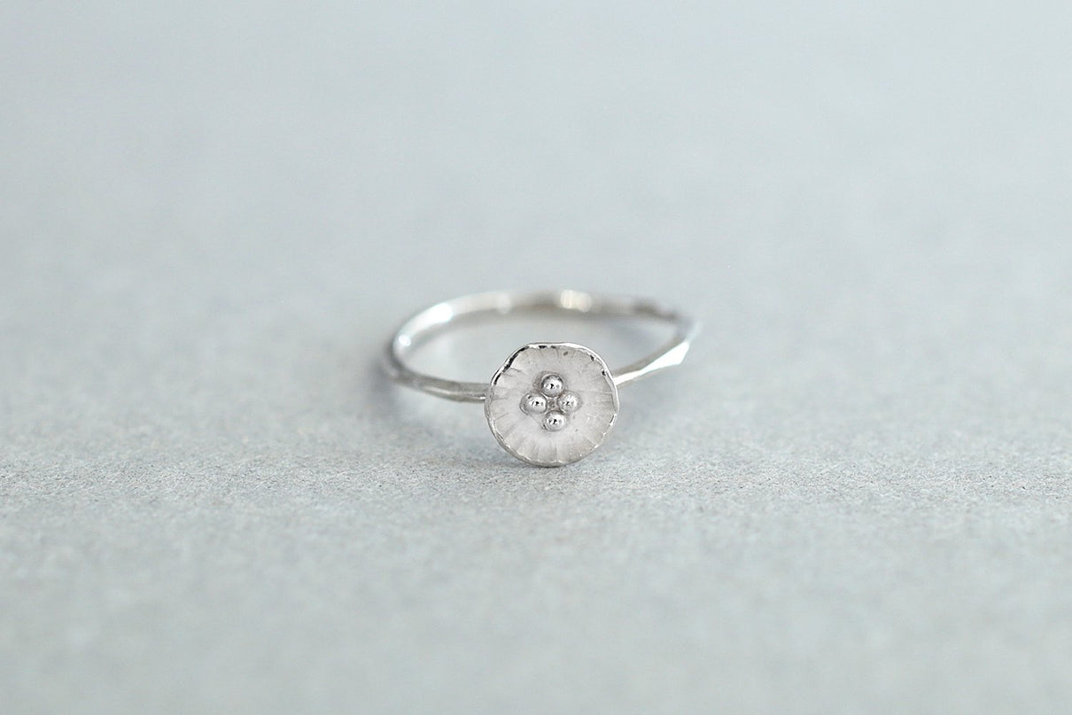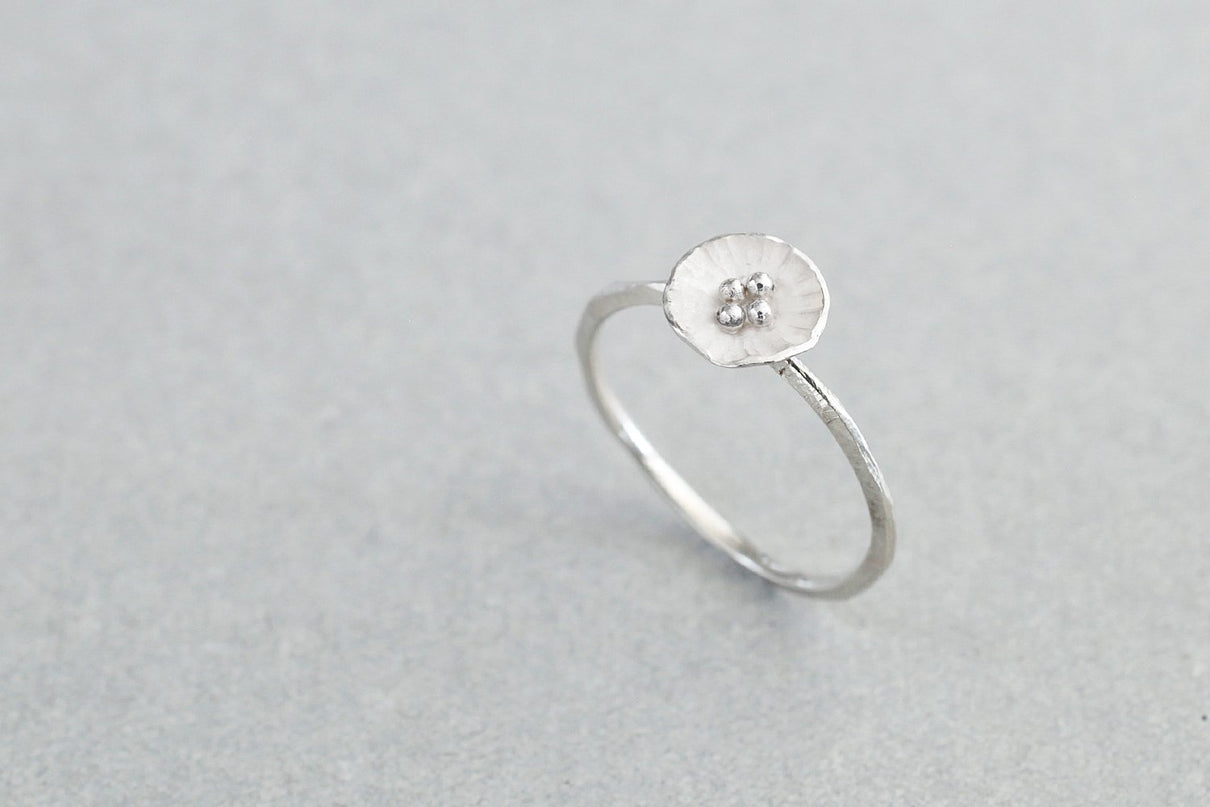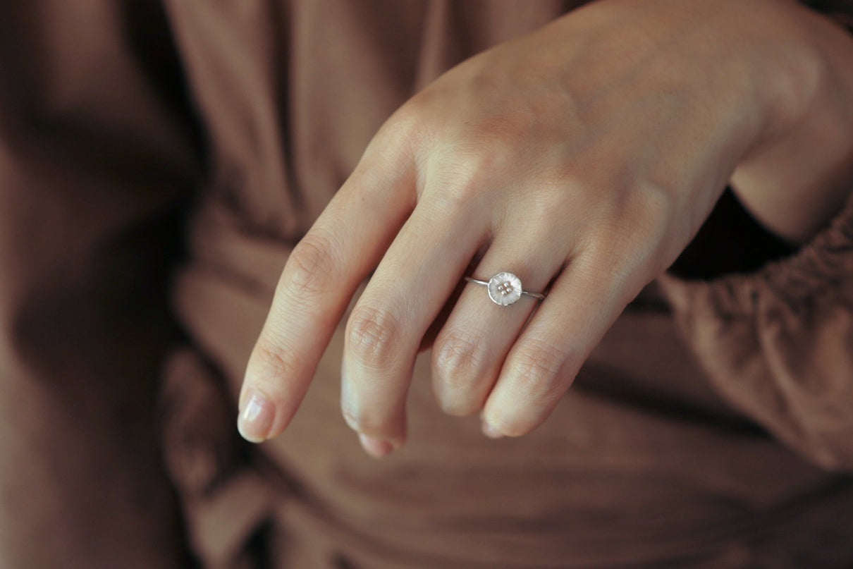 草むらの中、よく目を凝らすとさりげなく咲いている小さな小さなお花たち。一輪がさりげなく手元を彩るリングです。花びらのテクスチャーは手で少しずつ叩いて付けられており、有機的で自然な存在感を放ちます。Silverの内側はマットな白い焼き色を残し、スモーキーな印象に。Mixはシルバーにきらりと艶めくK18の粒のコントラストが愛らしく、K18は品の良さが引き立ちます。華奢な枝の部分にも繊細なテクスチャーが入っており、動きを感じるようお仕立てしました。重ねづけやピンキーリングにもおすすめです。