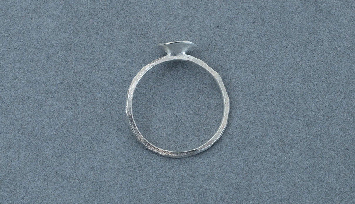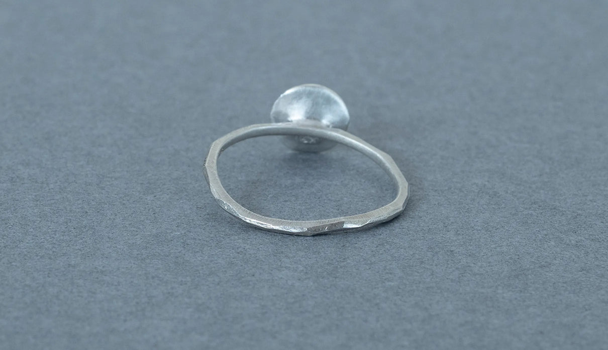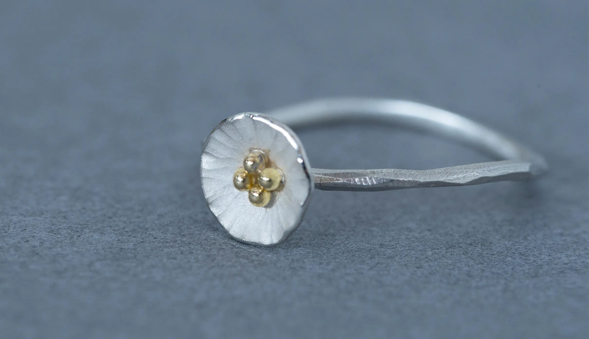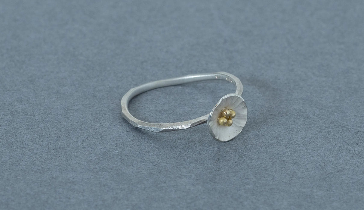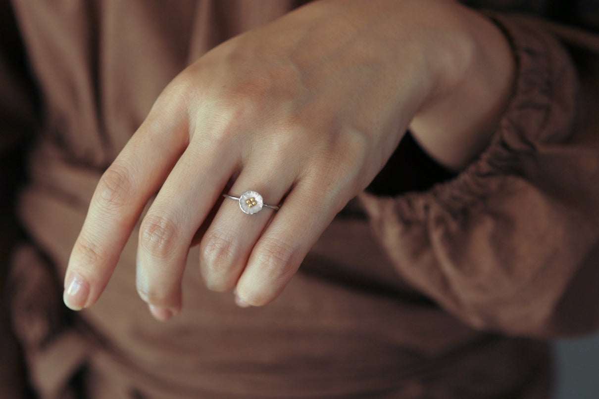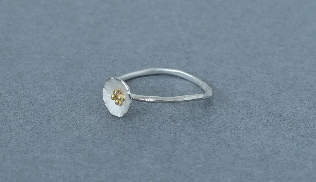 草むらの中、よく目を凝らすとさりげなく咲いている小さな小さなお花たち。一輪がさりげなく手元を彩るリングです。花びらのテクスチャーは手で少しずつ叩いて付けられており、有機的で自然な存在感を放ちます。Silverの内側はマットな白い焼き色を残し、スモーキーな印象に。Mixはシルバーにきらりと艶めくK18の粒のコントラストが愛らしく、K18は品の良さが引き立ちます。華奢な枝の部分にも繊細なテクスチャーが入っており、動きを感じるようお仕立てしました。重ねづけやピンキーリングにもおすすめです。
