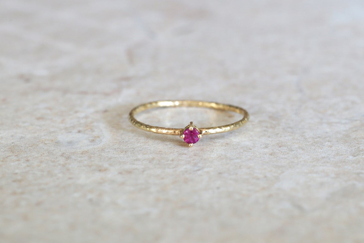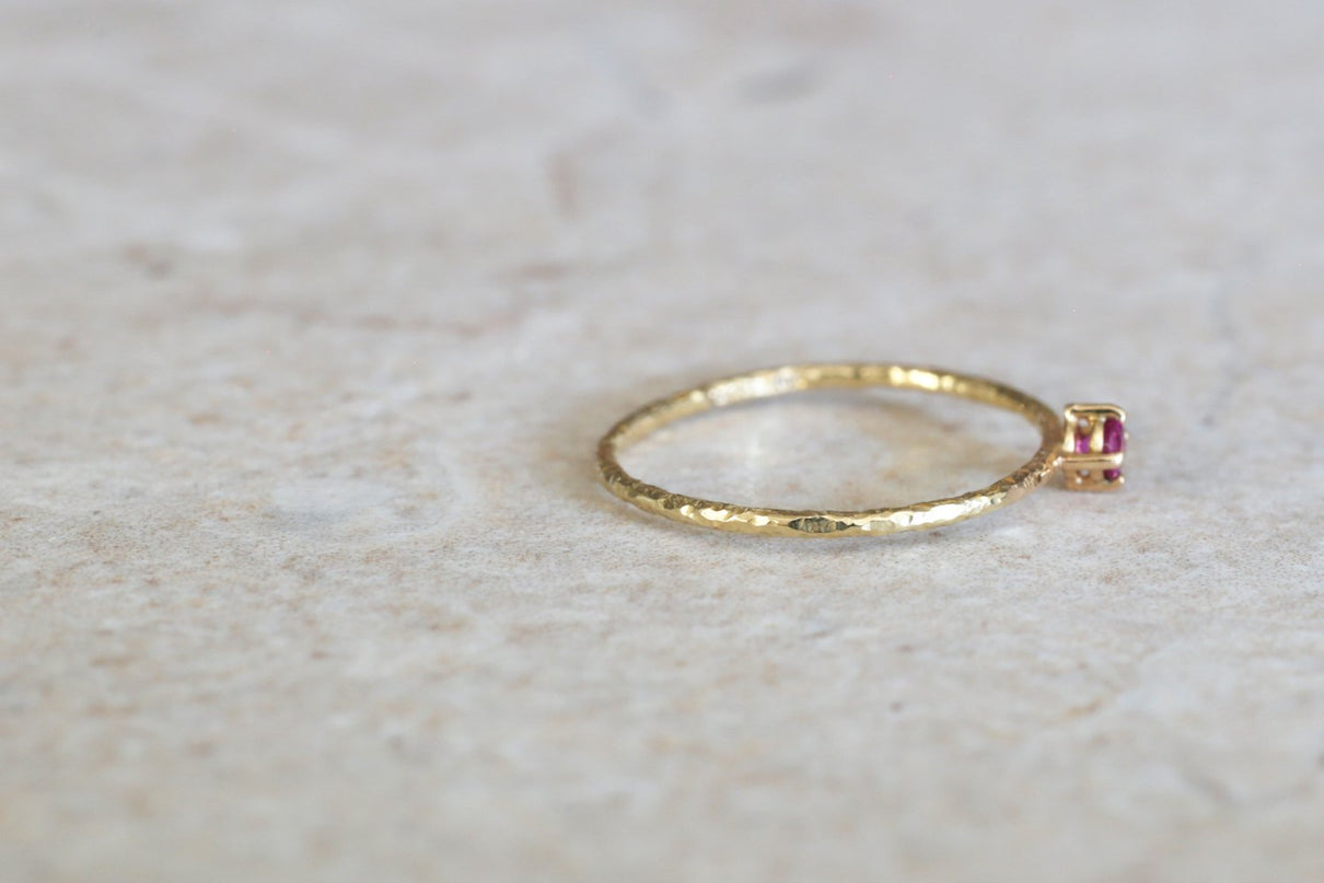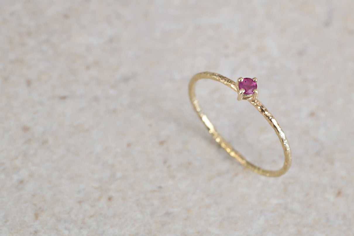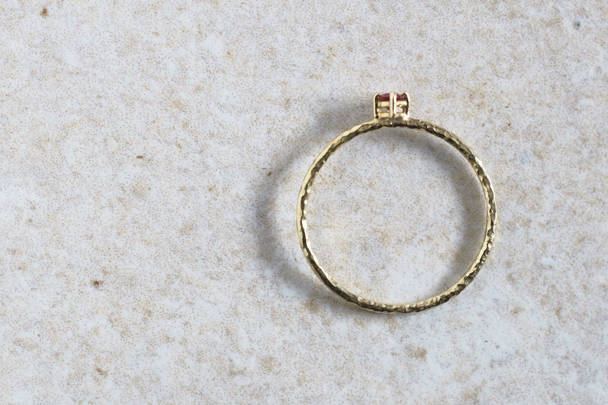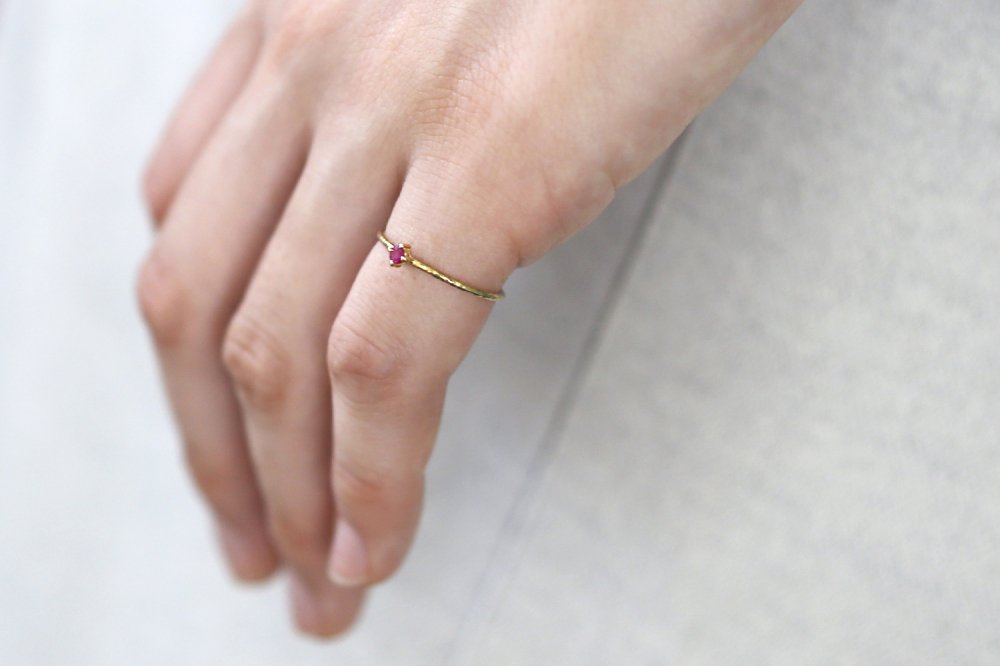 Twig(小枝)と名付けたリング。幅約1mmと華奢な印象の中にも樹の表皮の様な凸凹とした細かなテクスチャーが光り、その中央には上質な深紅色の小さなルビーをとめました。ピンキーリングや重ね着けにもお勧めのリングです。