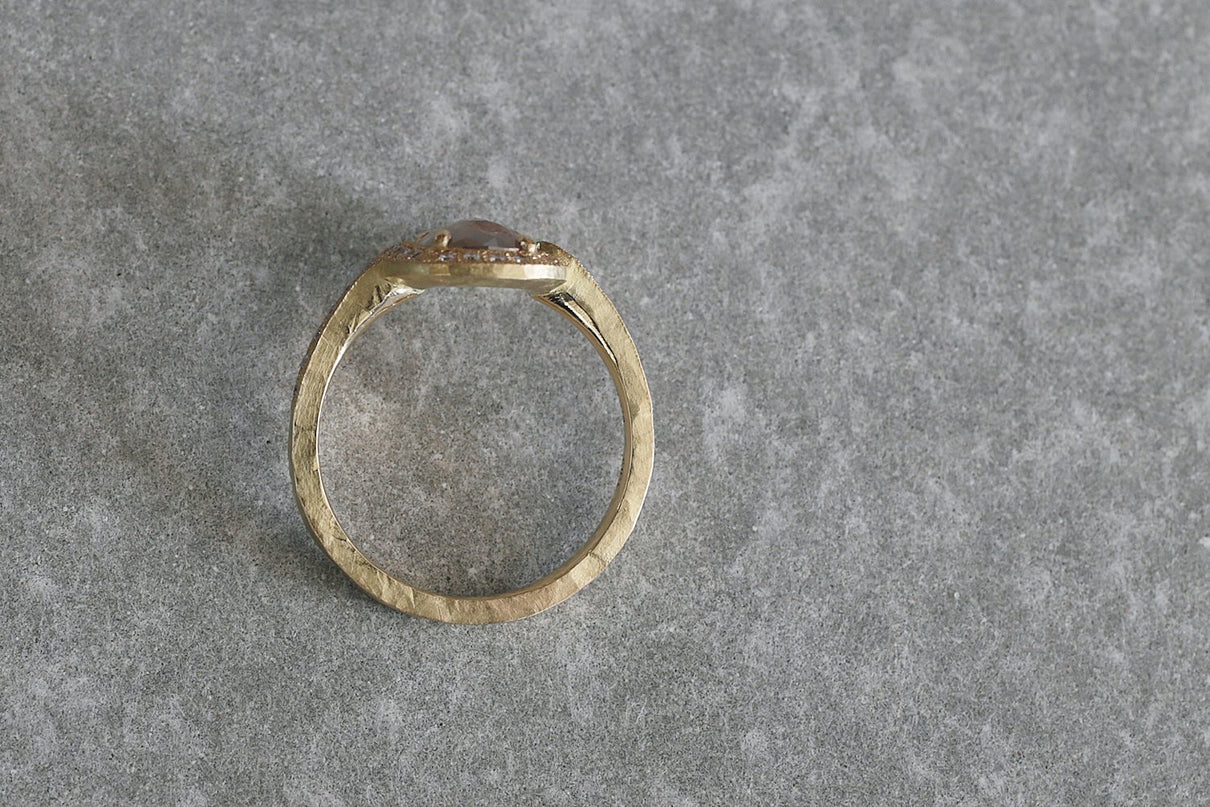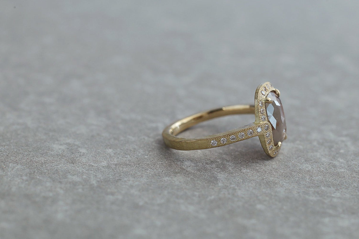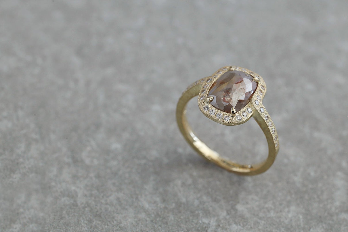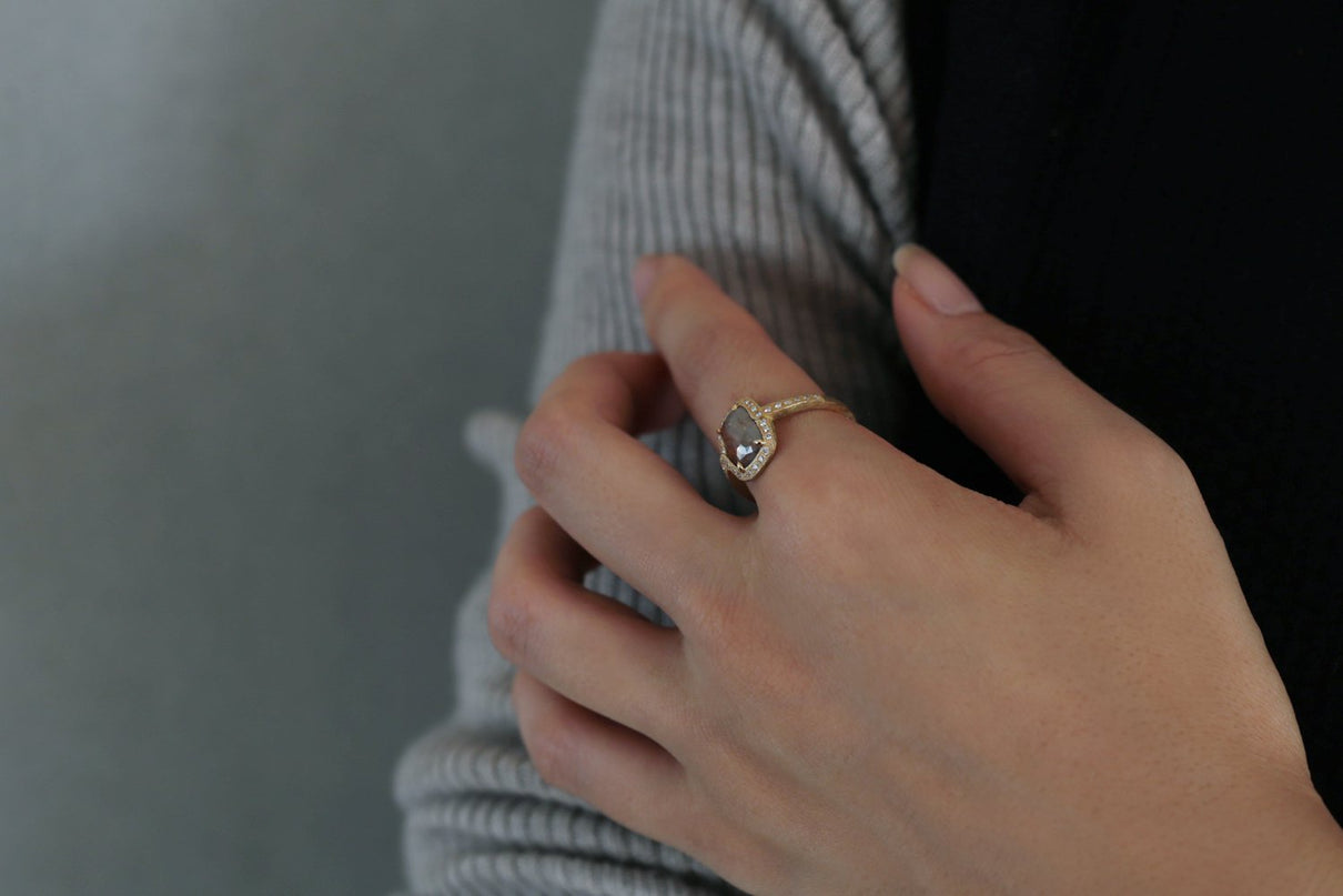 1ct 以上の存在感あるファンシーカラーダイヤモンドを 小さなメレダイヤモンドと細かな手仕事のミル打ちで贅沢に縁取った、華やかさ際立つ1点もののリング。クラシカルで密度がありながらも 機械的で整いきった形ではなく、 フリーハンドで丁寧に描いたような 僅かなゆらぎを敢えて全体に持たせる事で、どこか温かみを感じるプリミティブな美しさとハイジュエリーとしての存在感を兼ね合わせました。 霧がかったグレイッシュな色味の中に、 挿し色のようなブラウンが閉じ込められた 個性光るダイヤモンドが絵画のように美しく輝き、小さなメレダイヤモンドは選りすぐりの高品質のものを使用。 アシンメトリーにつながった枠もアクセントになっています。 表から見えない裏面まで 柔らかなアールやテクスチャーを施すことで 着け心地の良さを追求しました。