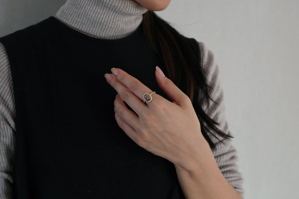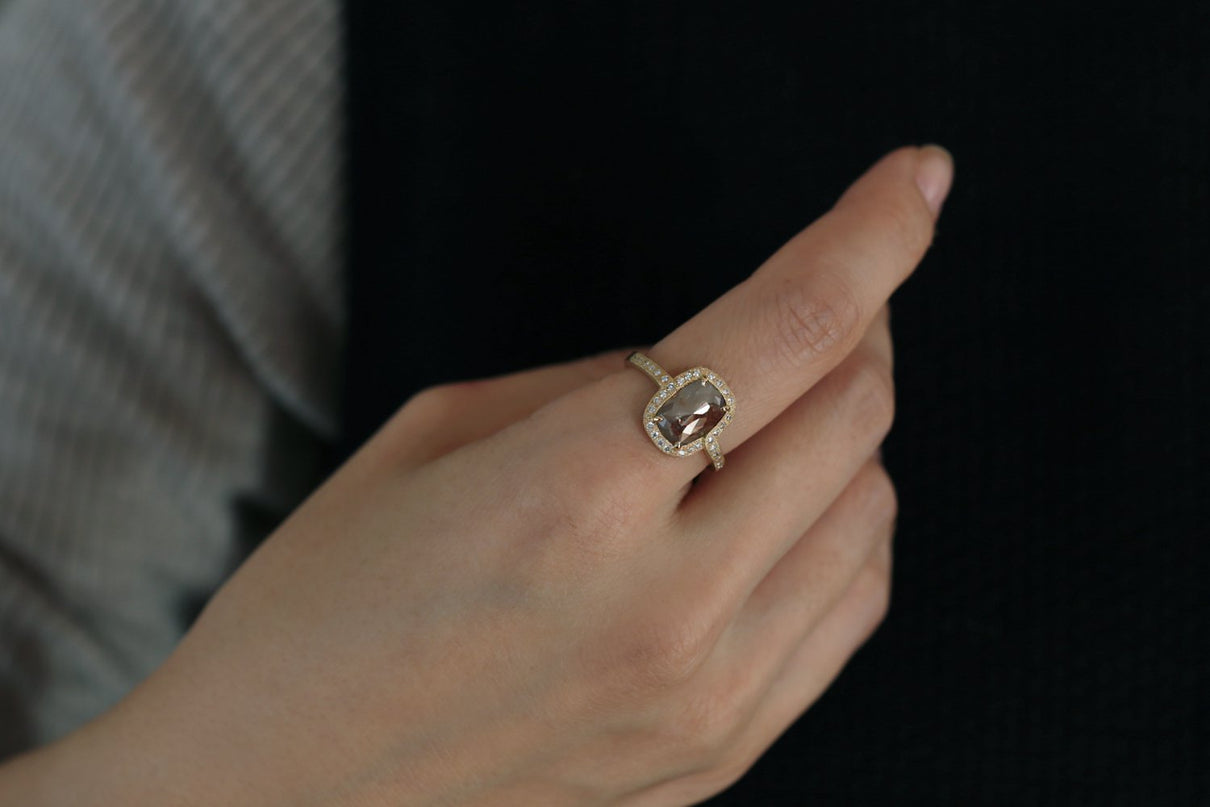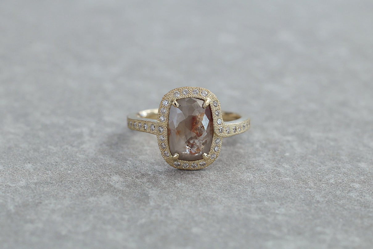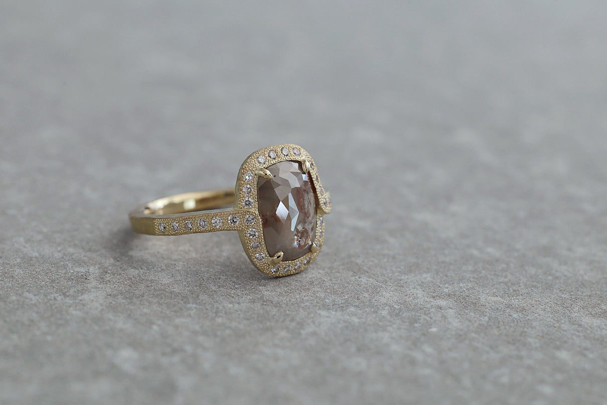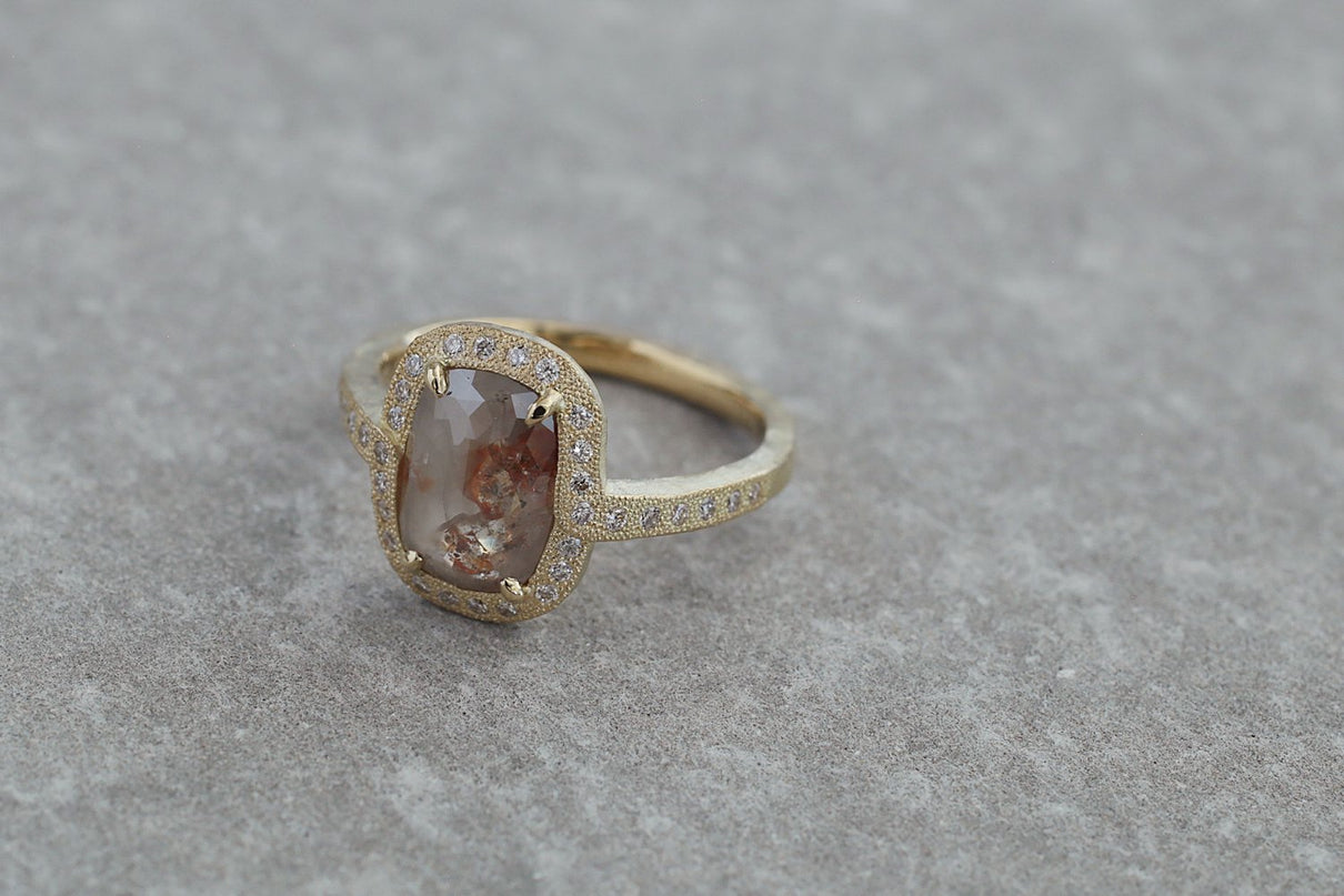 1ct 以上の存在感あるファンシーカラーダイヤモンドを 小さなメレダイヤモンドと細かな手仕事のミル打ちで贅沢に縁取った、華やかさ際立つ1点もののリング。クラシカルで密度がありながらも 機械的で整いきった形ではなく、 フリーハンドで丁寧に描いたような 僅かなゆらぎを敢えて全体に持たせる事で、どこか温かみを感じるプリミティブな美しさとハイジュエリーとしての存在感を兼ね合わせました。 霧がかったグレイッシュな色味の中に、 挿し色のようなブラウンが閉じ込められた 個性光るダイヤモンドが絵画のように美しく輝き、小さなメレダイヤモンドは選りすぐりの高品質のものを使用。 アシンメトリーにつながった枠もアクセントになっています。 表から見えない裏面まで 柔らかなアールやテクスチャーを施すことで 着け心地の良さを追求しました。