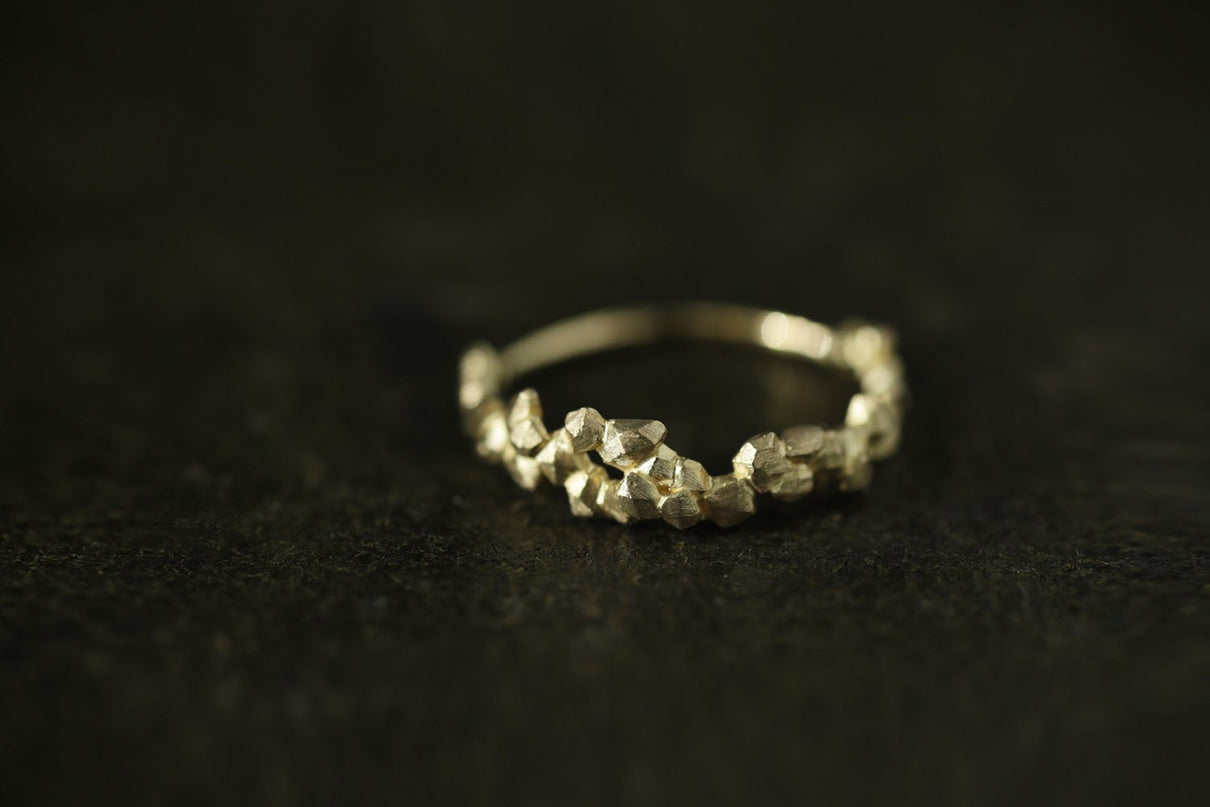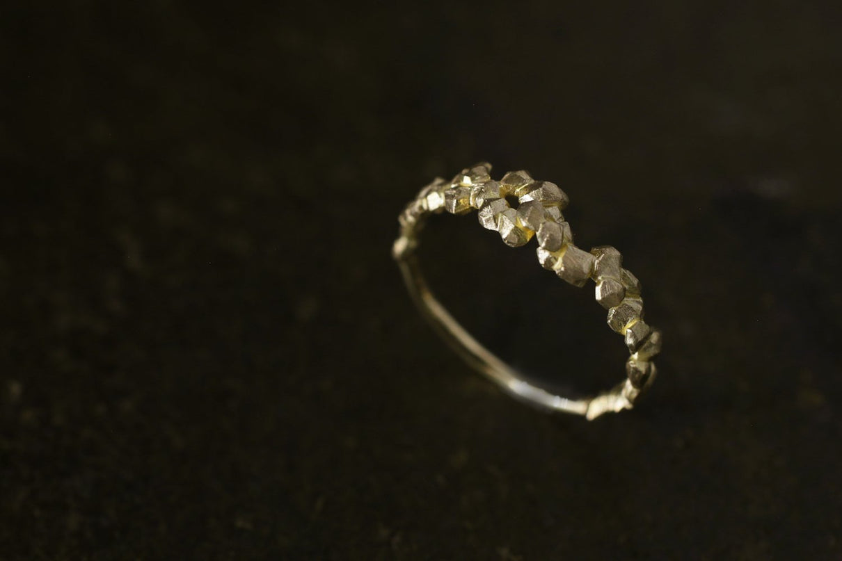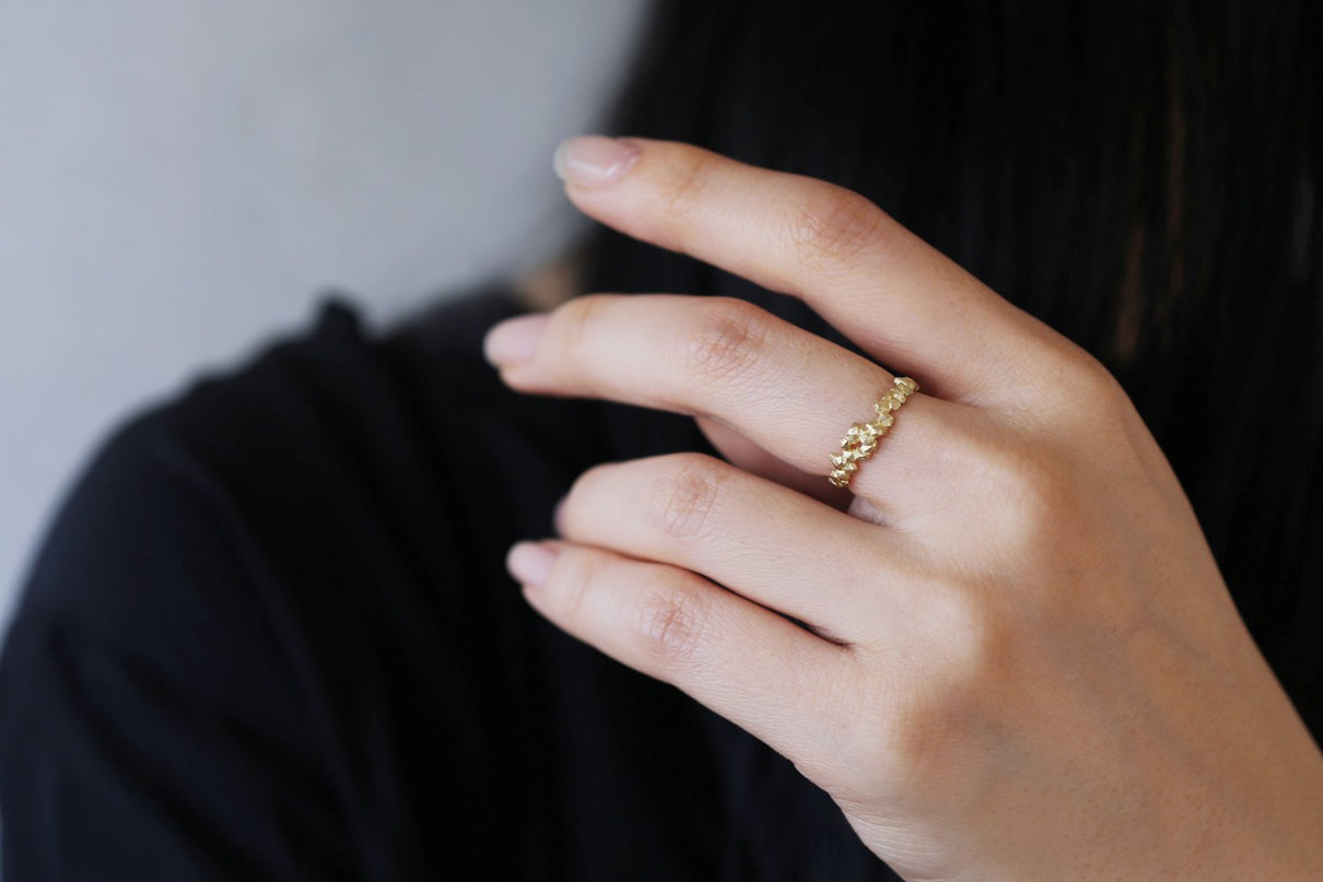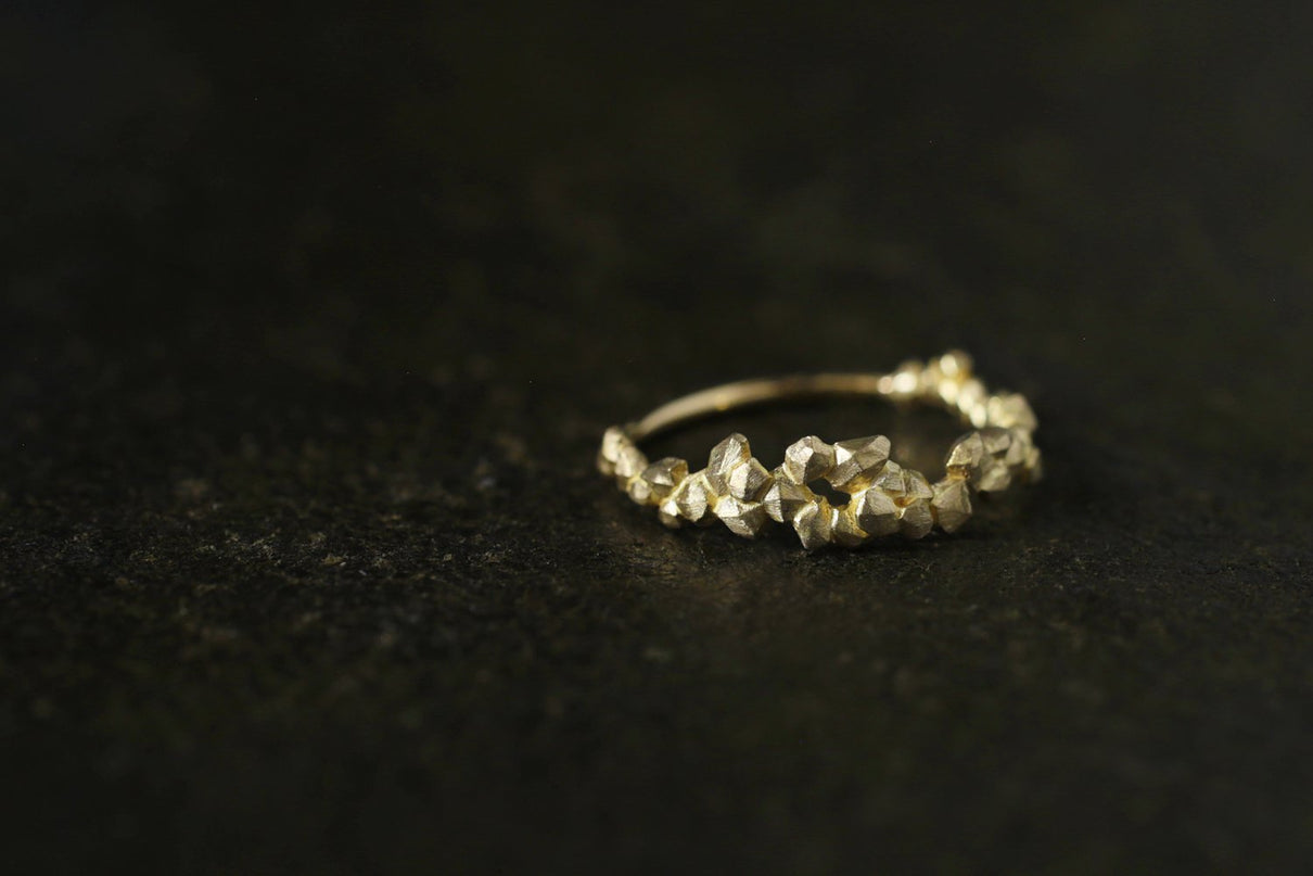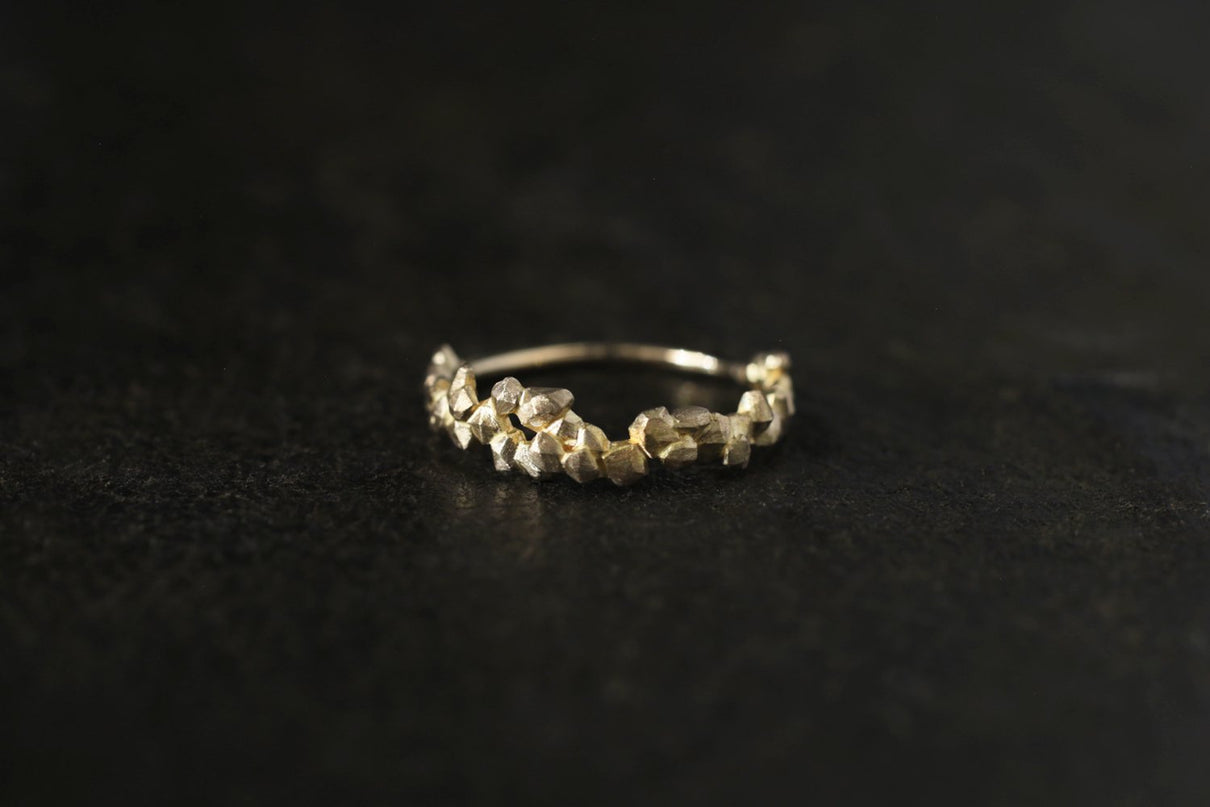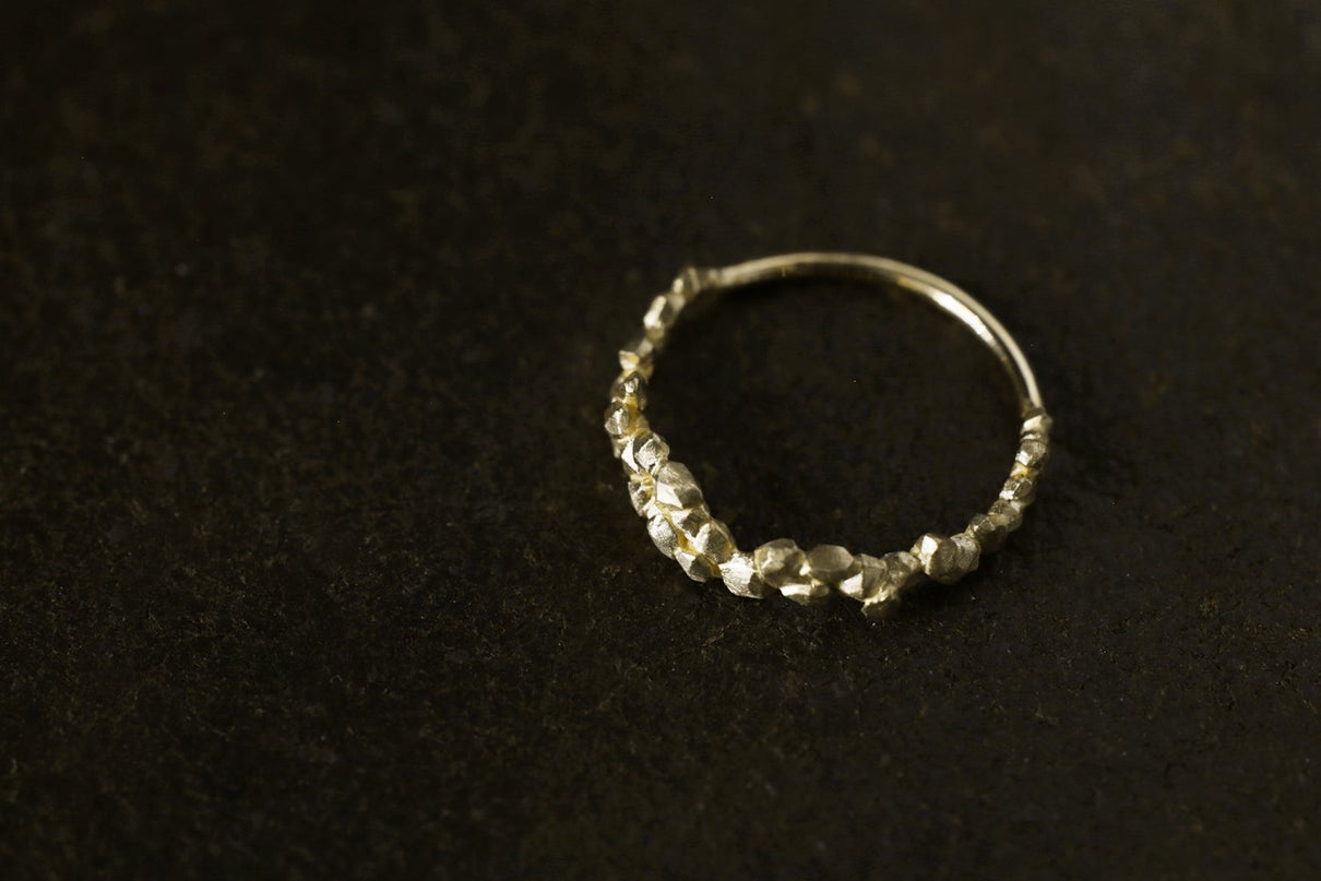 森の奥にひそむ、小さきもの達の静かなる営みをモチーフにした"Whisper"。動きのある様々な形が群をなし、一つのフォルムを形成する有機的なリング。華奢ながらも、そのランダムな集まりが存在感を放ちます。1本でももちろん、重ね着けをしても日々楽しんで頂けるアイテムです。