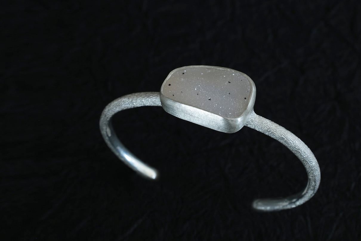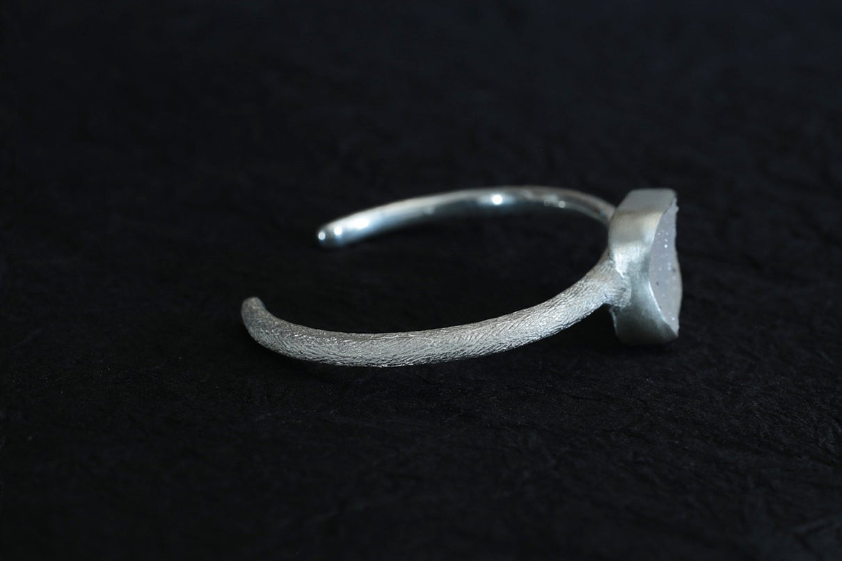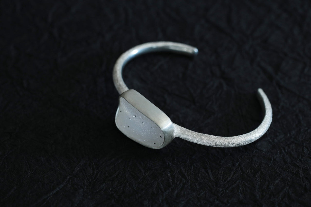 天然石のドゥルージークオーツを用いた1点もののバングル。乳白色の細かな結晶群が光を反射し、砂糖菓子のようにきらきらと美しく煌めきます。石の持つゆるやかなフォルムに合わせ、台座や腕部分を肌触りの良い不均一な表情をしたマットのテクスチャーで仕立てることによって、より物としての存在感・魅力を引き出すように仕立てました。石の台座になっている裏側のフォルムは抜いて軽やかに、また手首が触れる腕部分の内側は光沢仕上げにすることで着け心地にもこだわりました。日々の装いに加えるだけで、主役となってくれるアイテムです。