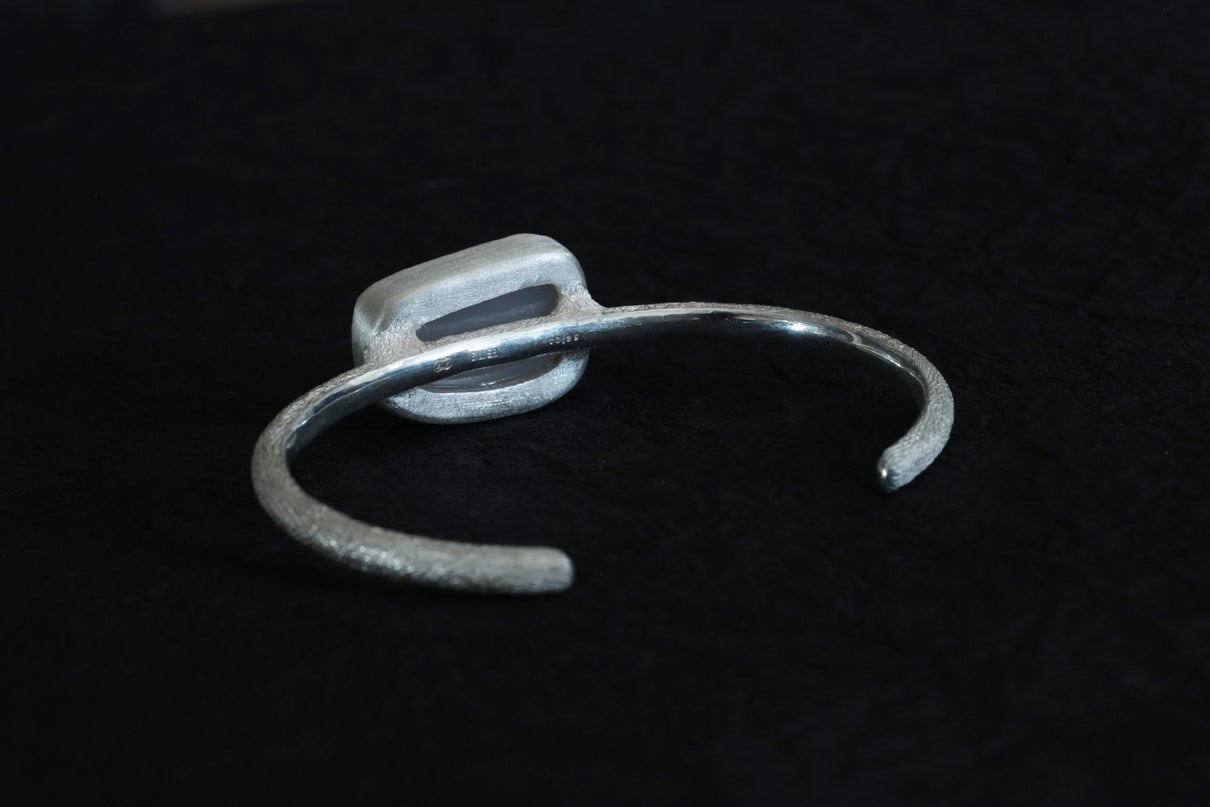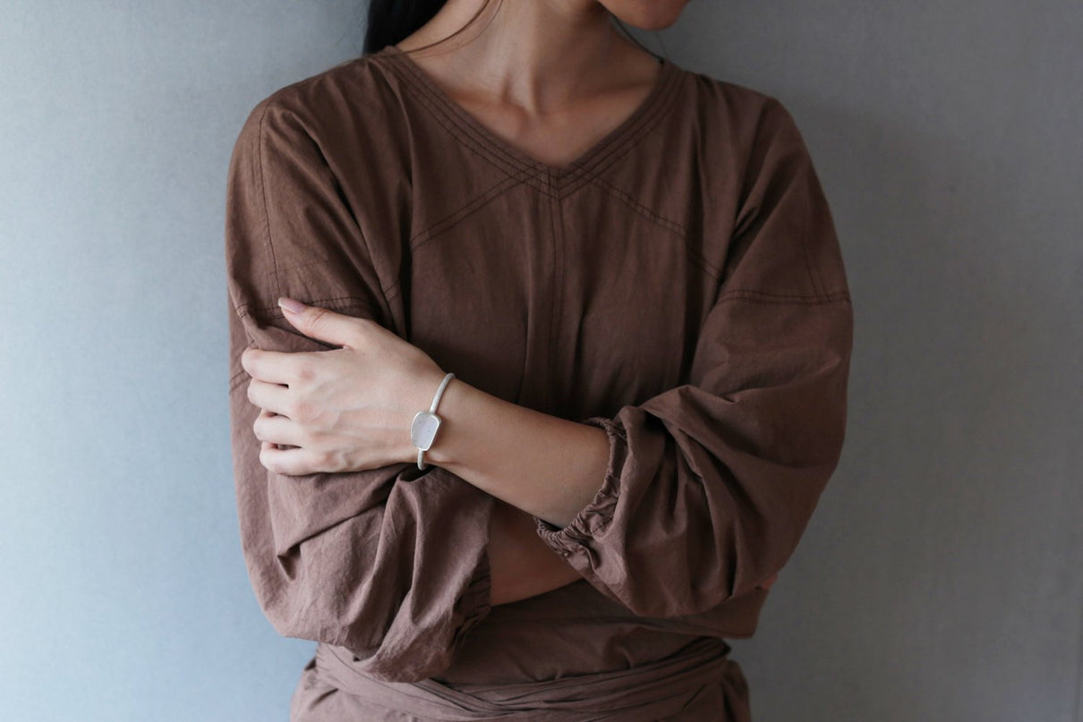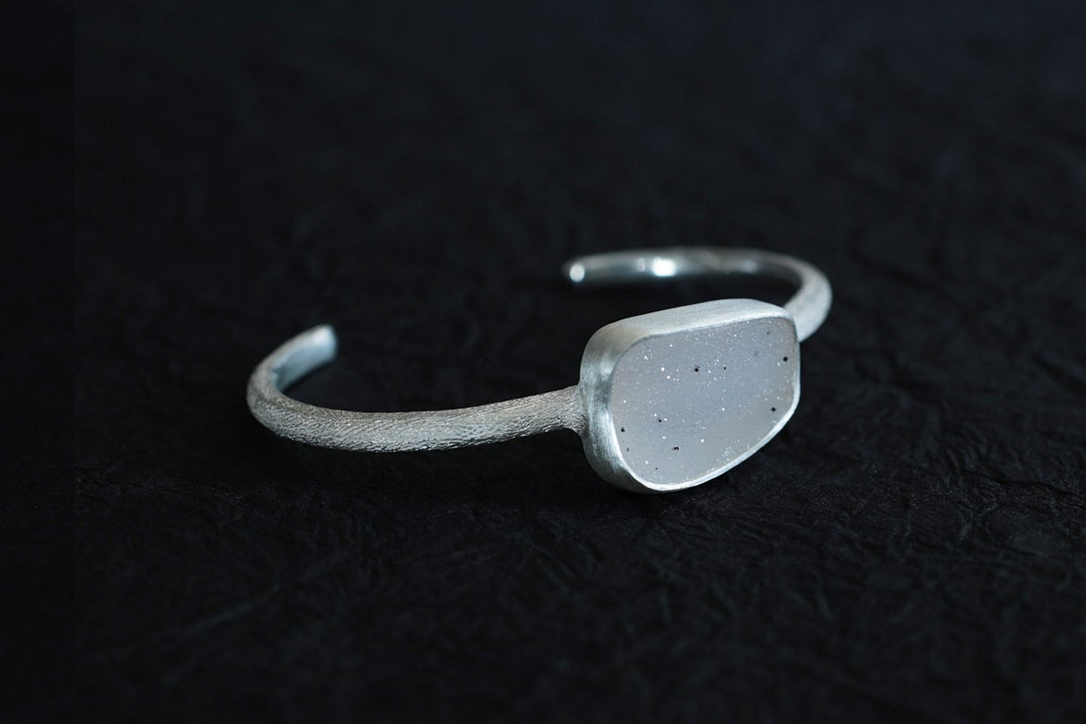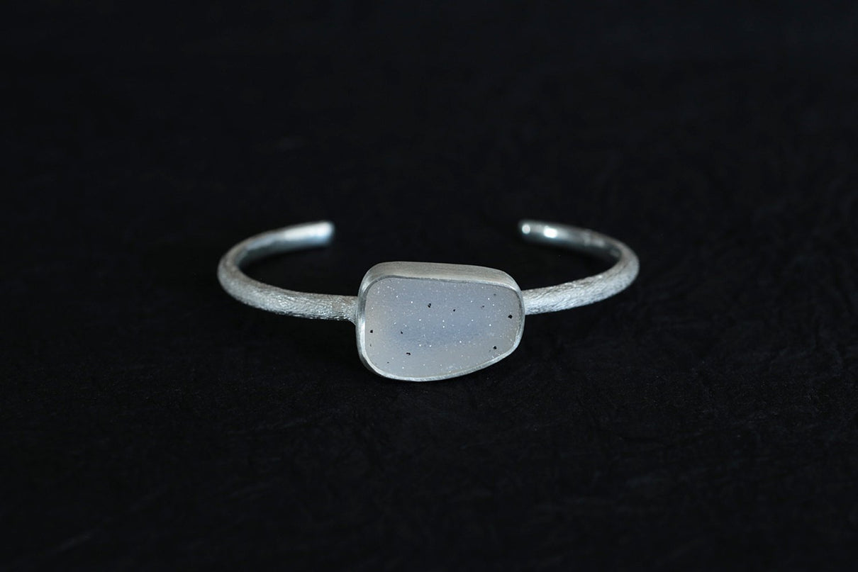 天然石のドゥルージークオーツを用いた1点もののバングル。乳白色の細かな結晶群が光を反射し、砂糖菓子のようにきらきらと美しく煌めきます。石の持つゆるやかなフォルムに合わせ、台座や腕部分を肌触りの良い不均一な表情をしたマットのテクスチャーで仕立てることによって、より物としての存在感・魅力を引き出すように仕立てました。石の台座になっている裏側のフォルムは抜いて軽やかに、また手首が触れる腕部分の内側は光沢仕上げにすることで着け心地にもこだわりました。日々の装いに加えるだけで、主役となってくれるアイテムです。