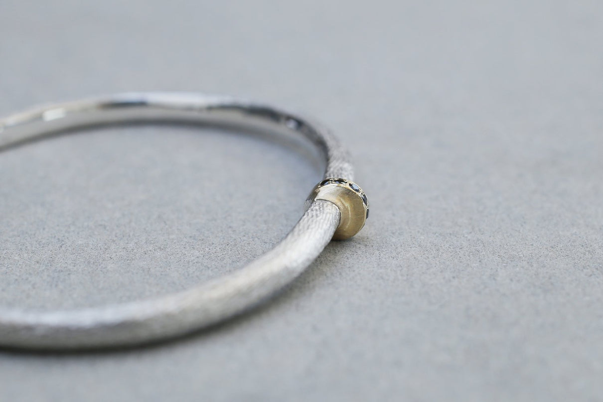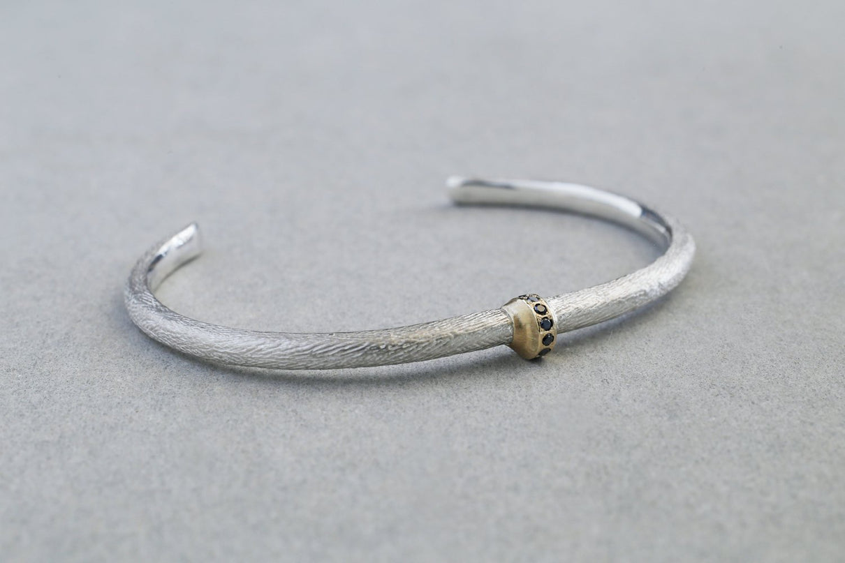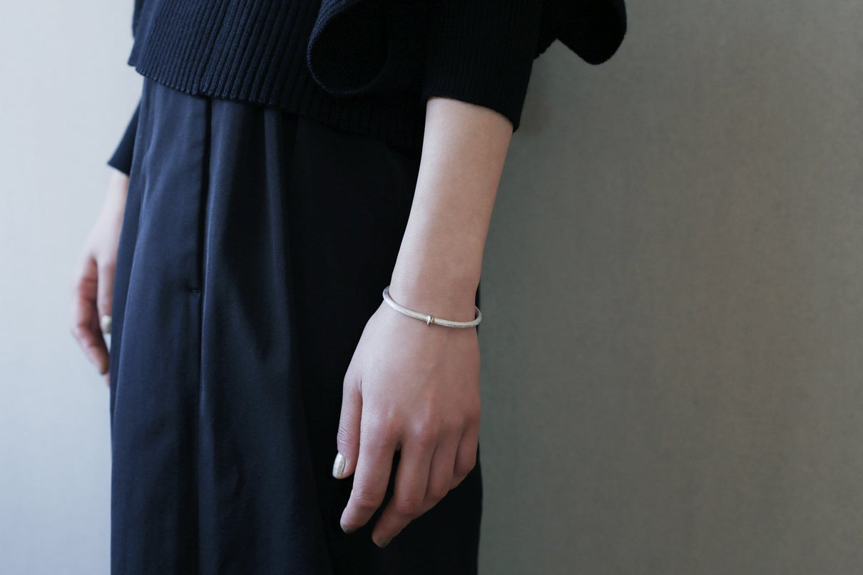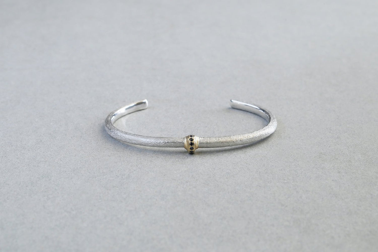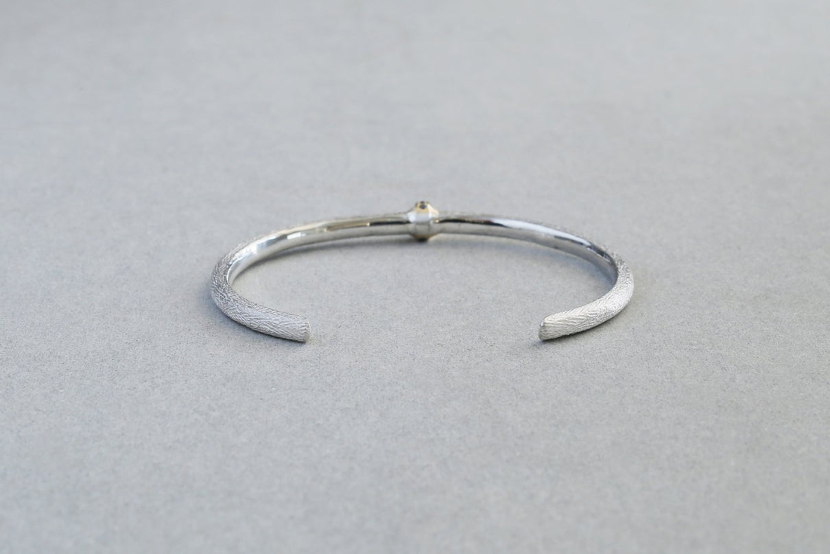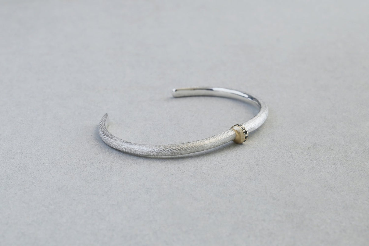 生物の表皮を覆う有機的で緻密な表情をモチーフにしたCoatシリーズ。細かな彫り模様が施された表面には、凹はマット、凸は半光沢仕上げと、それぞれで質感を微妙に変化させた落ち着きある表情へ。ゴールド部分はシルバー部分とコントラストをもたせたヘアライン仕上げで、そこに蜘蛛の目からインスピレーションを得たブラックダイヤモンドをあしらった存在感のあるバングルです。
