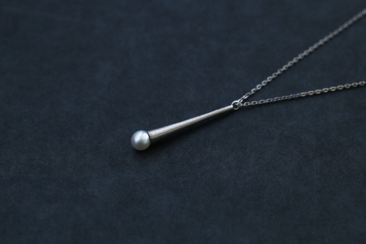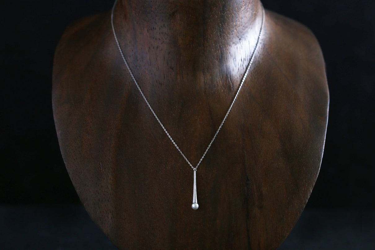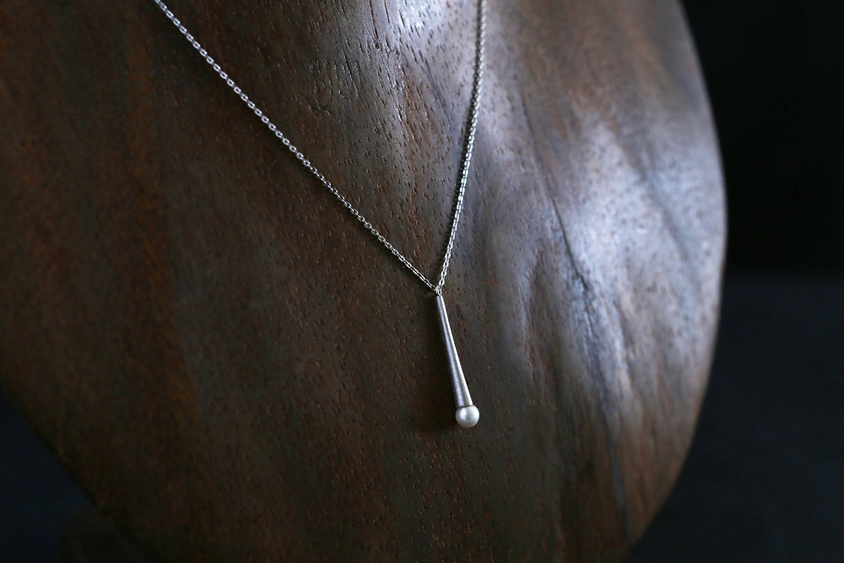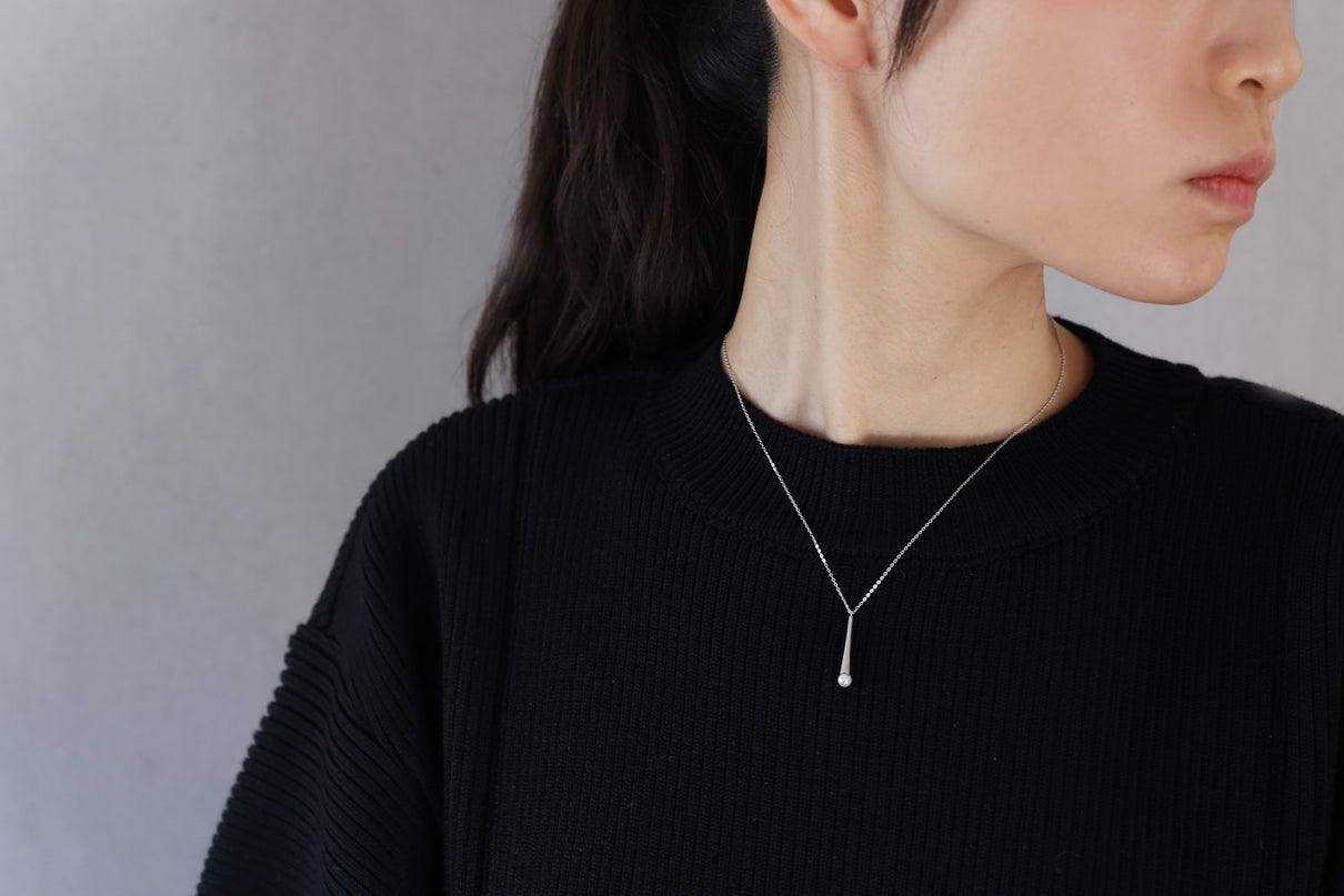 雨粒の軌跡のようなフォルムのシルバーに、艶やかな淡水パールを留めたネックレス。長い円錐型の部分にはマットなテクスチャーを施し、"雨滴"のように、凛と静かに滴るシャープなデザインにしました。縦ラインのすっきりとした雰囲気のネックレスは、胸元でコーディネートのアクセントになるように、ややロング丈に仕立てています。ホワイトを基調とした美しい照りをもつ淡水パールはシンプルでありながらも、個性が光るアイテムです。