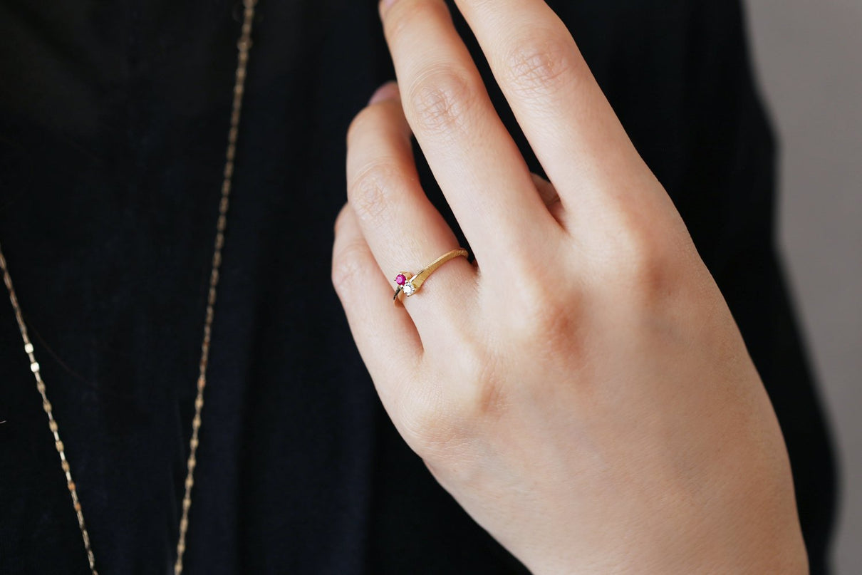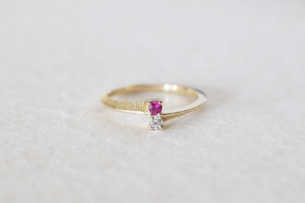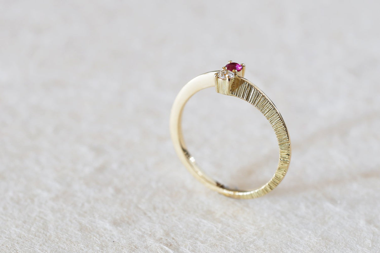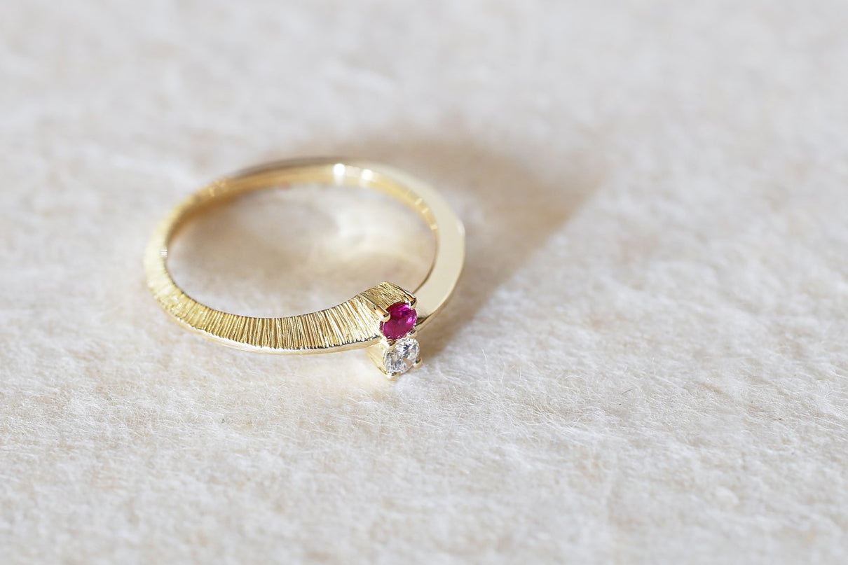 【ルビー】輝きが美しい良質なルビーとダイヤモンドを留めたリング。縦に2つ並んだルビーとクリアダイヤモンドと、正面から見た時に極細の艶テクスチャーを施したK18ゴールドの極細線が華奢な雰囲気を醸します。無数の線で描く緻密な手彫り装飾面と、艶めく光沢面が半周ずつアシンメトリーになったリング側面のデザインと相まって角度によって様々な表情を見せてくれ、装いにひと匙の個性と凛とした雰囲気を添えてくれるアイテム。それぞれ4月、7月の誕生石であるダイヤモンドとルビーは、特別なお守りとして贈り物にも最適です。