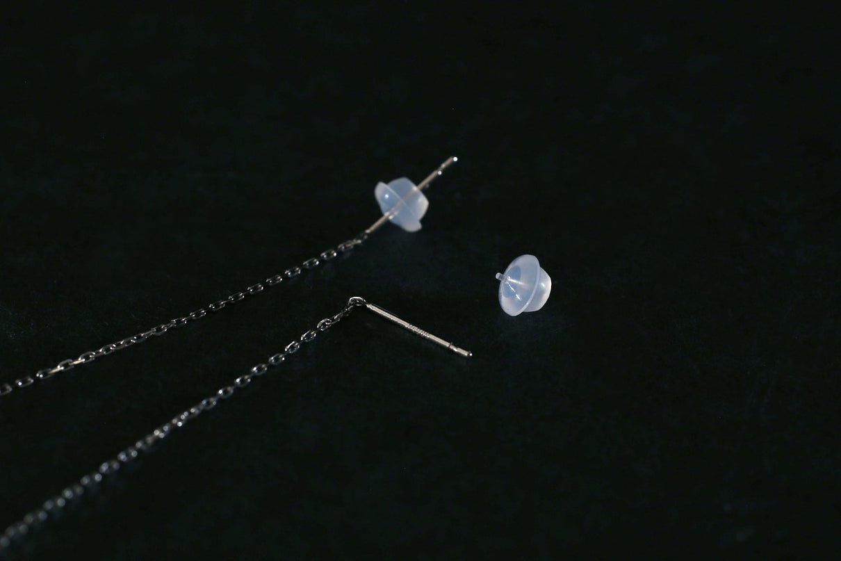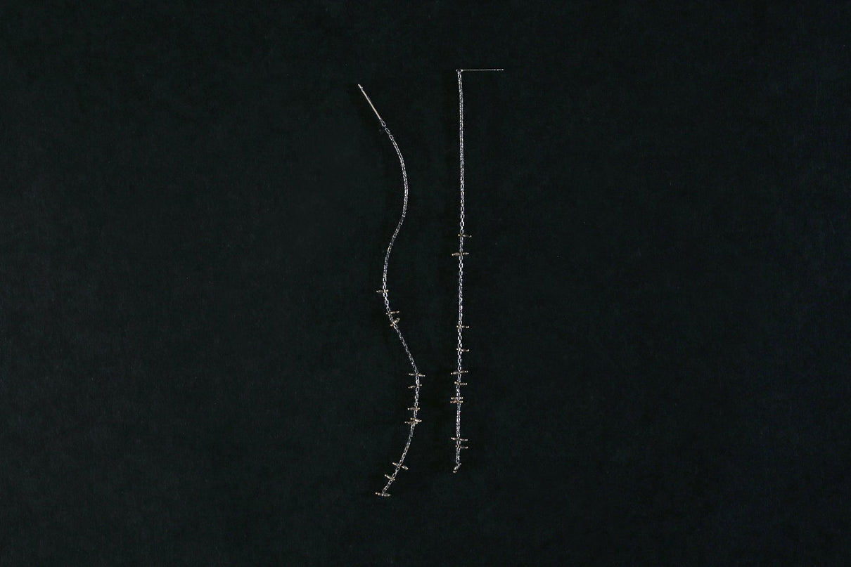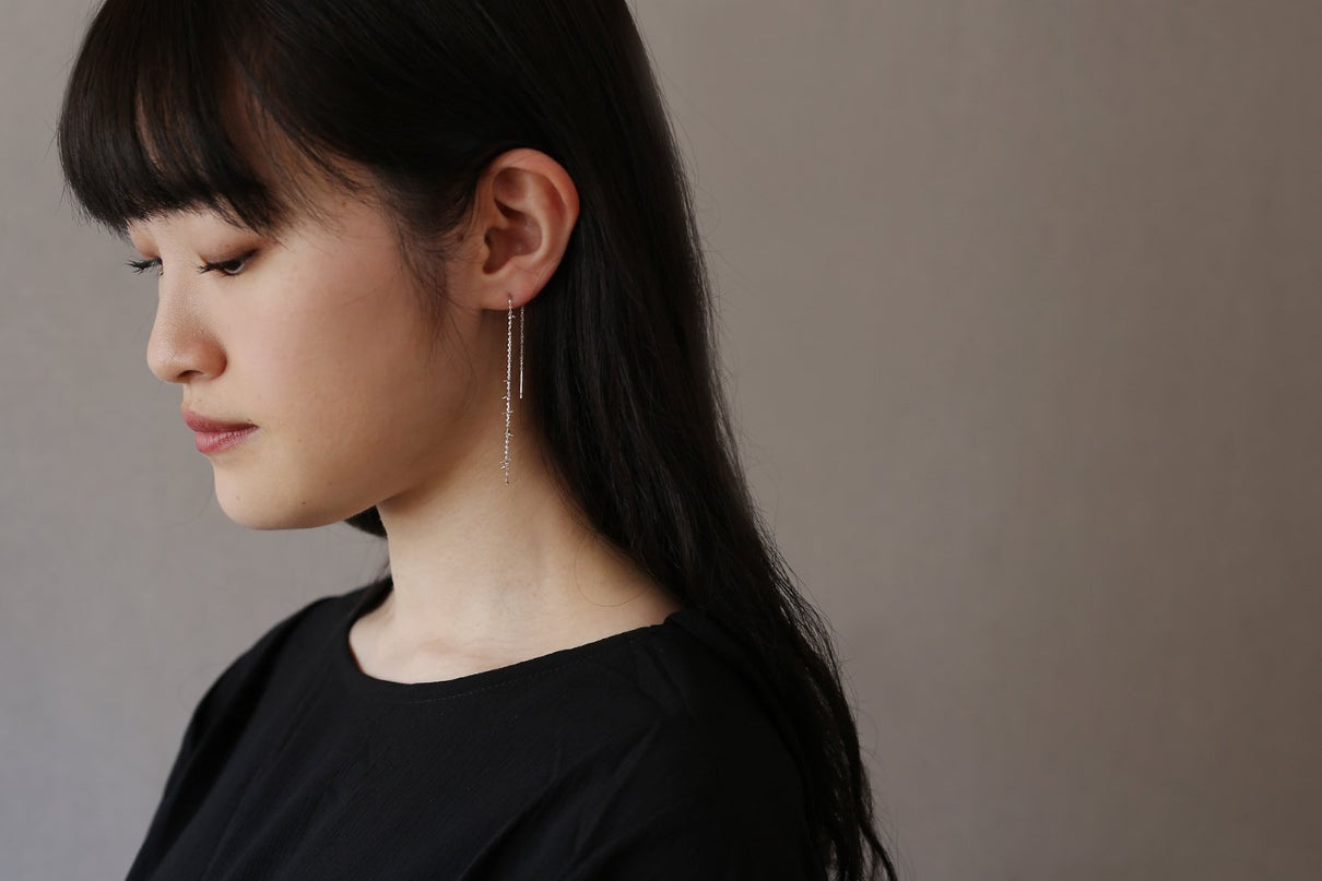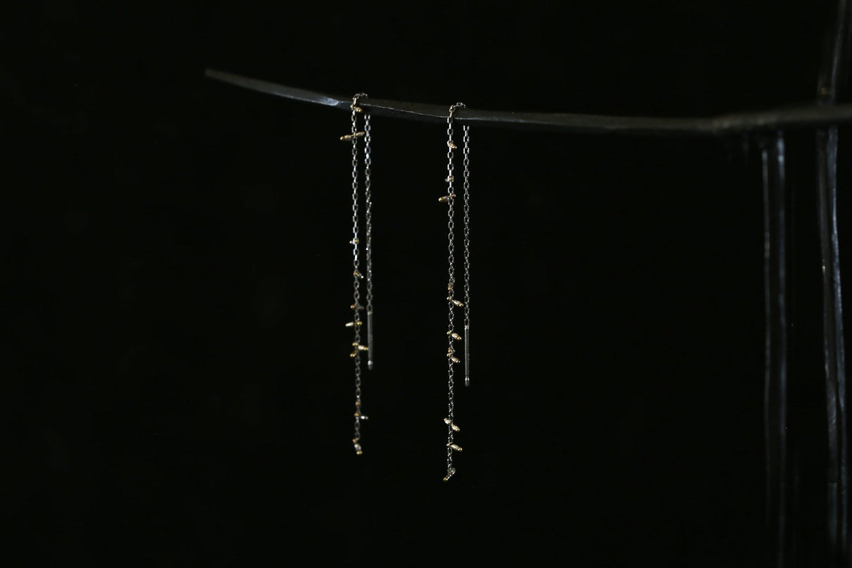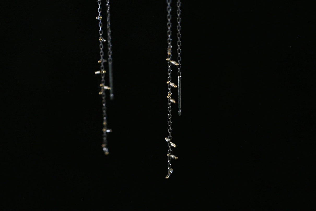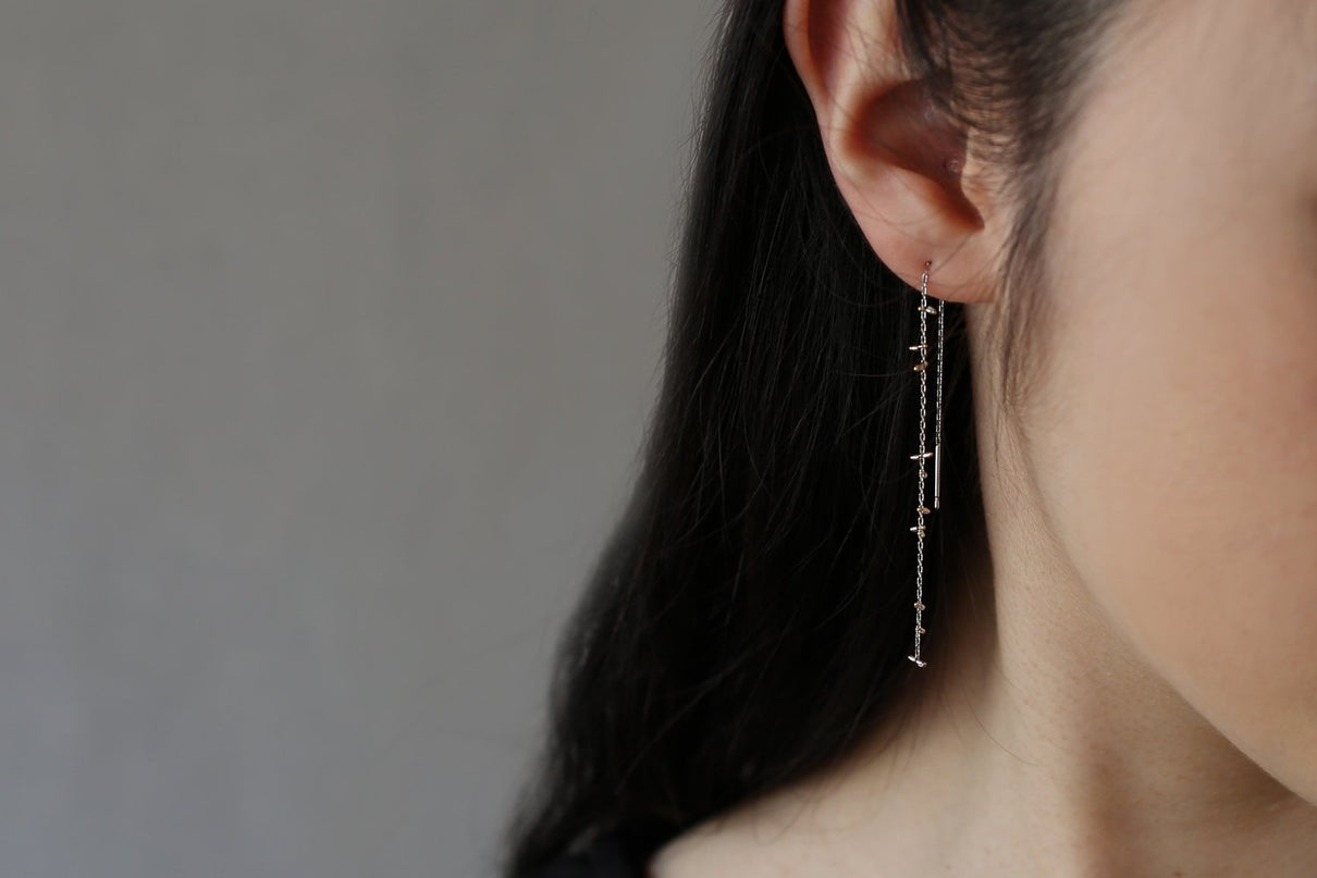 細めのチェーンにランダムに付いた銀色の繊細なカレンシルバービーズのアメリカンピアス。カレンシルバーの先端はゴールドになっていて、光の加減でさり気なく輝きます。動く度に揺れるチェーンは、顔まわりを華やかに彩り、上品な印象のアイテムです。※カレンシルバービーズとは、タイの山岳で暮らすカレン族によって一つひとつ手作業で作られたシルバービーズ。
