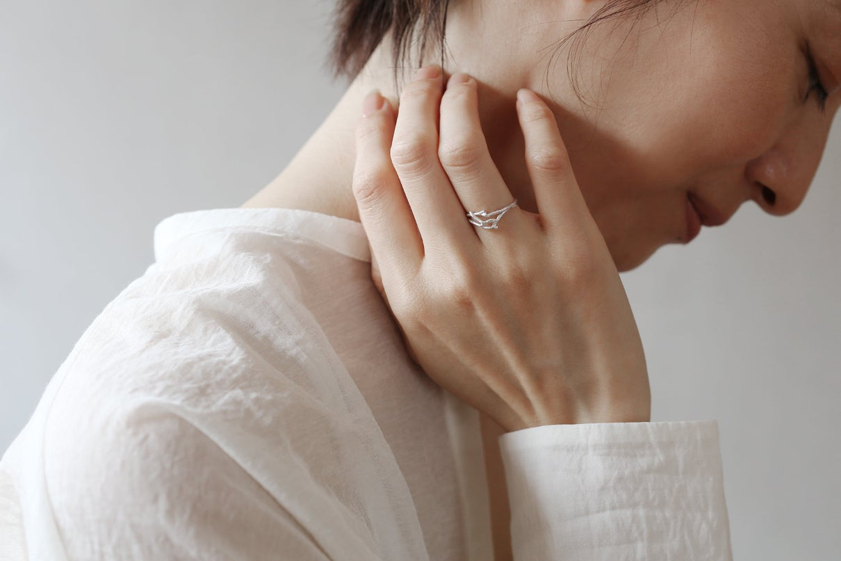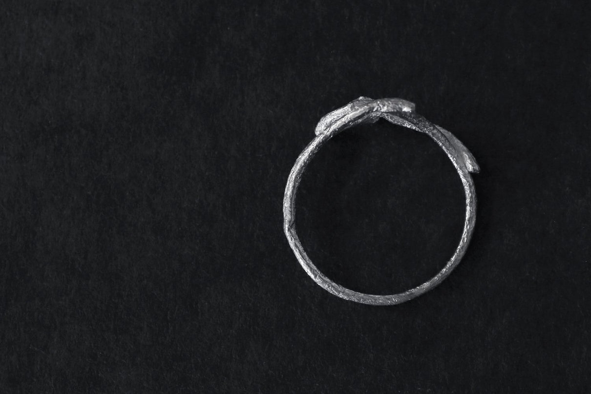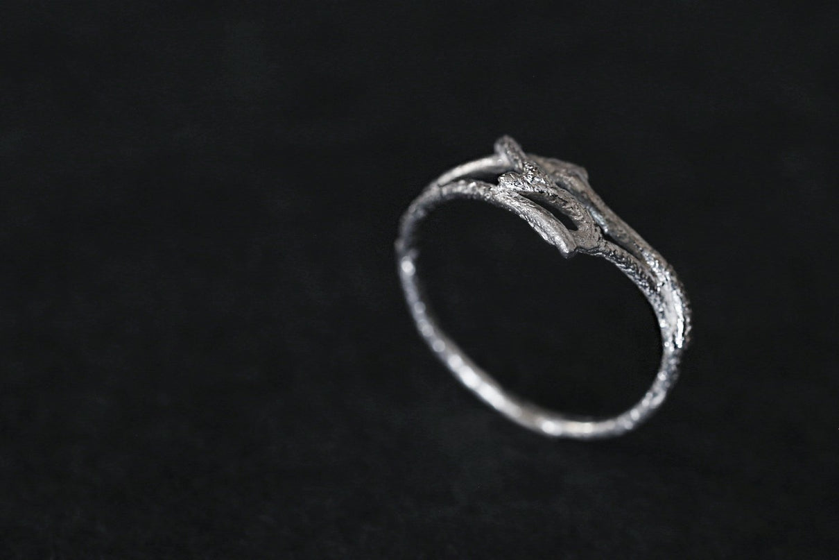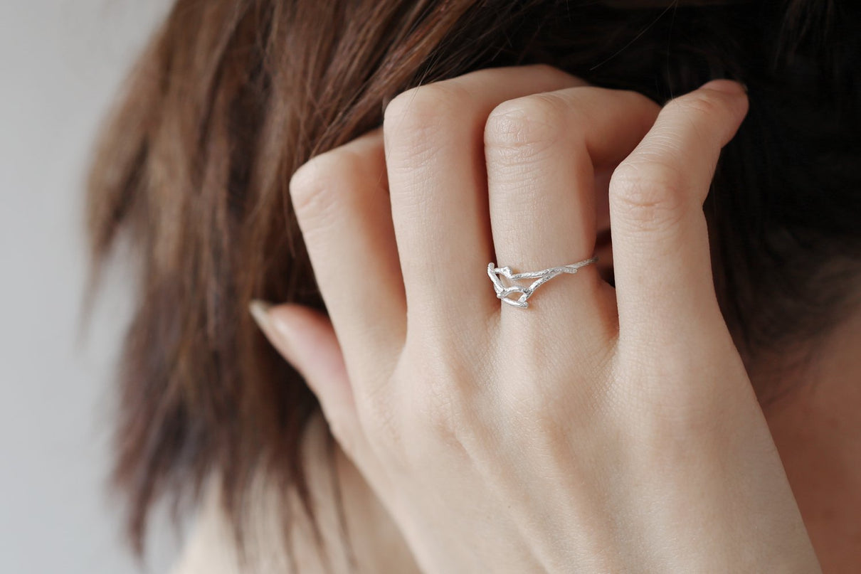 小枝を編んで作ったような抜け感のある独創的なフォルムのリング。小枝の表皮に見られる繊細な模様が刻まれ、身につけると自然と一体化するような、聖なる雰囲気を纏うアイテムです。