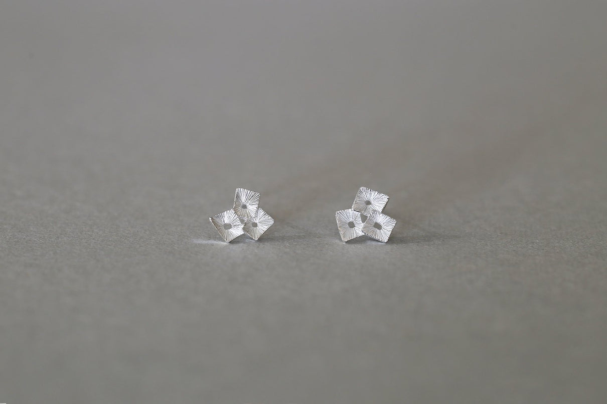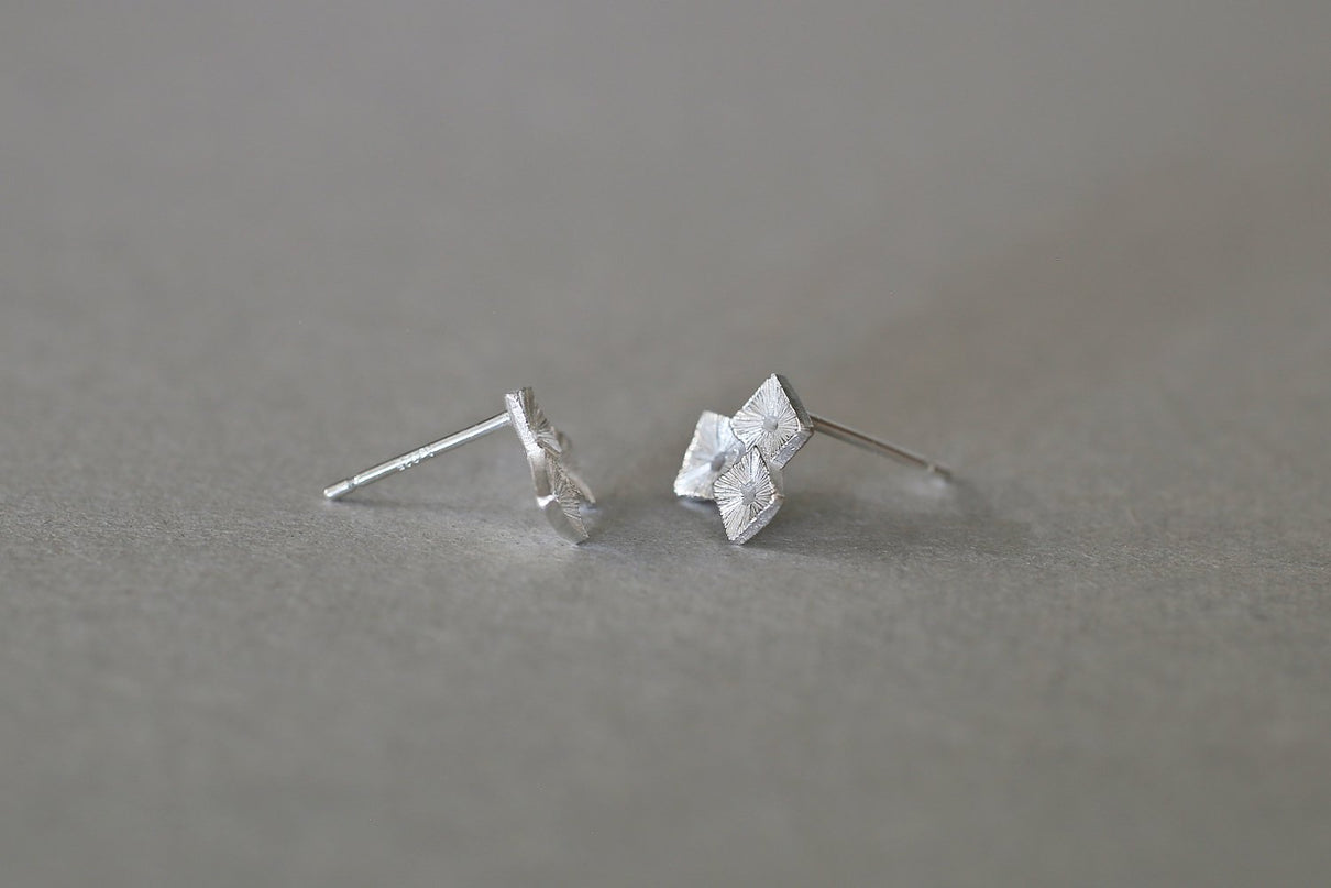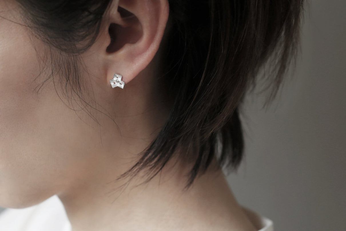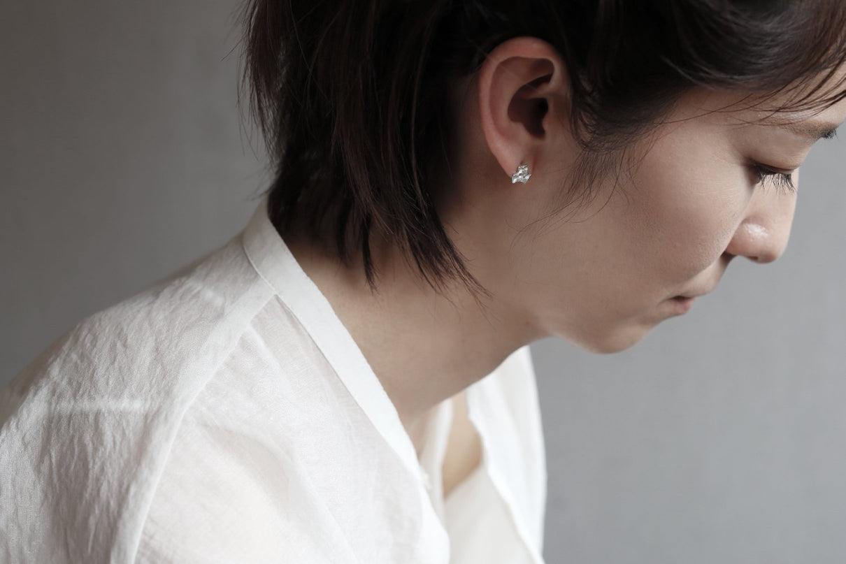 澄んで輝く結晶が、少しずつつくられてゆく様子をイメージしたAkirakaシリーズのスタッドピアス。ひしめき合うように咲き開いていくような結晶のランダムなスクエアのひとつひとつには繊細に手彫りされたテクスチャーが入っており、すっきりとしたフォルムながらも、複雑な表情と有機的な動きを感じさせるアイテムです。