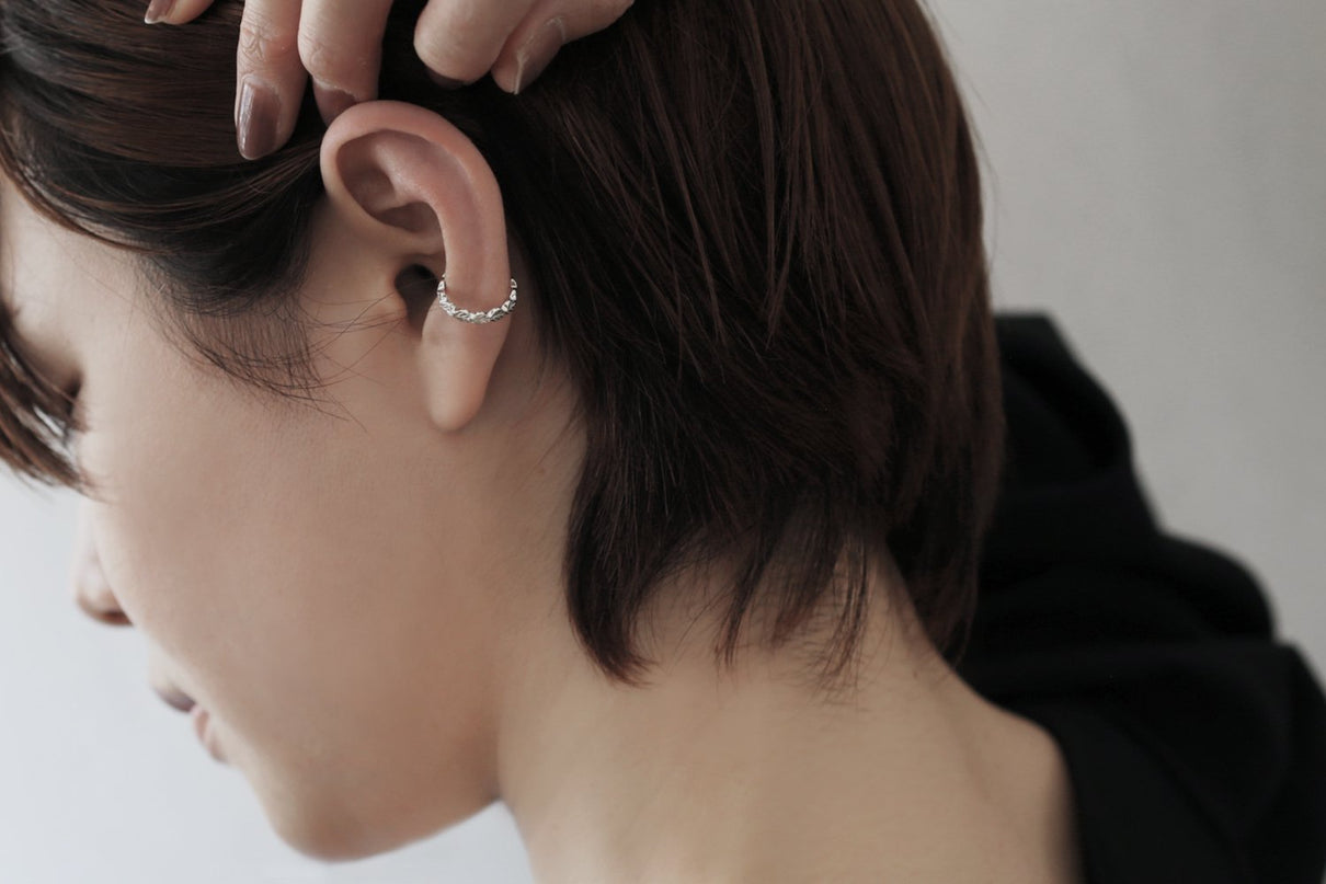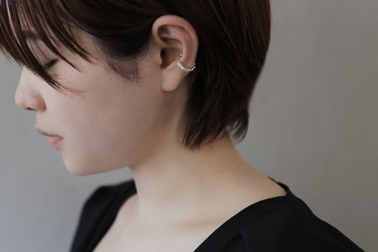 いくつも連なる葉っぱをモチーフに、1枚1枚わずかに異なる表情に遊び心を込めた"Leaf"シリーズのイヤーカフ。光を仰ぐ瑞々しい新緑の若葉のように艶めくやわらかな緩急の葉のフォルムが、さりげなくも愛らしく華やかに耳元を飾ります。