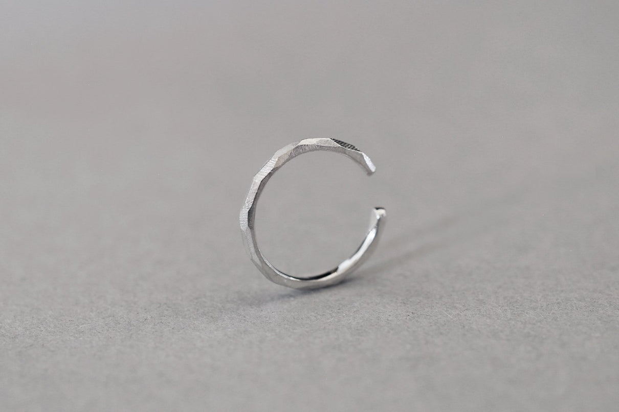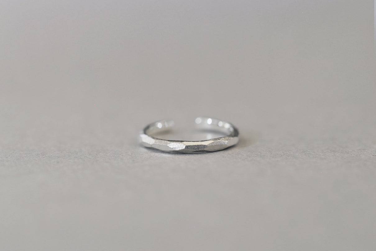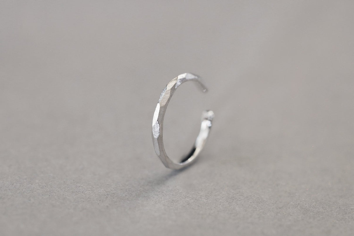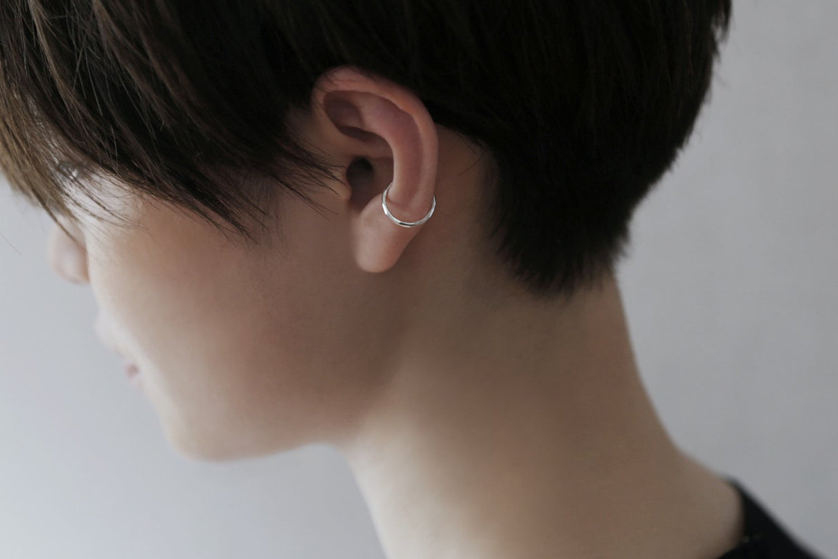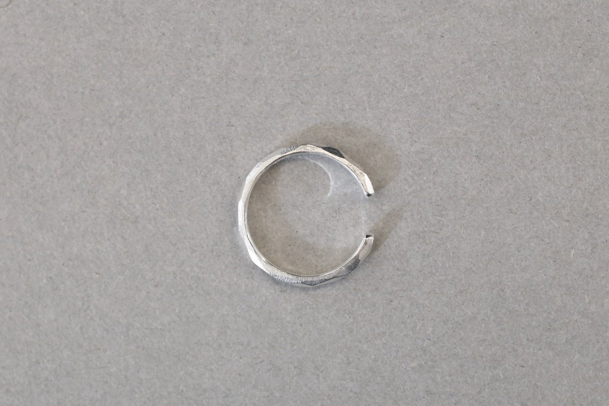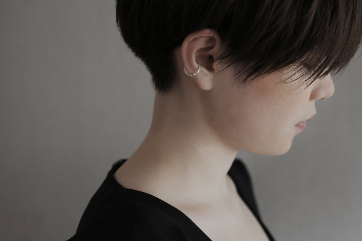 塊から荒く削り出したようなつや消し面の中に、ランダムに配された光沢面が入り混じる"Rough cut"シリーズのイヤーカフ。幾つもの面と面が織りなす表情が、手仕事の温かみを感じさせながらも洗練された美しさと凛とした印象を与えます。そのシンプルなフォルムは装いを選ばず、日々身に着けやすいアイテムです。