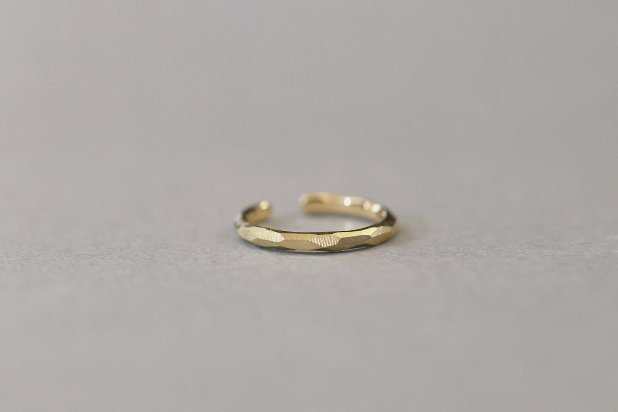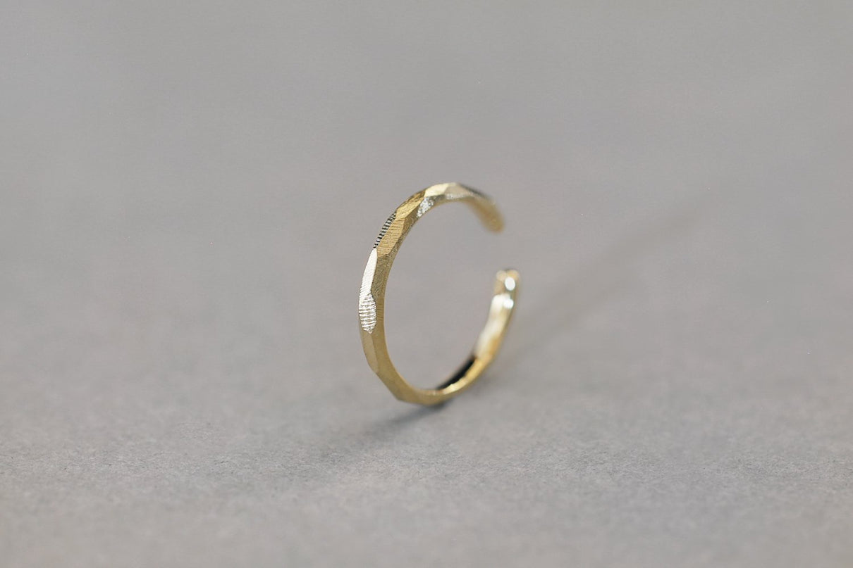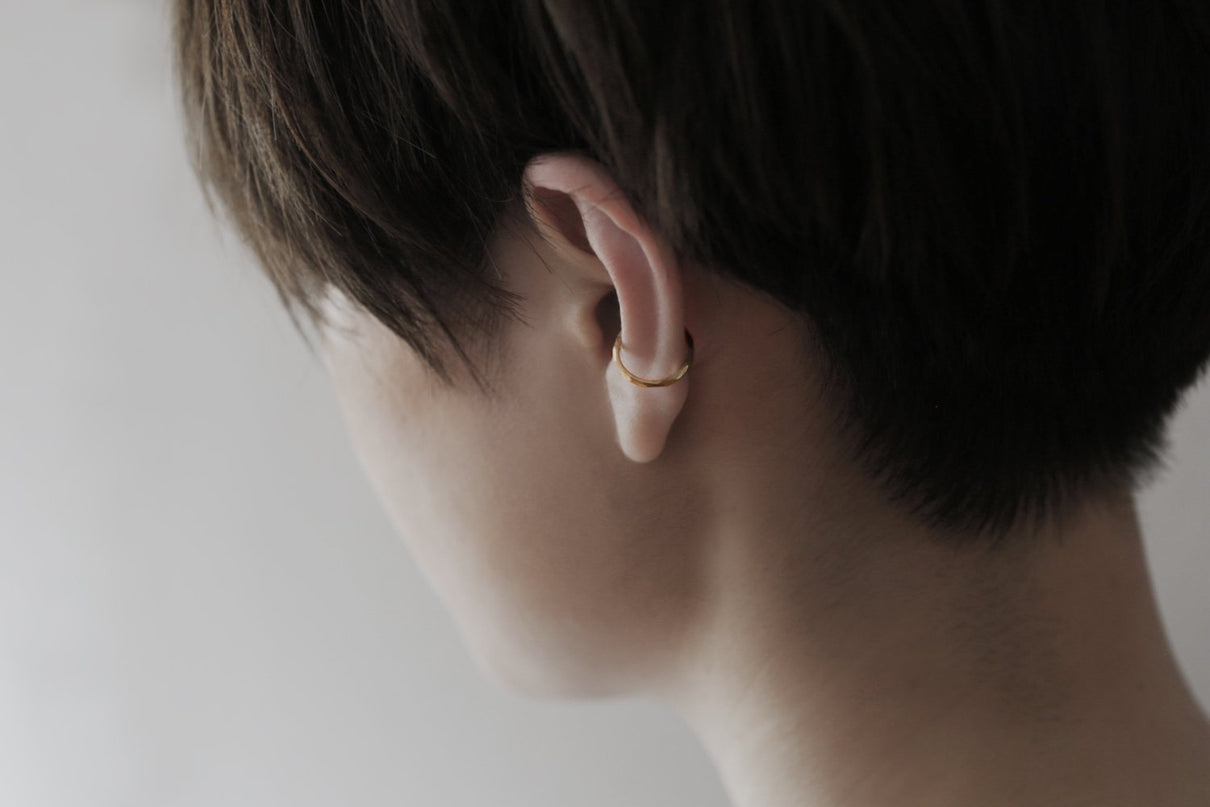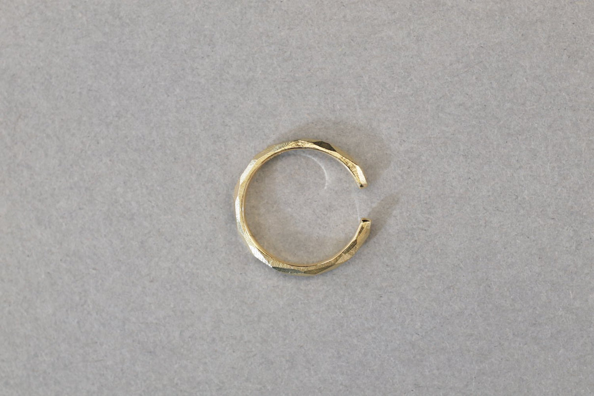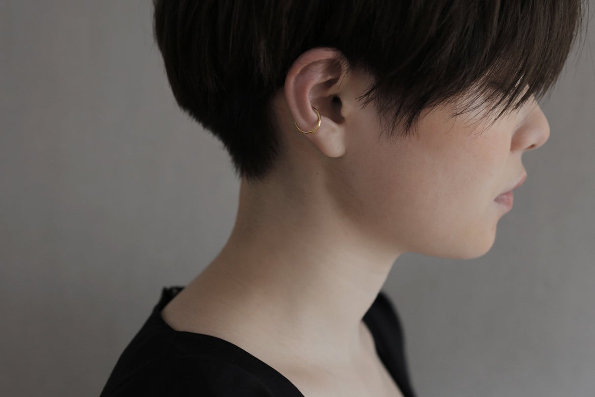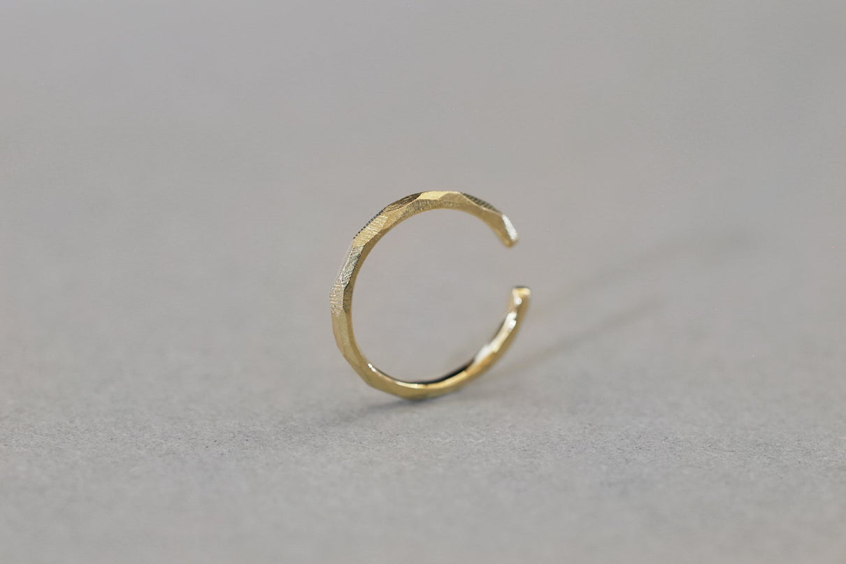 塊から荒く削り出したようなつや消し面の中に、ランダムに配された光沢面が入り混じる"Rough cut"シリーズのイヤーカフ。幾つもの面と面が織りなす表情が、手仕事の温かみを感じさせながらも洗練された美しさと凛とした印象を与えます。シンプルなフォルムは装いを選ばず、そのさりげないサイズ感は日々身に着けやすいアイテムです。