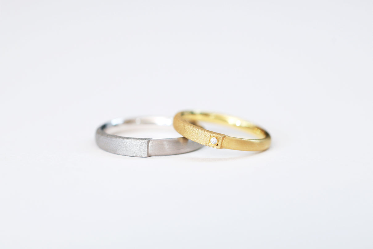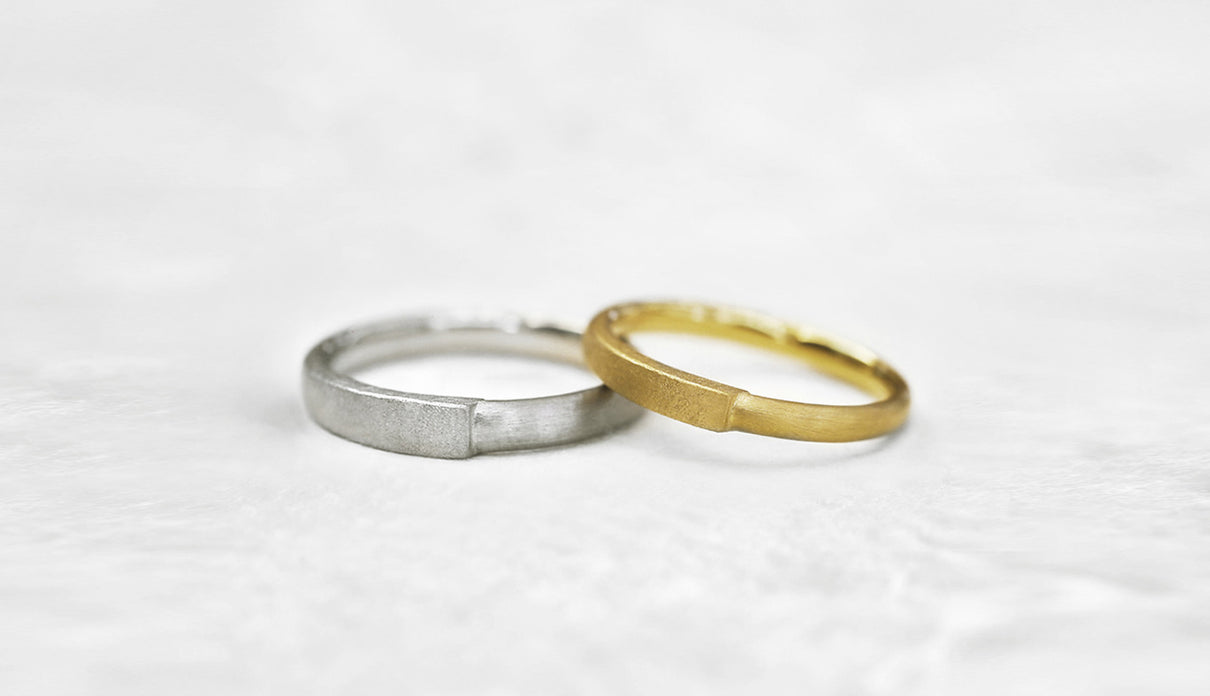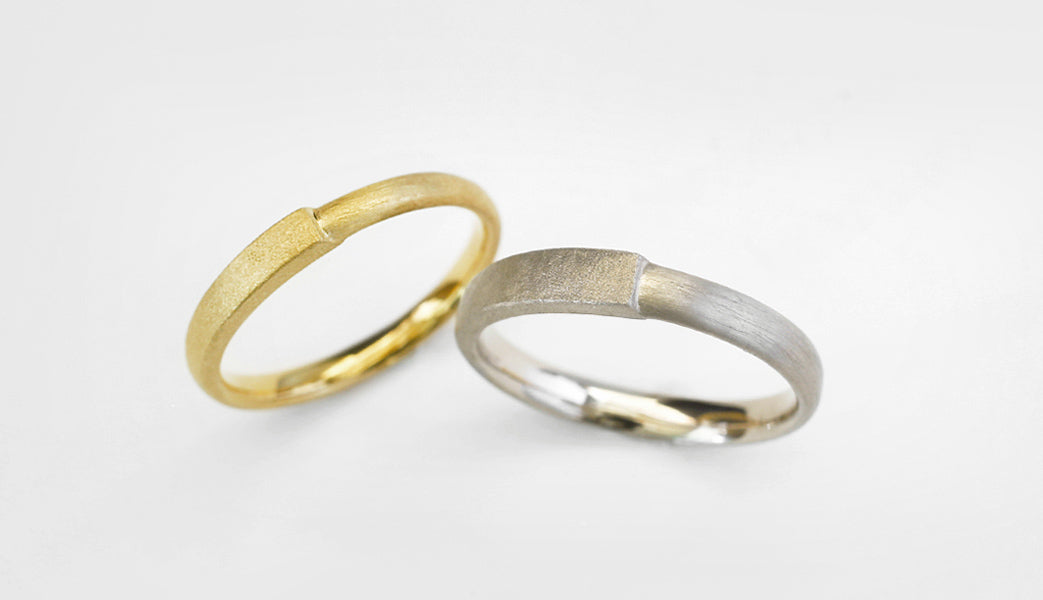 Alike ( アライク ) 笑い方、話し方、考え方。二人が醸し出す雰囲気。性格も生きてきた環境も異なる二人が、共に過ごした分だけ似てくる微笑ましい風景。丸と四角がグラデーションでつながり、やがて境目すらもなくなって一つになる姿を込めたマリッジリング ( 結婚指輪 ) 。