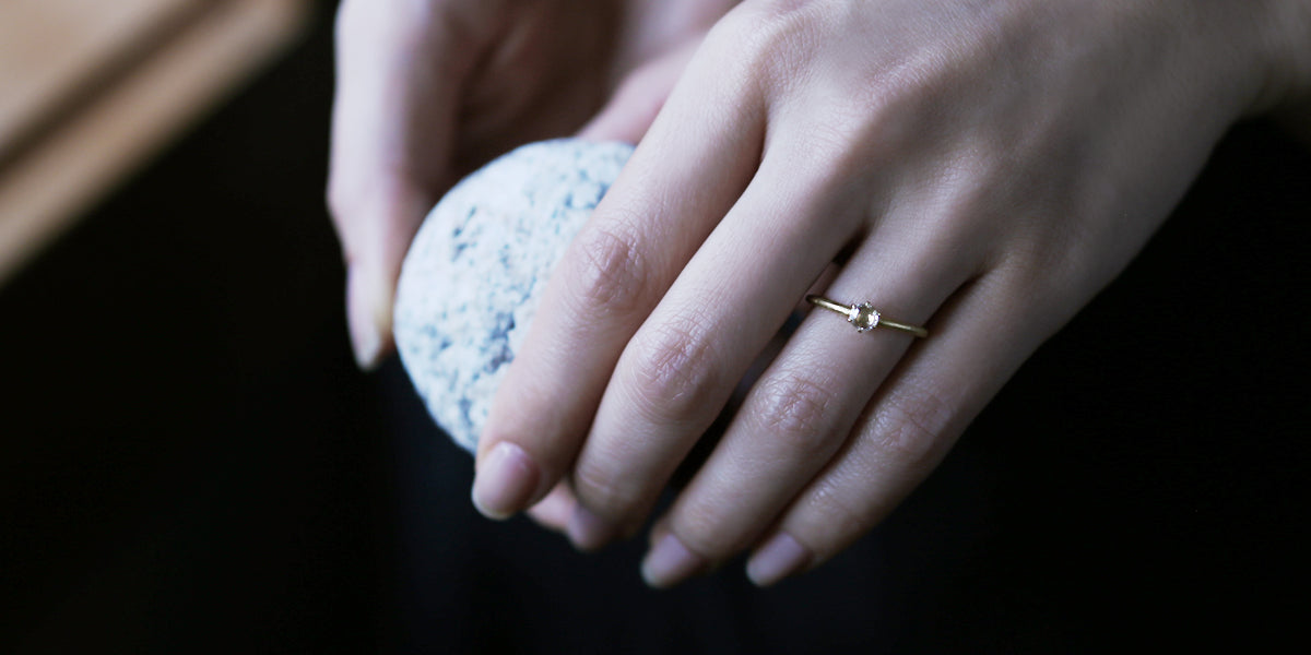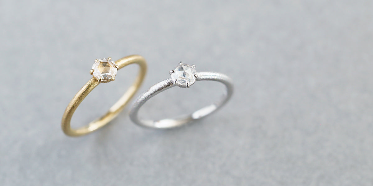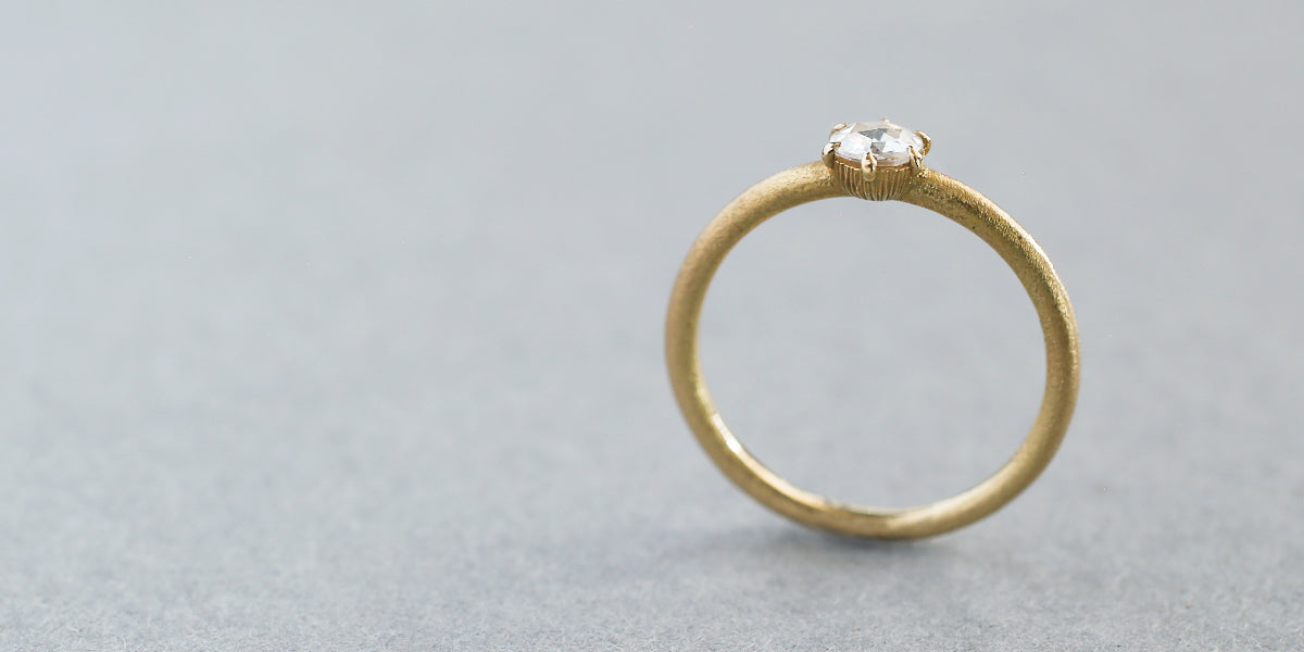 Norme solitaire -rose cut- ( ノルム ソリティア ローズカット )砂粒のような質感をしたマット仕立てのエンゲージリング ( 婚約指輪 ) 。台座の側面にさりげなく彫られた繊細な彫り模様に、手仕事ならではの奥行きを感じます。ローズカットダイヤモンドならではの雫のような潤みを帯びた透明感は、ささやかな艶めきを放ちます。