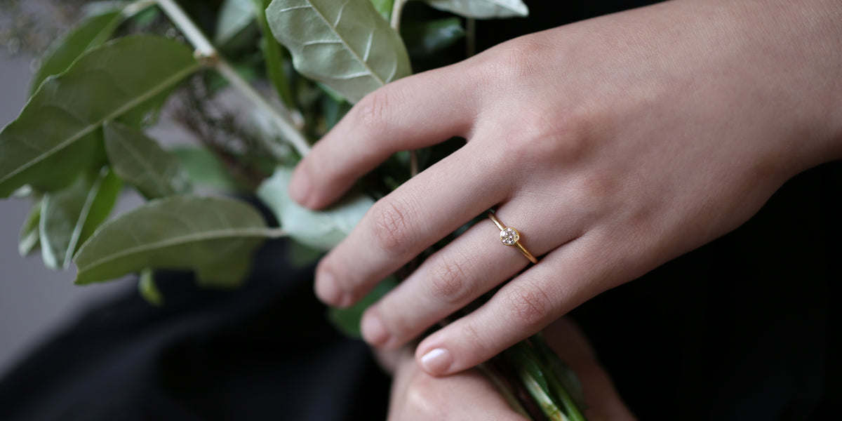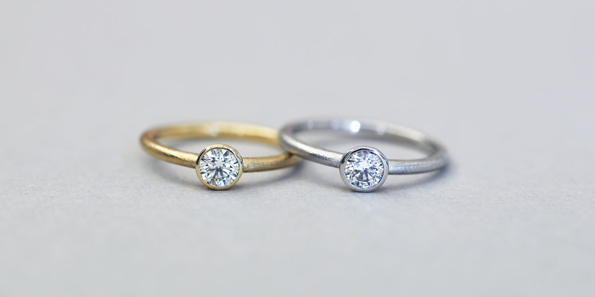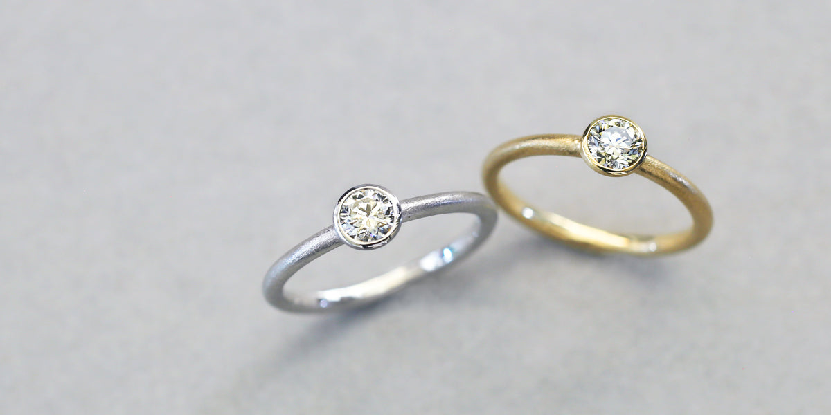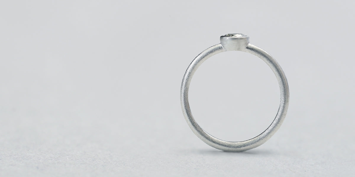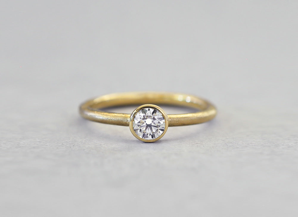 Norme bezel -brilliant cut- ( ノルム ベゼル ブリリアントカット )砂粒のような質感をしたマット仕立てのエンゲージリング ( 婚約指輪 ) 。従来の爪留めのデザインに、新たに加わったベゼル ( 覆輪留め ) タイプ。安定感のあるフォルムは強さをあわせ持ち、普遍的な美しさでダイヤモンドを際立たせながら日々のくらしにも自然と寄り添います。