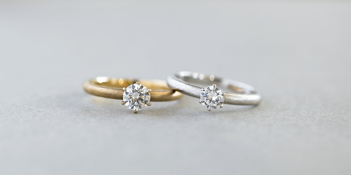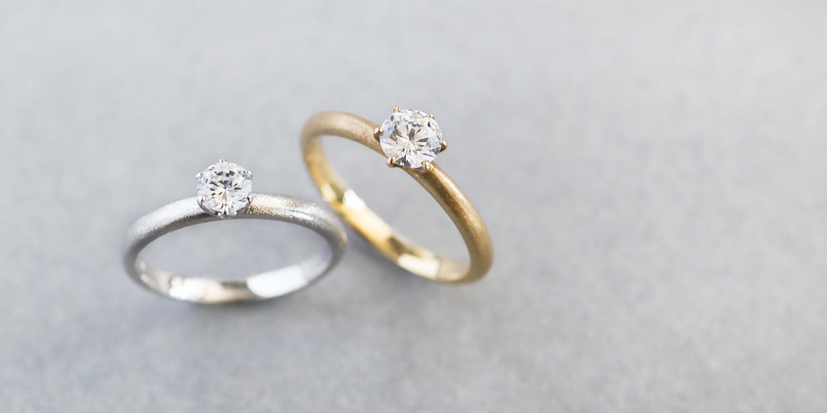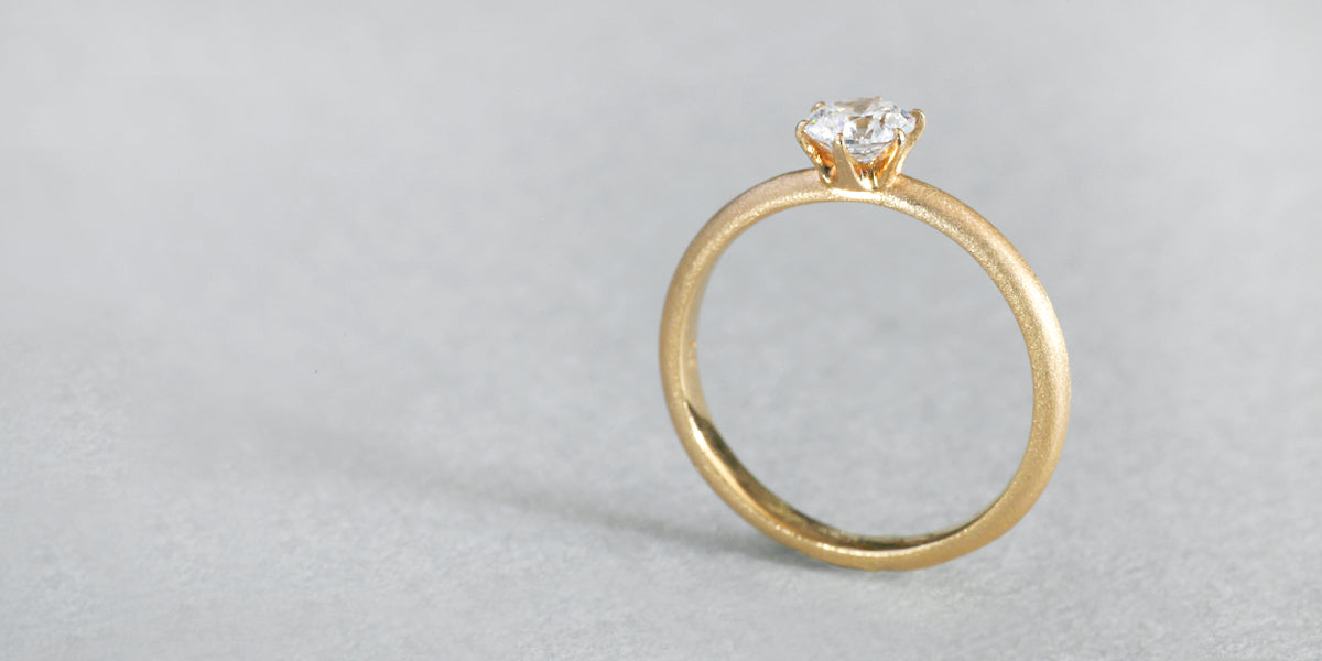 Norme solitaire -brilliant cut- ( ノルム ソリティア ブリリアントカット ) 砂粒のような質感をしたマット仕立てのエンゲージリング ( 婚約指輪 ) 。無駄を削ぎ落としたシンプルなフォルムは普遍的な美しさでダイヤモンドを際立たせます。繊細な爪留めは光を透過し、ダイヤモンドの美しい輝きを最大限に引き出します。