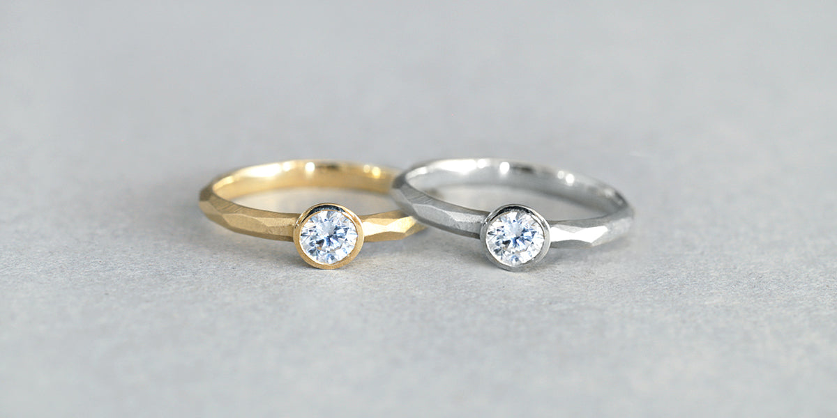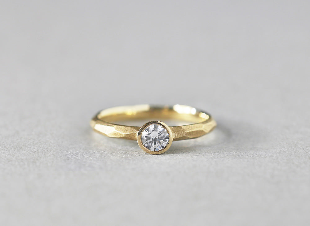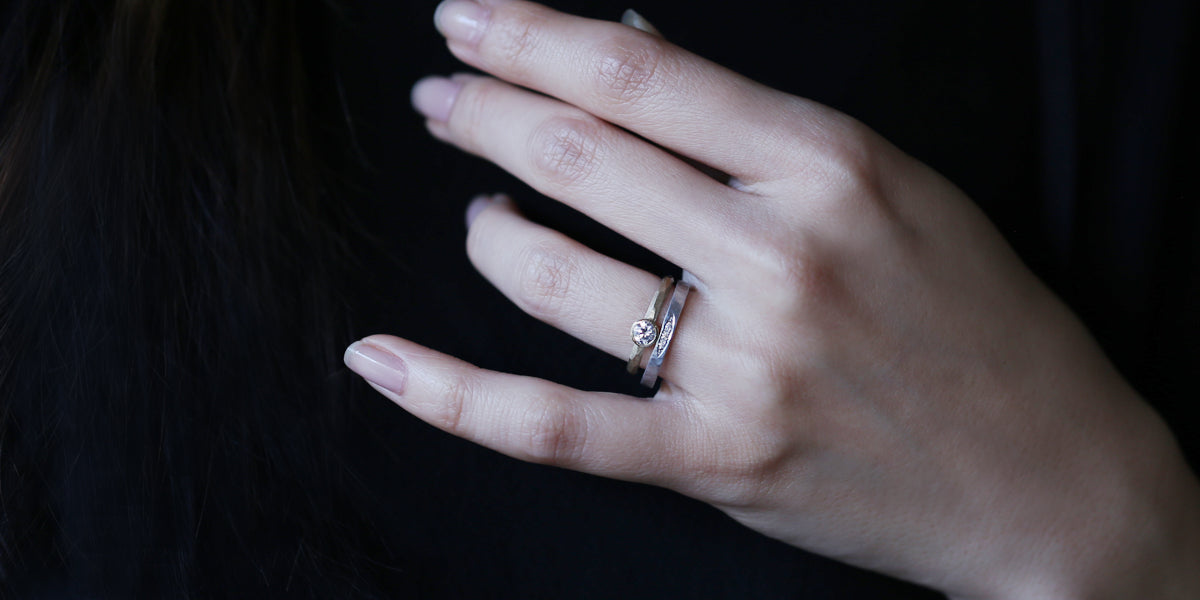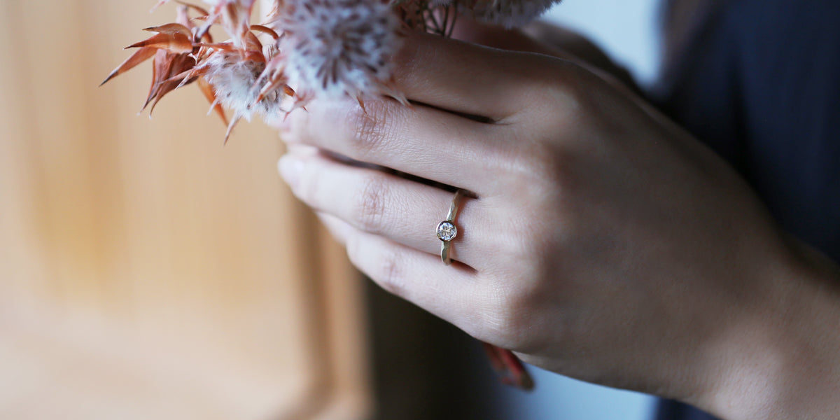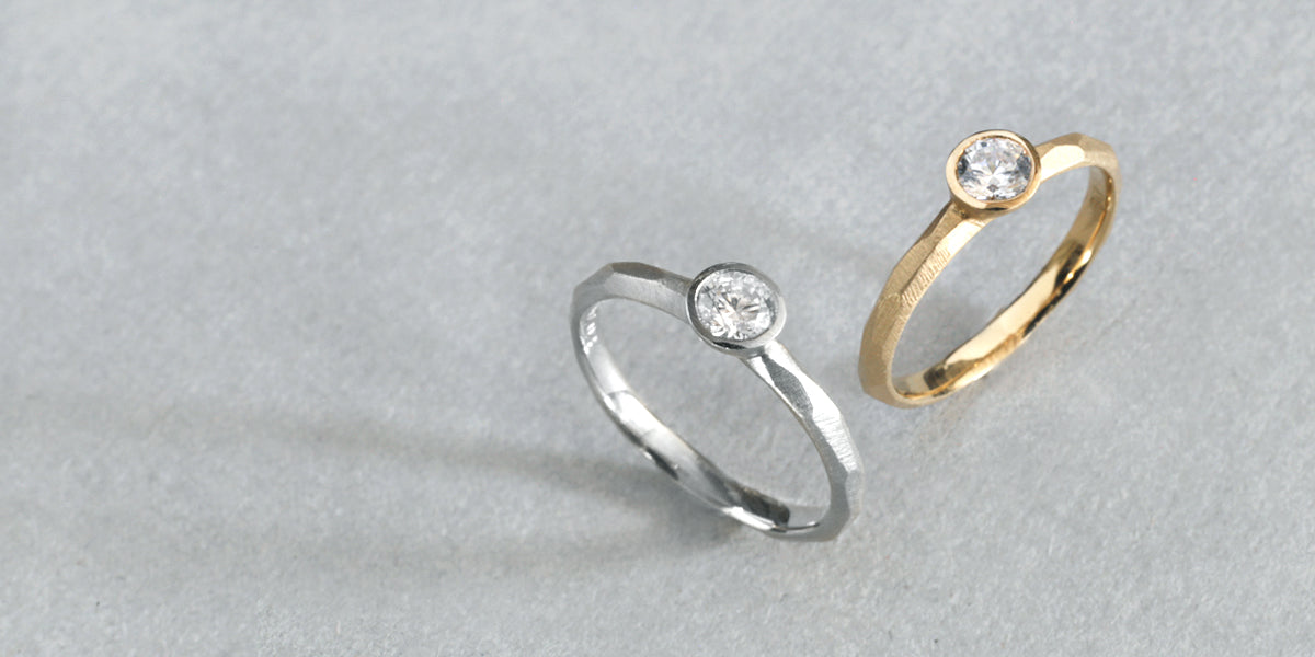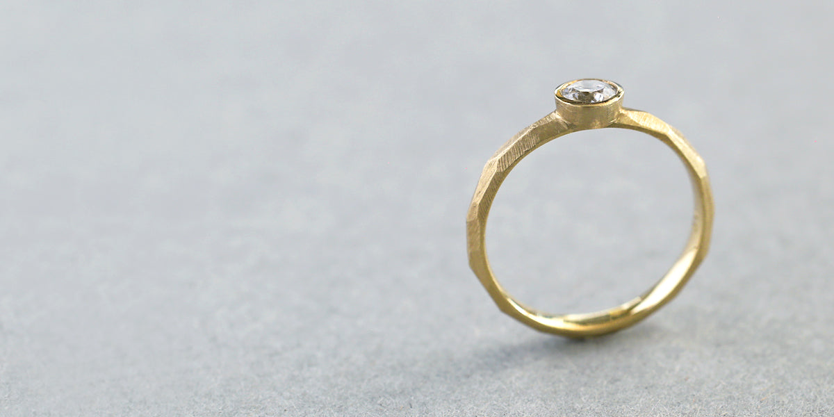 Rough cut bezel ( ラフカット ベゼル )塊から荒く削り出したような、幾つもの面が織りなす表情が特徴的なエンゲージリング ( 婚約指輪 ) 。直線的で潔いストレートなデザインはどこかプリミティブな印象を放ちます。安定感のあるフォルムは強さをあわせ持ち、日々のくらしにも自然と寄り添います。