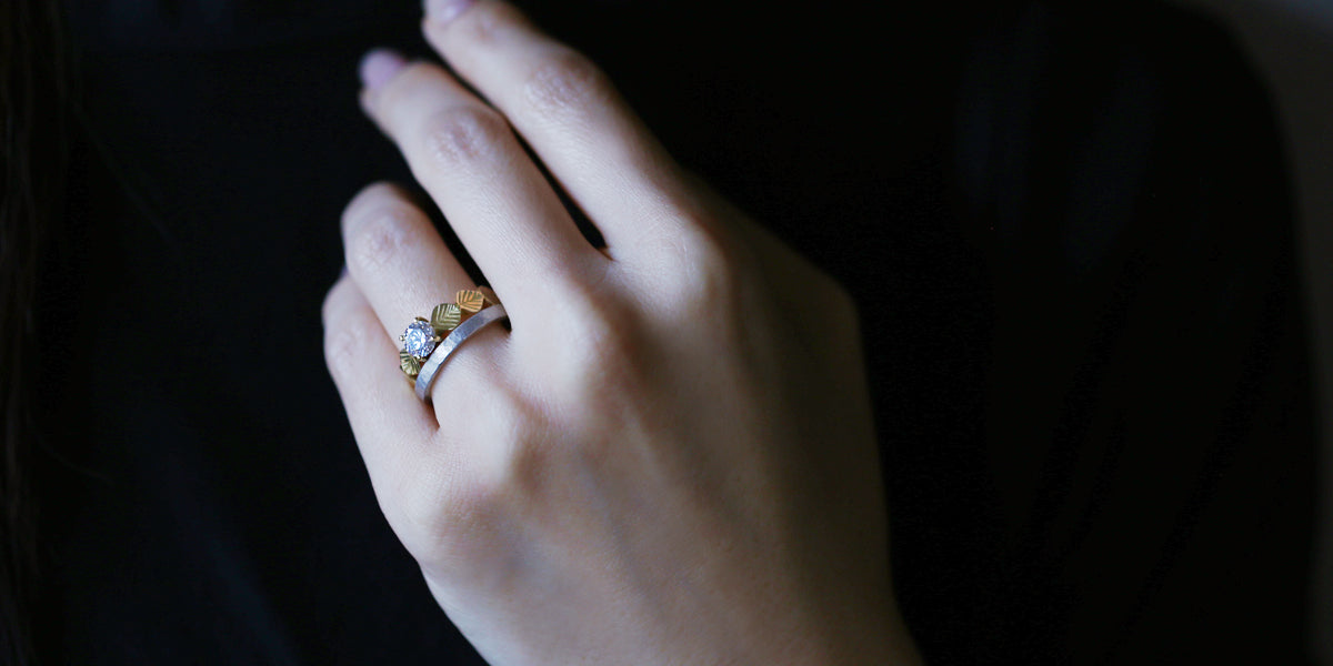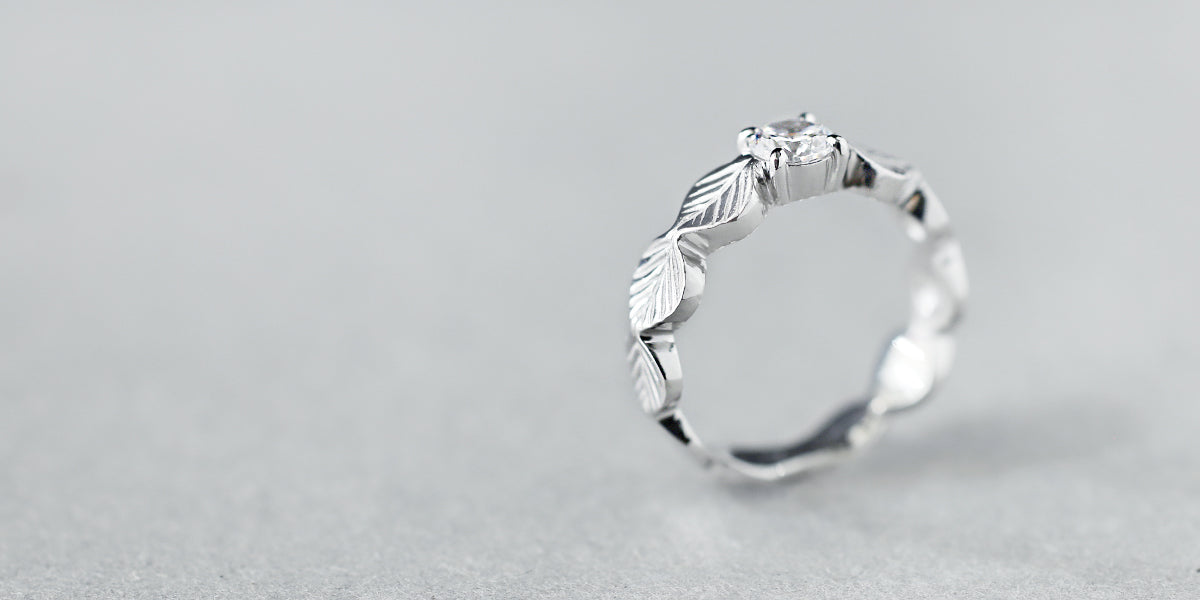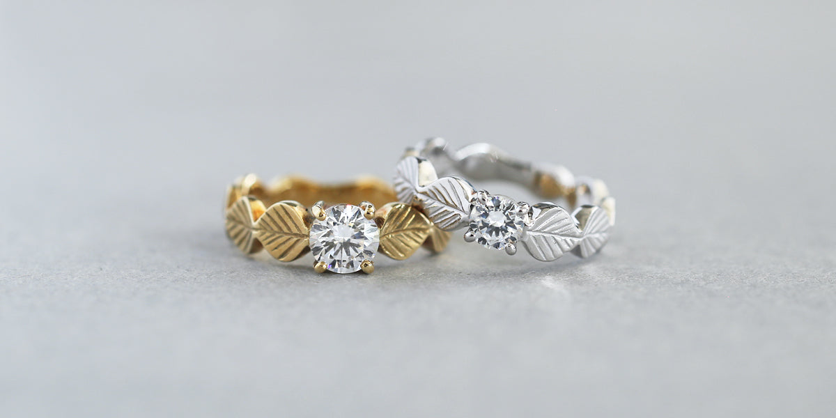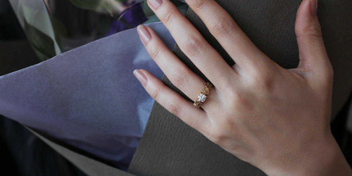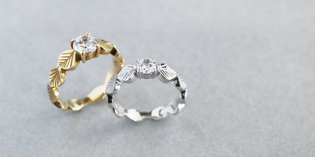 Leaf ( リーフ )光を仰ぐ葉っぱをモチーフにしたエンゲージリング ( 婚約指輪 ) 。1枚1枚わずかに異なる、やわらかで個性引き立つフォルムが存在感のあるダイヤモンドに映えます。