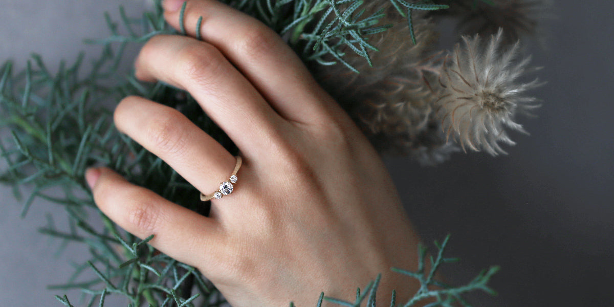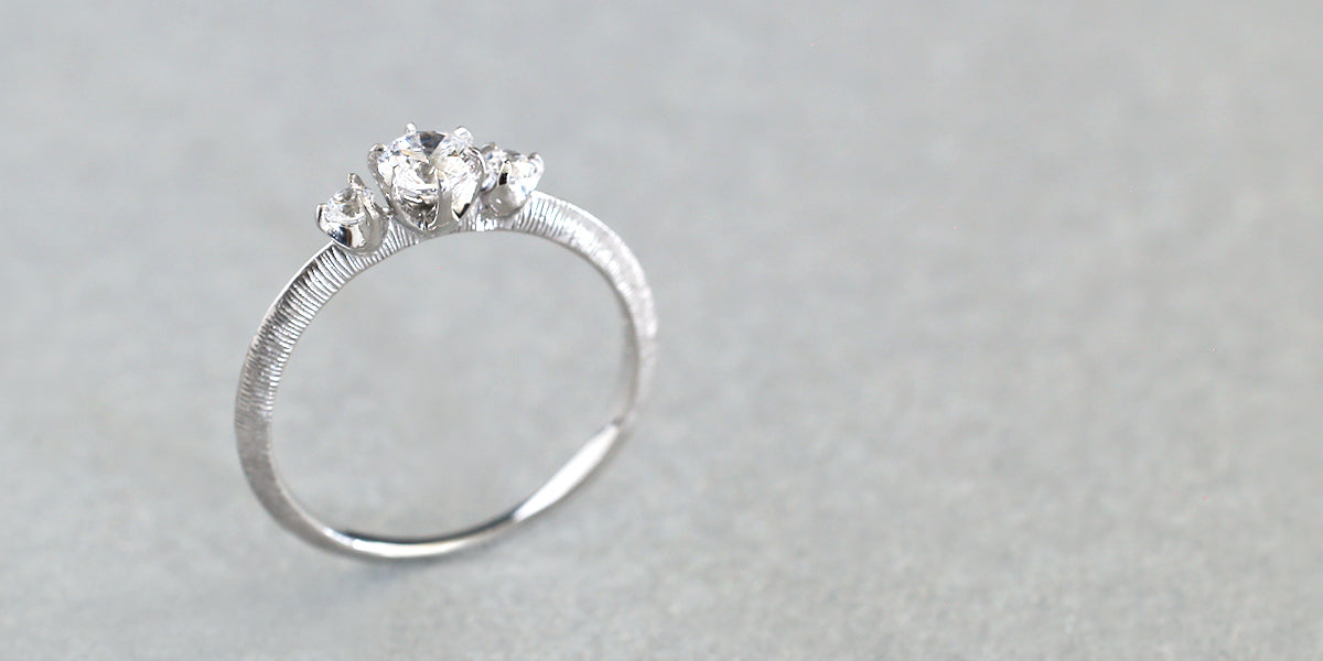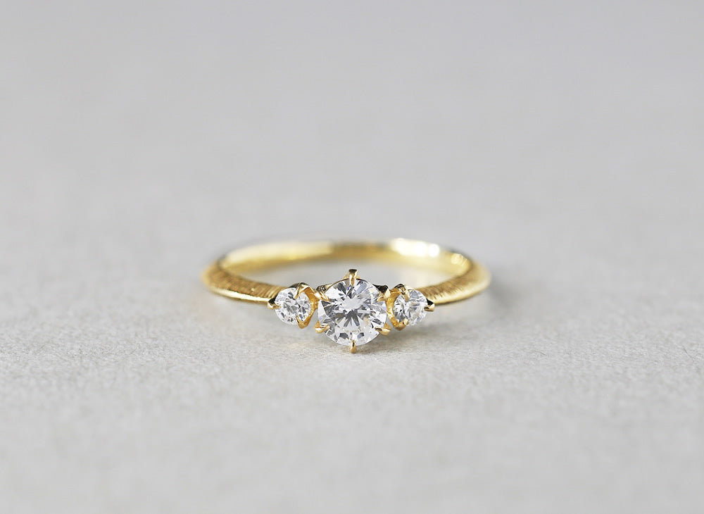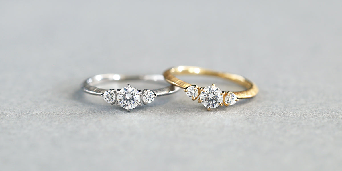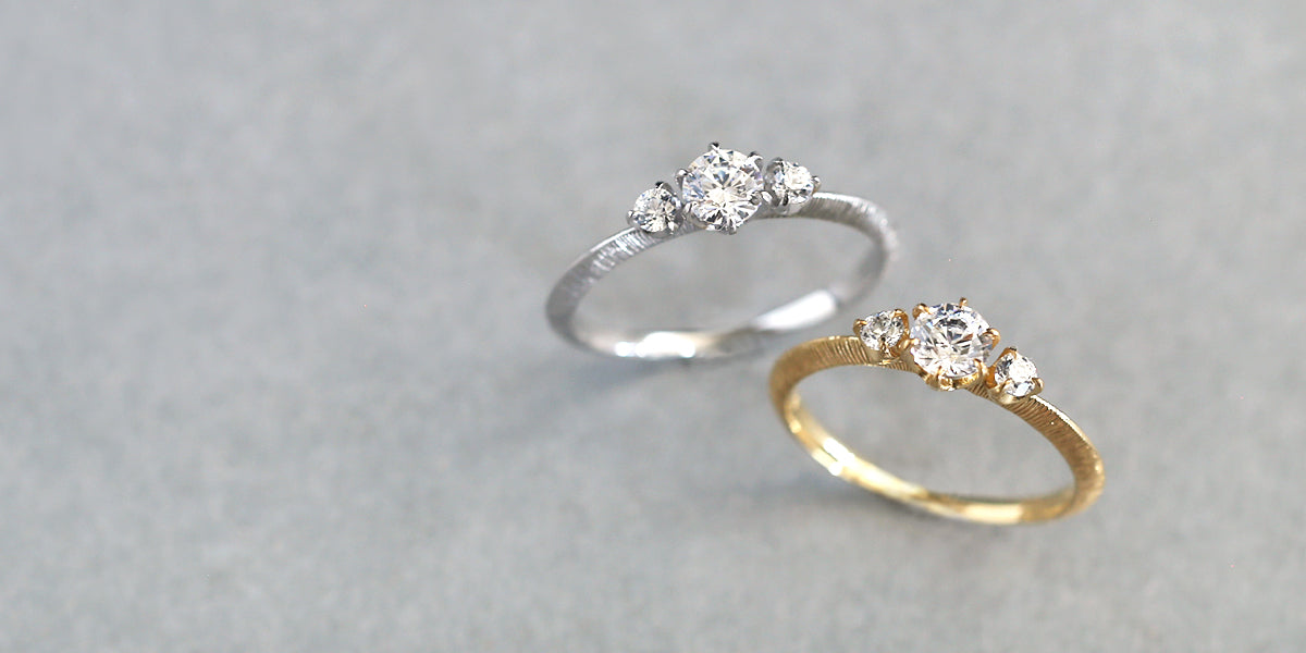Fil ( フィル )凛としたフォルムのリングに3石のラウンドブリリアントカットダイヤモンドが豊かに輝くエンゲージリング ( 婚約指輪 ) 。お二人の縁を結ぶ"糸"をモチーフとした手彫りの繊細で精密な表現が、すっきりとしたリングに密度を与えています。両脇の小さな石はシックなブラウンダイヤモンドに変更することが可能です。